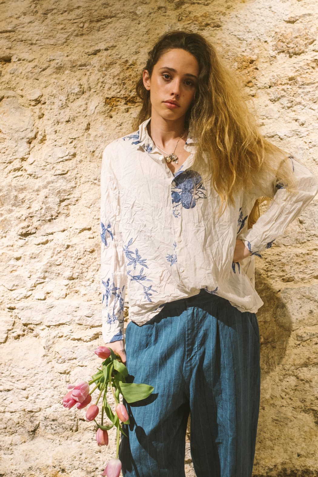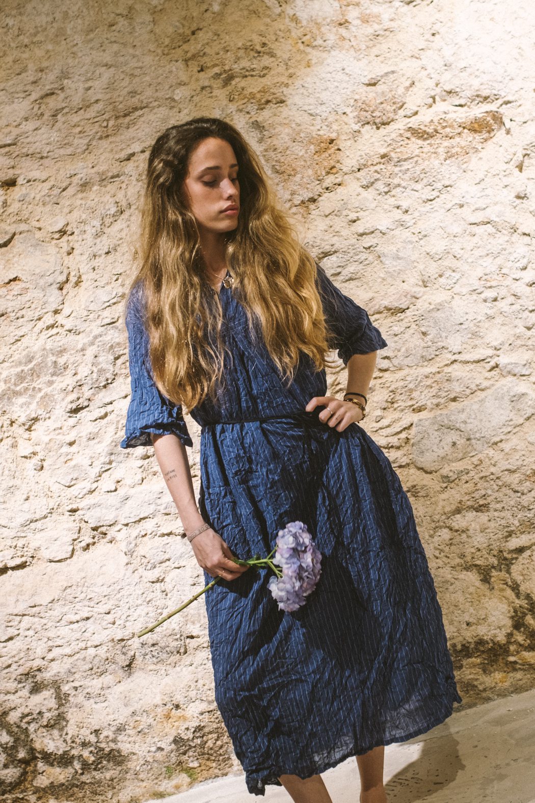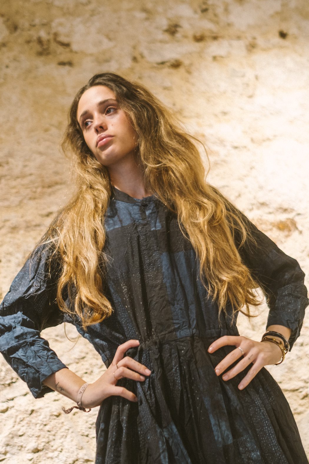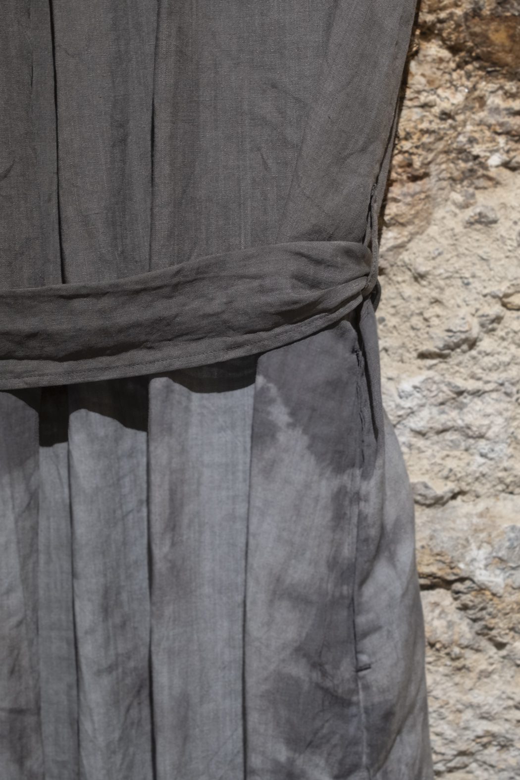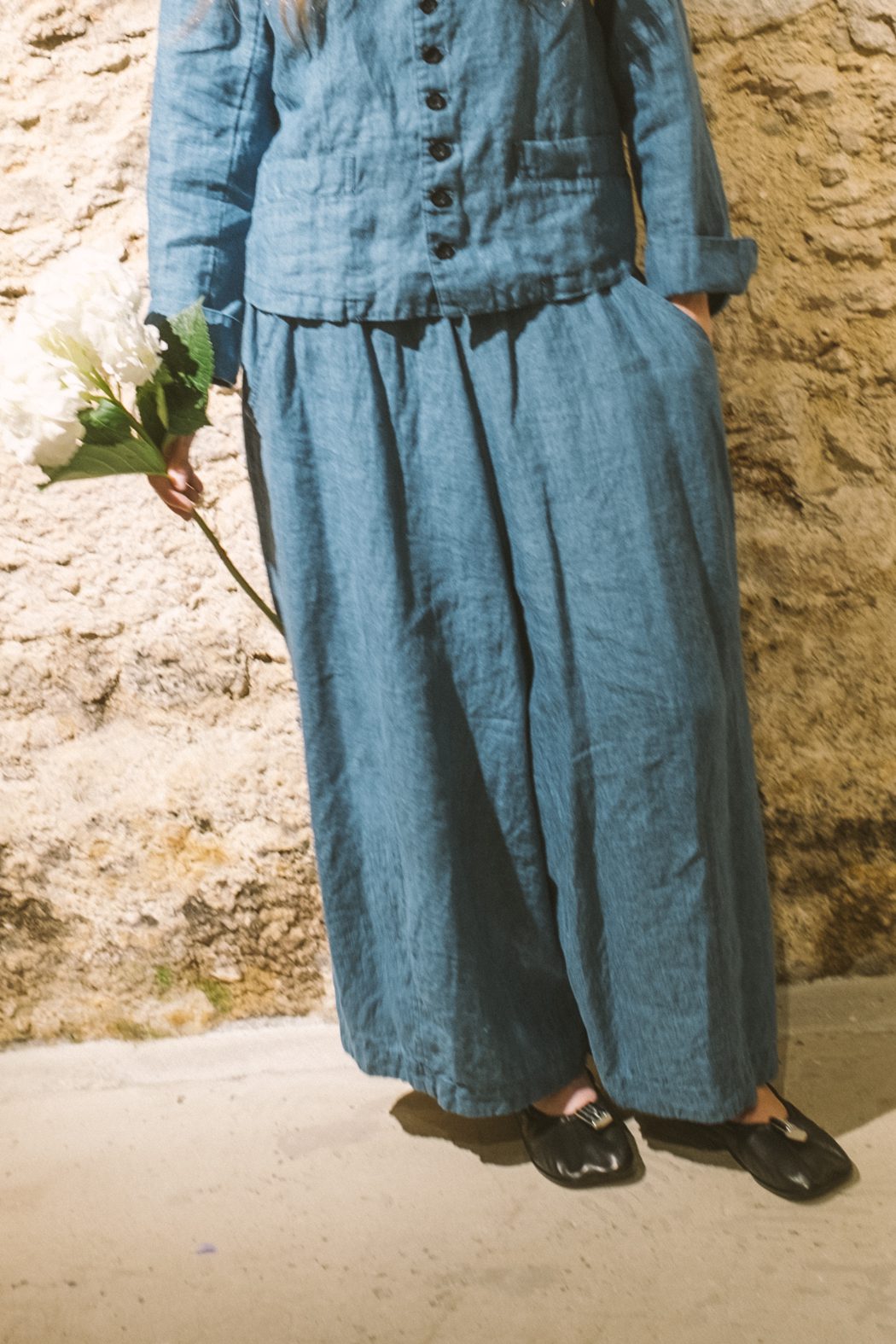 Ramio sedoso y tencel se entregan al yanagi shibori —degradados de sauce que ondulan como ríos índigo—; lino chambray arruga su alma libre; algodón tsugihagi parchea sueños boho en bloques crudos. Cada prenda, teñida a mano en Japón, envejece con gracia, moldeándose al cuerpo como un recuerdo querido