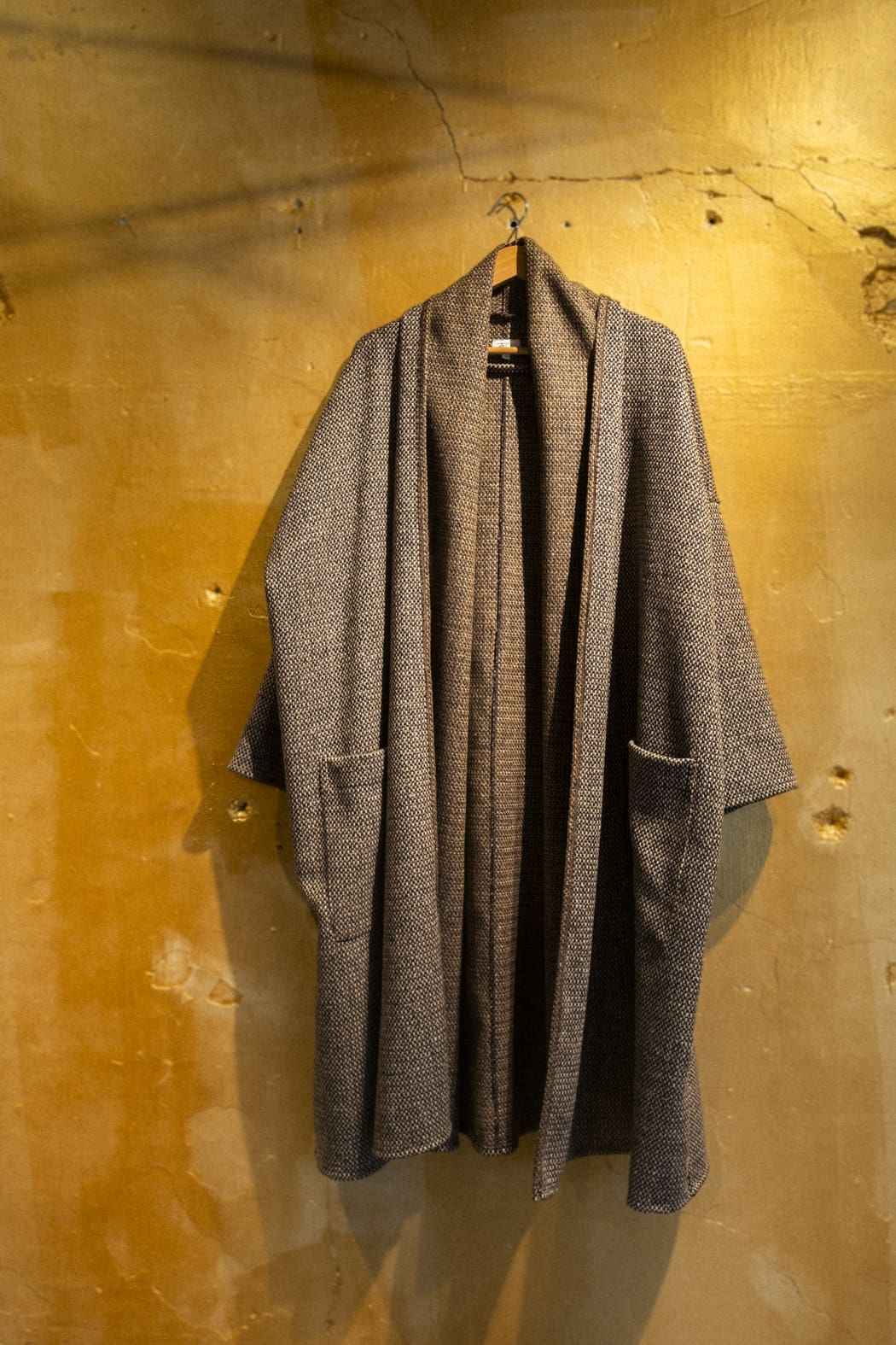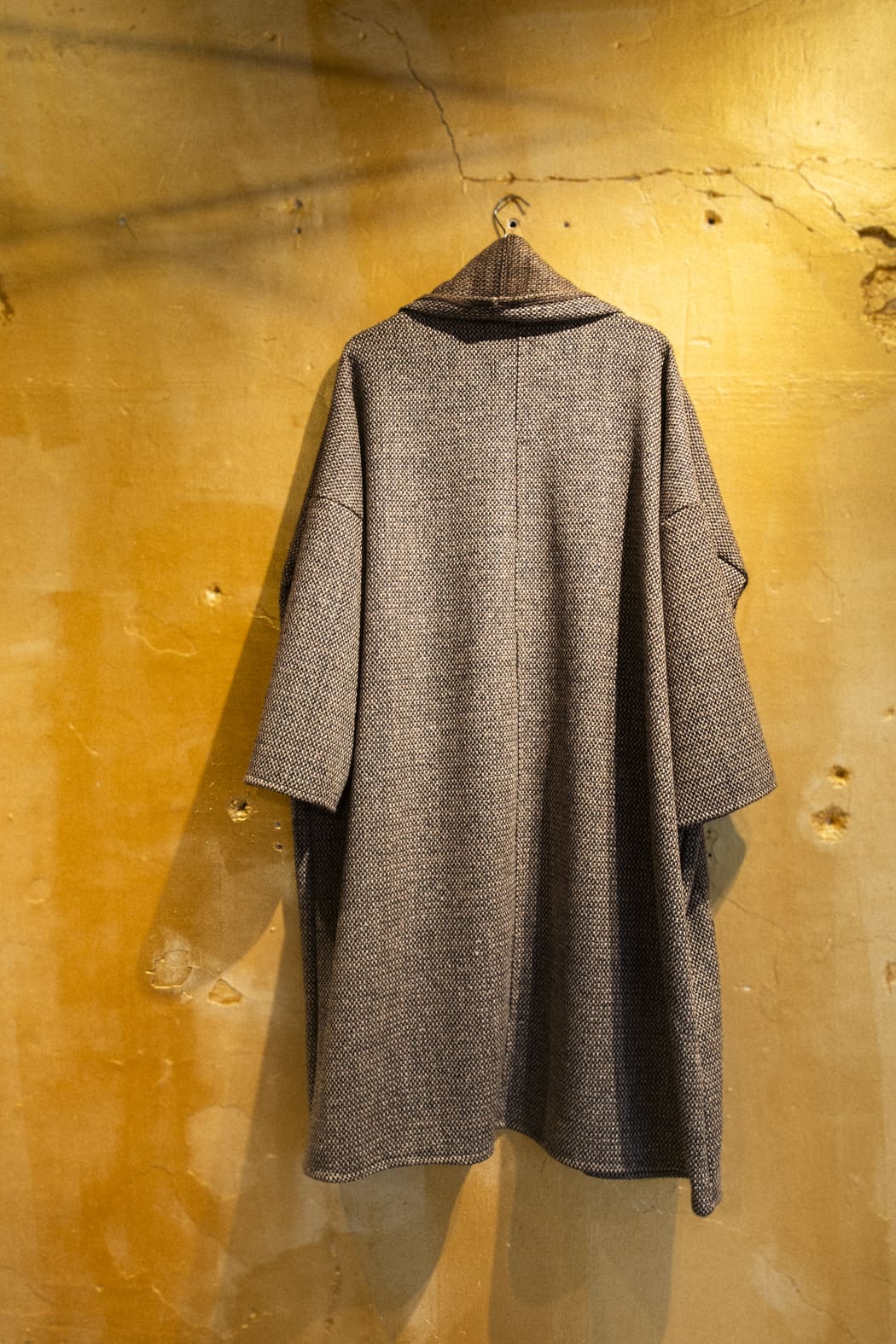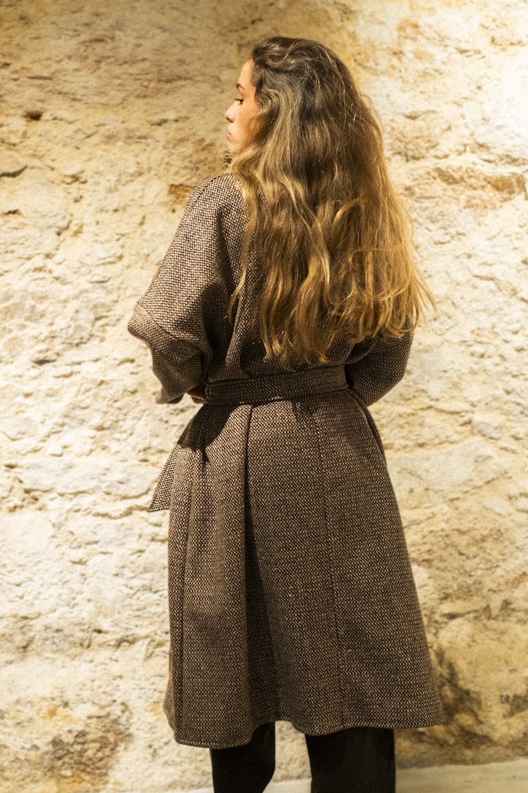 Abrigo oversize de lana mezclada con un diseño envolvente y atemporal. Destaca por su amplio cuello chal y su silueta fluida que se adapta a diferentes estilos. Incluye cinturón a juego para ceñir la cintura y dos bolsillos de parche delanteros que aportan comodidad y funcionalidad.