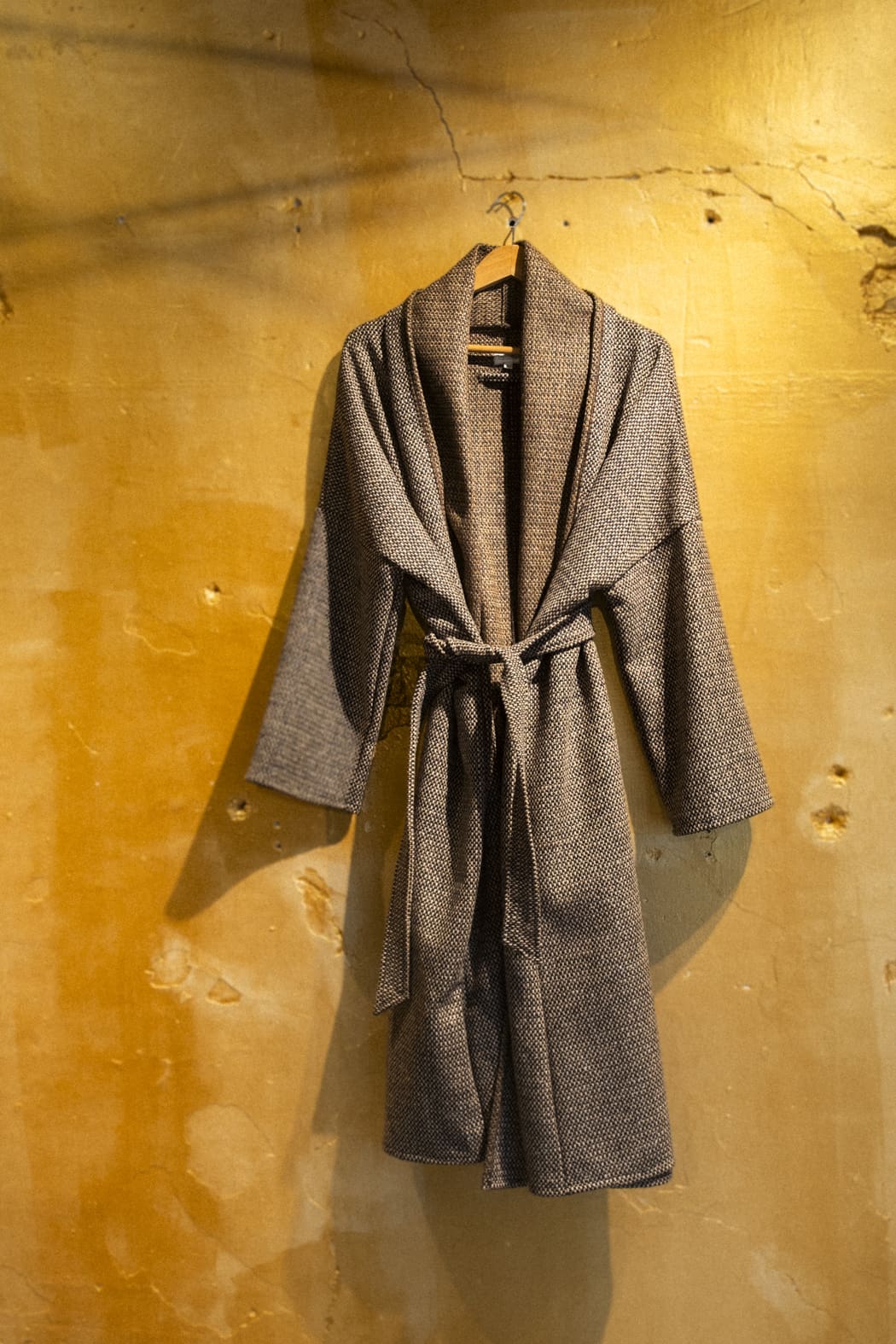 Detalles: corte oversize, cuello chal, bolsillos de parche, cinturón a juego