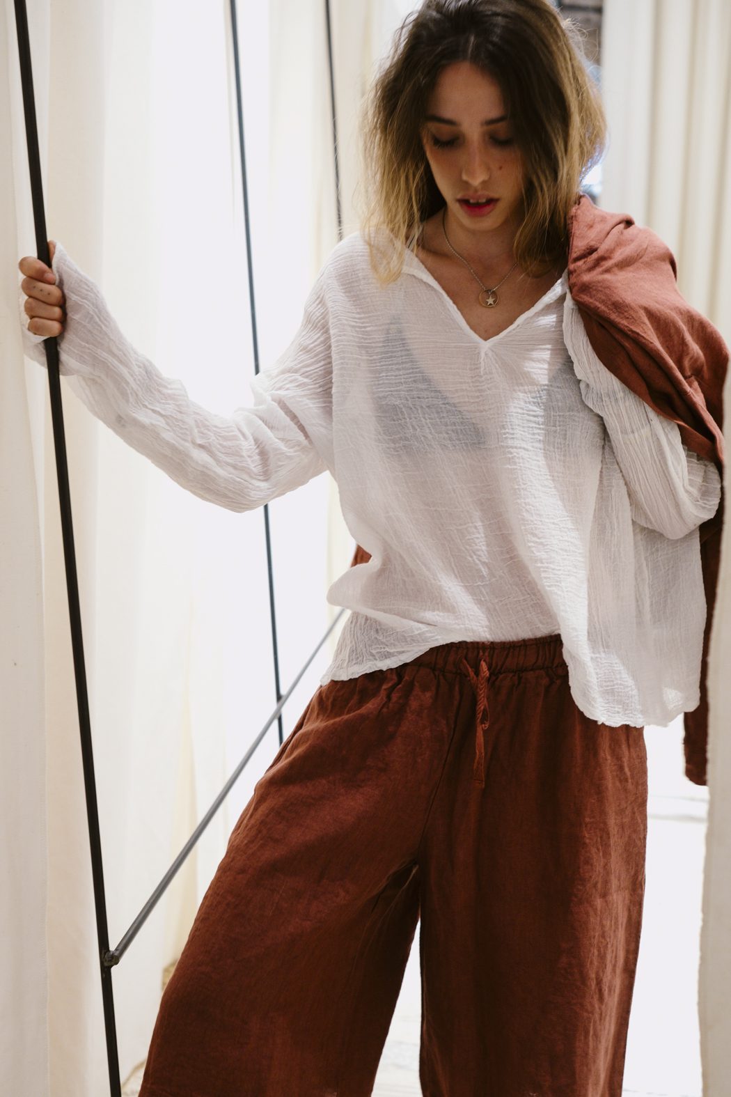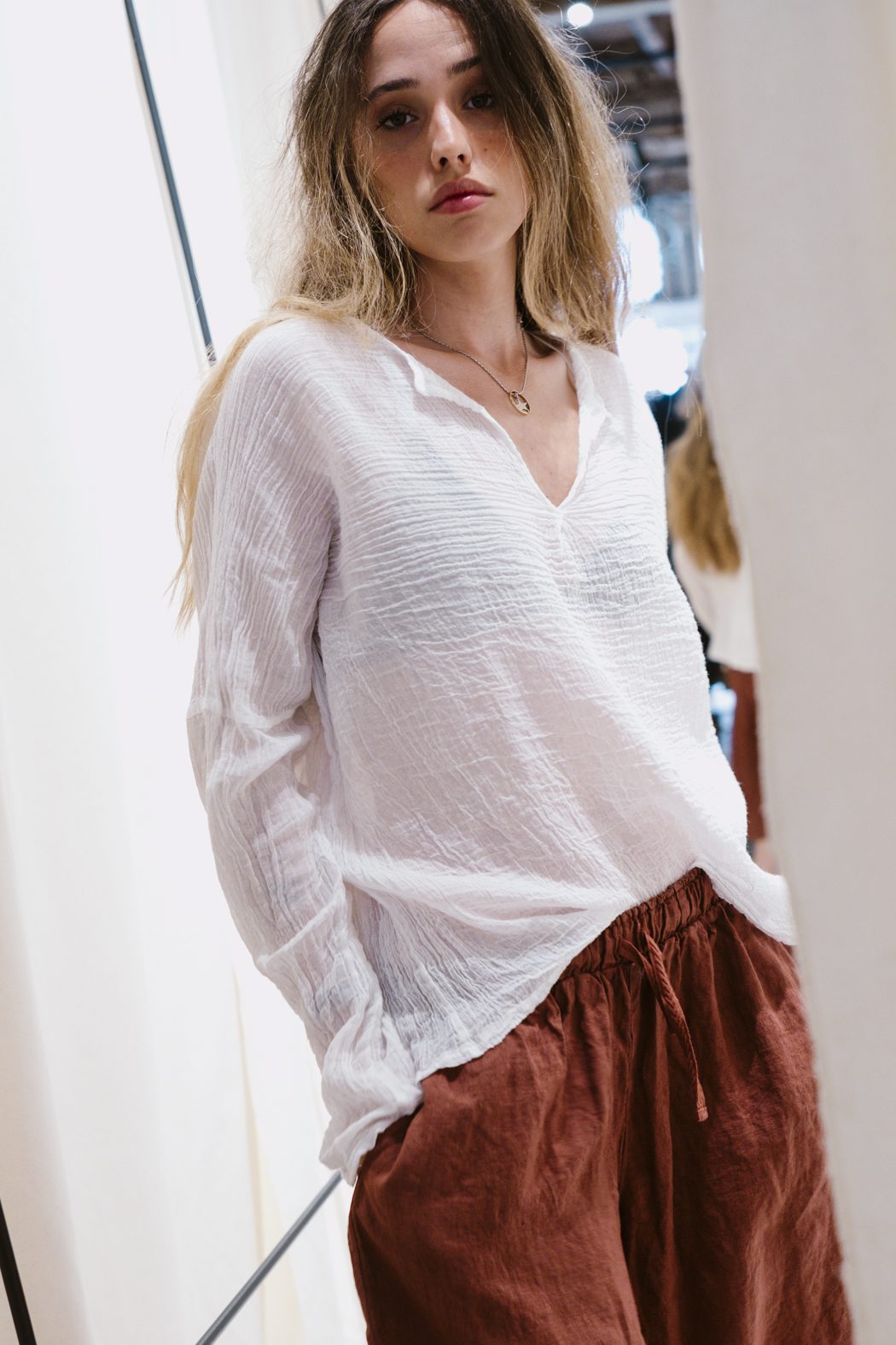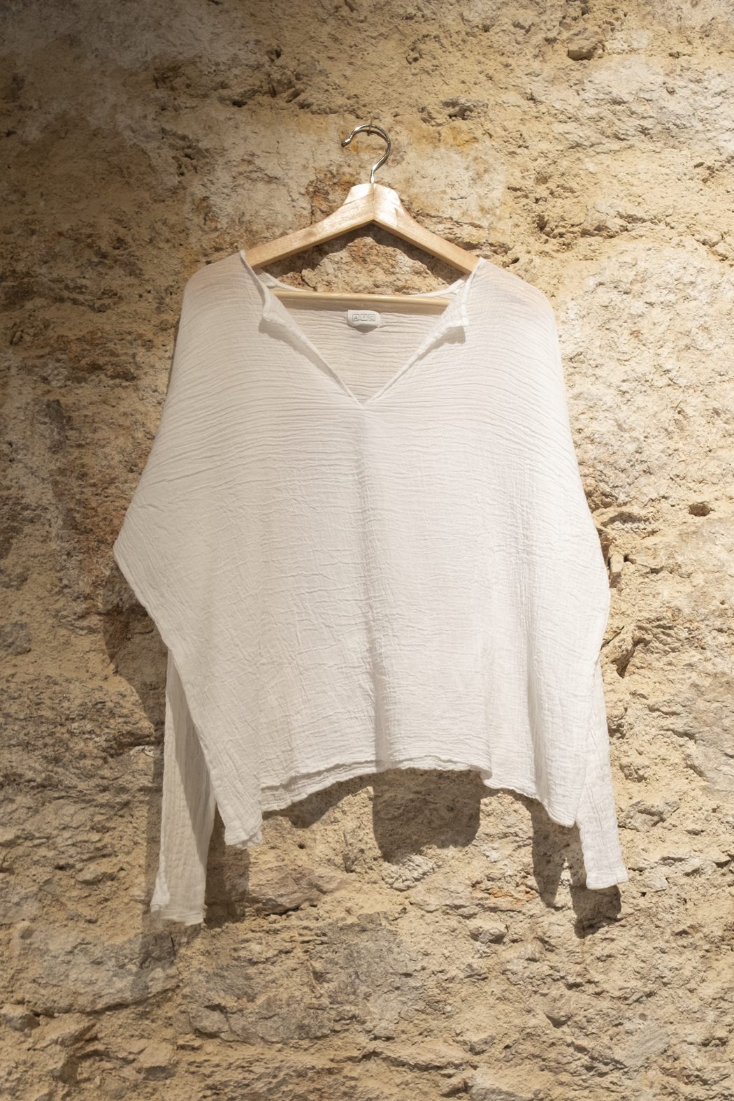 La camiseta AFC de manga larga está confeccionada en 100% algodón y realizada en gasa de algodón, un tejido ligero y con textura que aporta comodidad y un acabado naturalmente arrugado. Su escote en V y su silueta relajada la convierten en una prenda fácil de llevar, ideal para looks desenfadados pero cuidados.