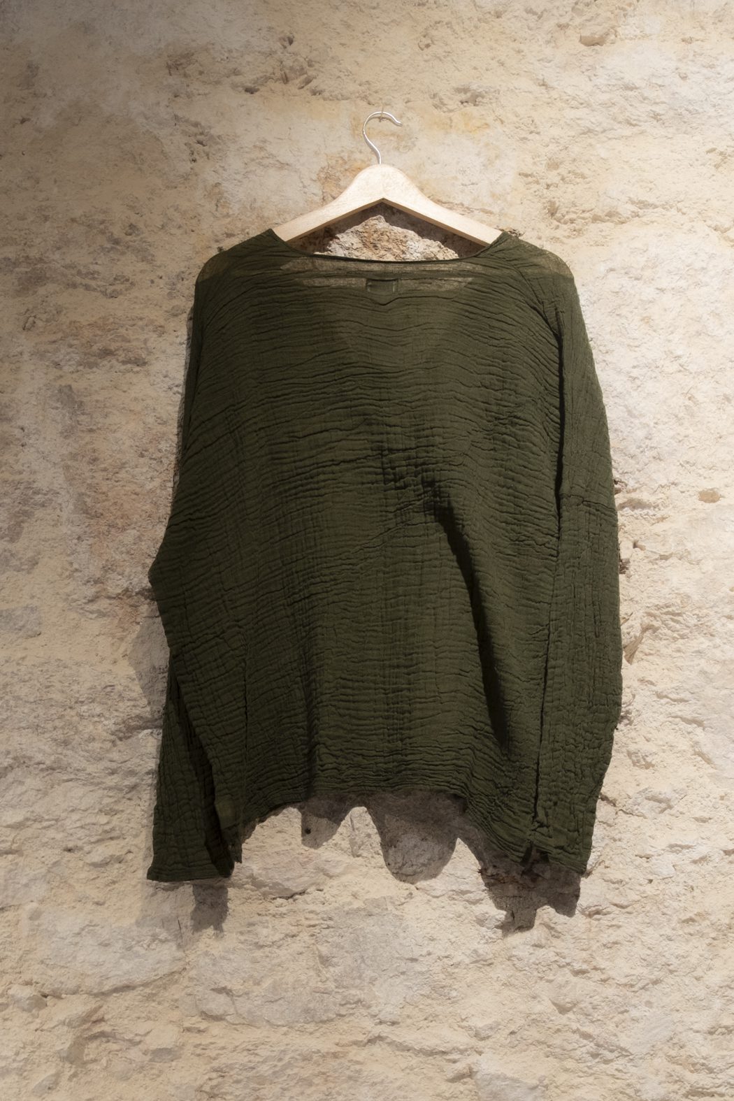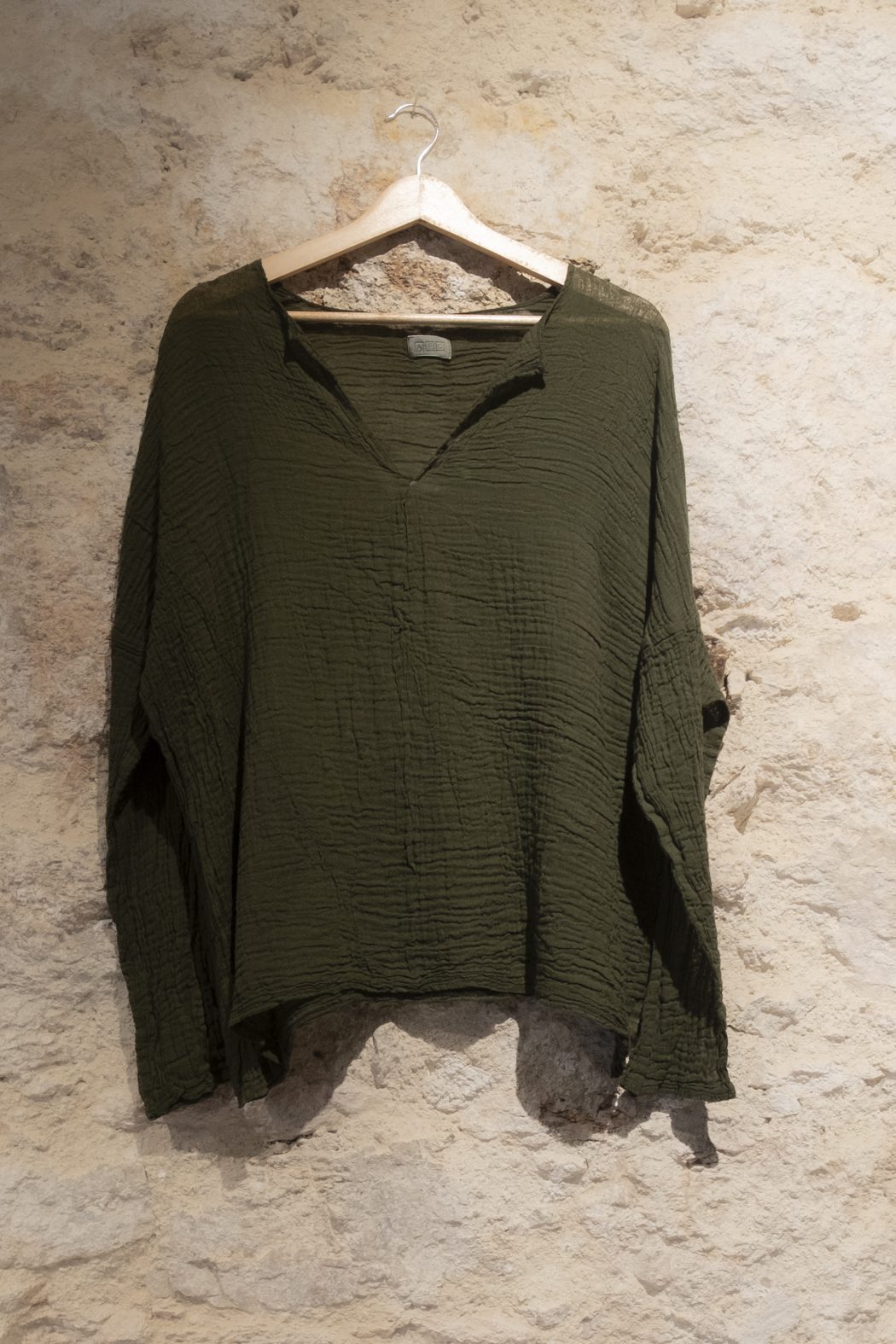 La camiseta AFC de manga larga está confeccionada en 100% algodón y realizada en gasa de algodón, un tejido ligero y con textura que aporta comodidad y un acabado naturalmente arrugado. Su escote en V y su silueta relajada la convierten en una prenda fácil de llevar, ideal para looks desenfadados pero cuidados.