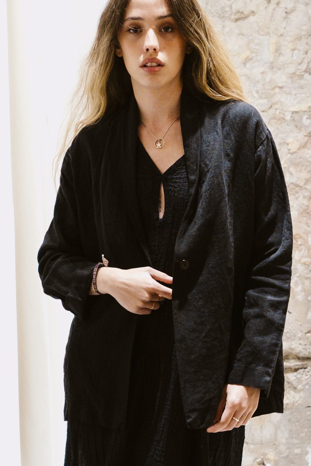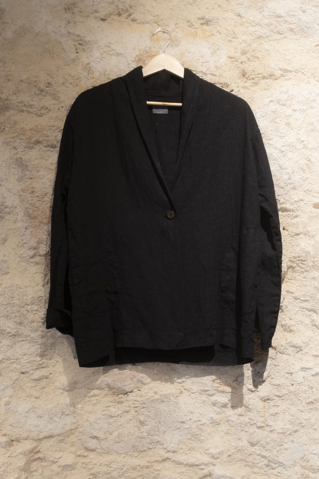 Chaqueta de Ateliers Français de Confection, confeccionada en lino, con pequeño cuello chal y cierre frontal de un botón. Sus bolsillos laterales aportan funcionalidad sin perder la sencillez de una silueta relajada y atemporal. Una prenda ligera y versátil, pensada para completar el conjunto con naturalidad.