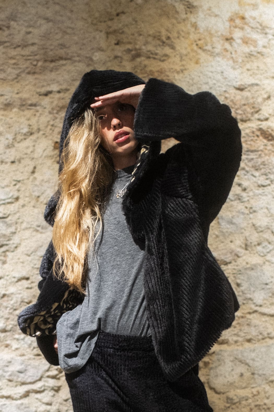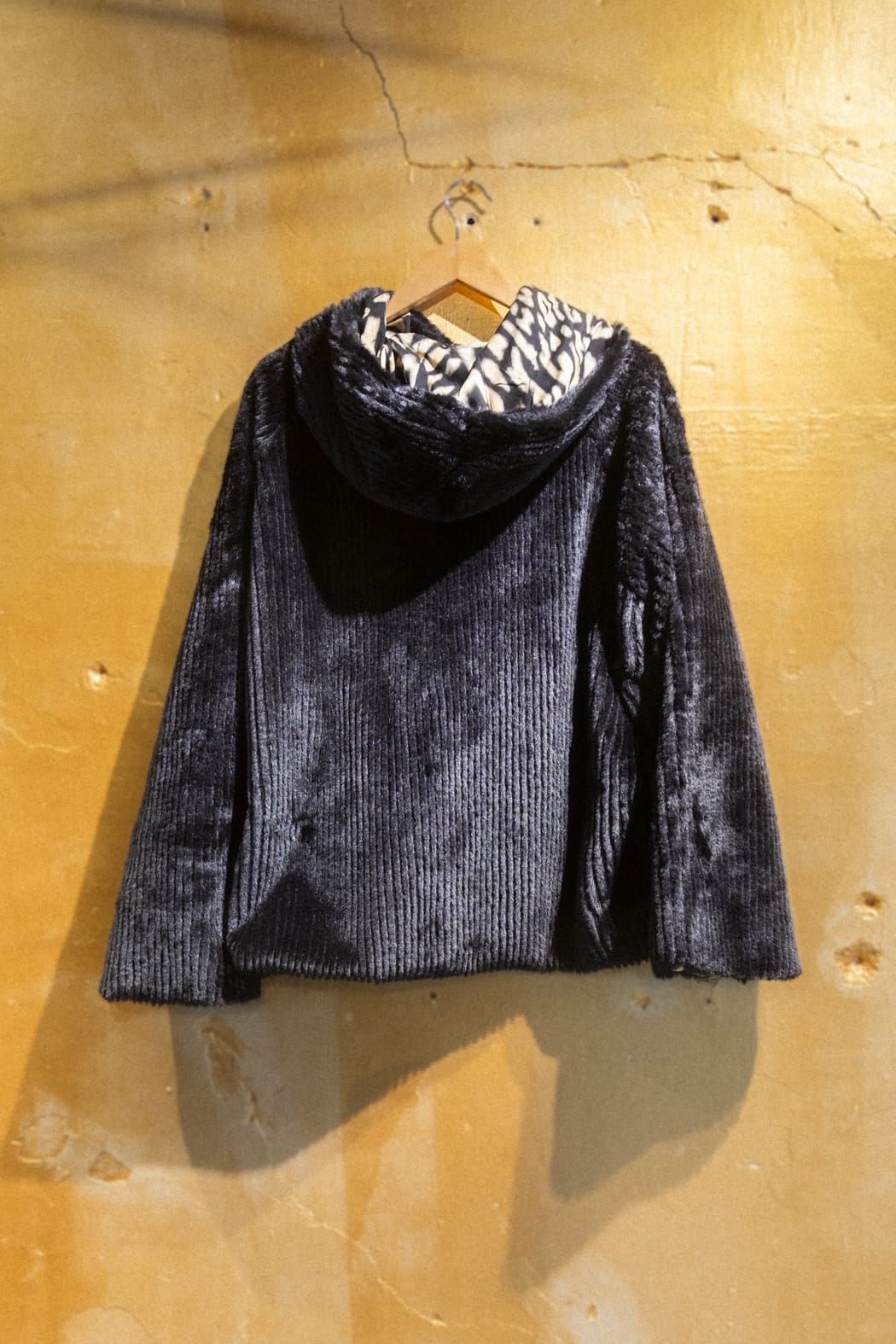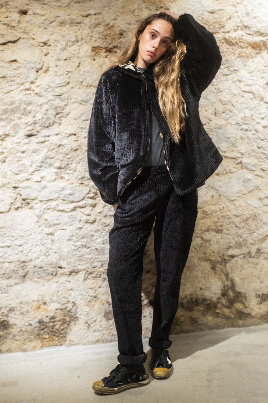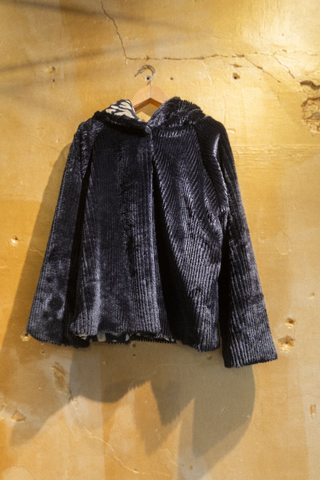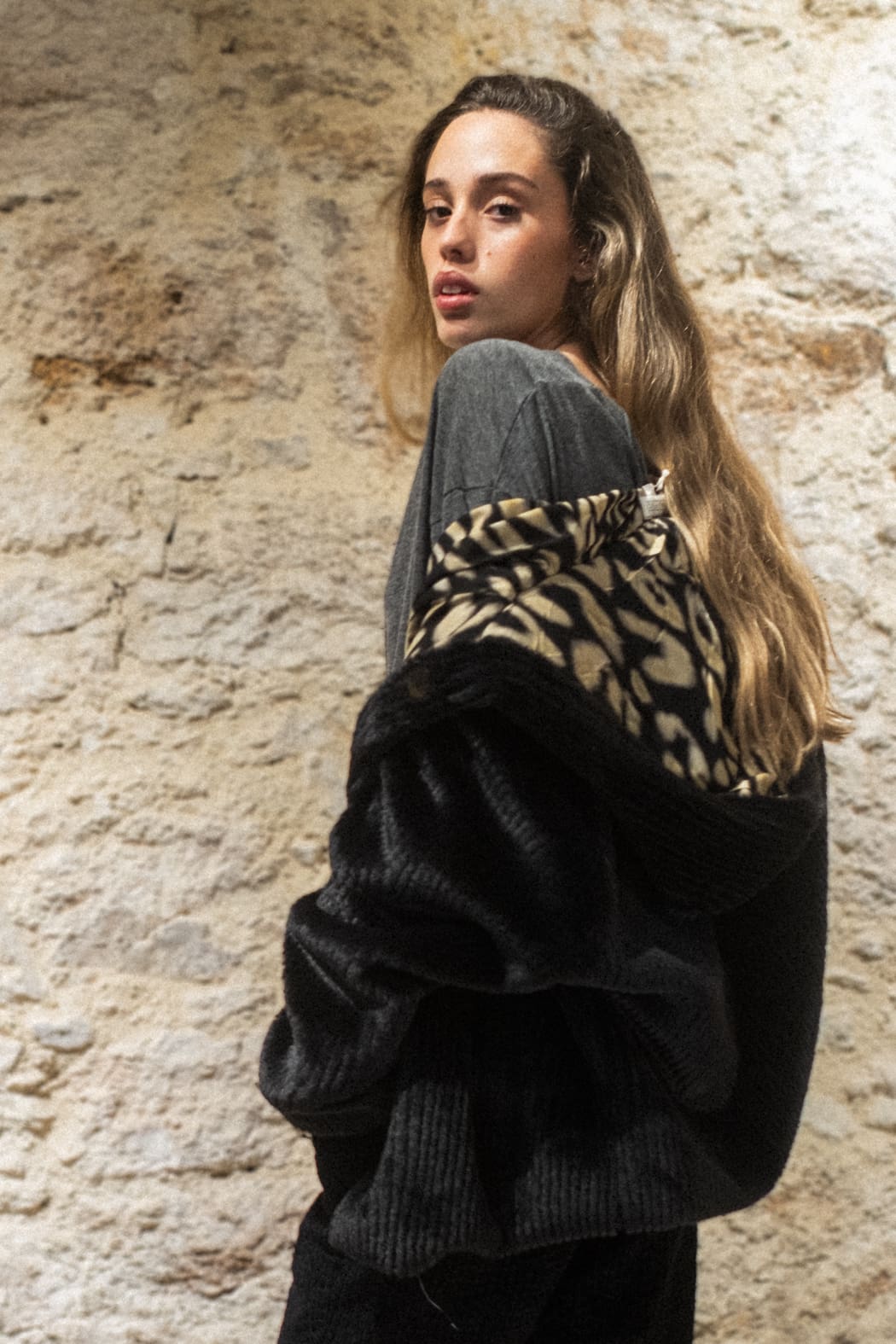 Chaqueta de terciopelo suave con capucha y cierre de un botón. Totalmente forrada en viscosa con estampado animal print, que aporta un contraste inesperado y sofisticado. El corte recto y la textura aterciopelada convierten esta pieza en una opción cómoda y con personalidad.