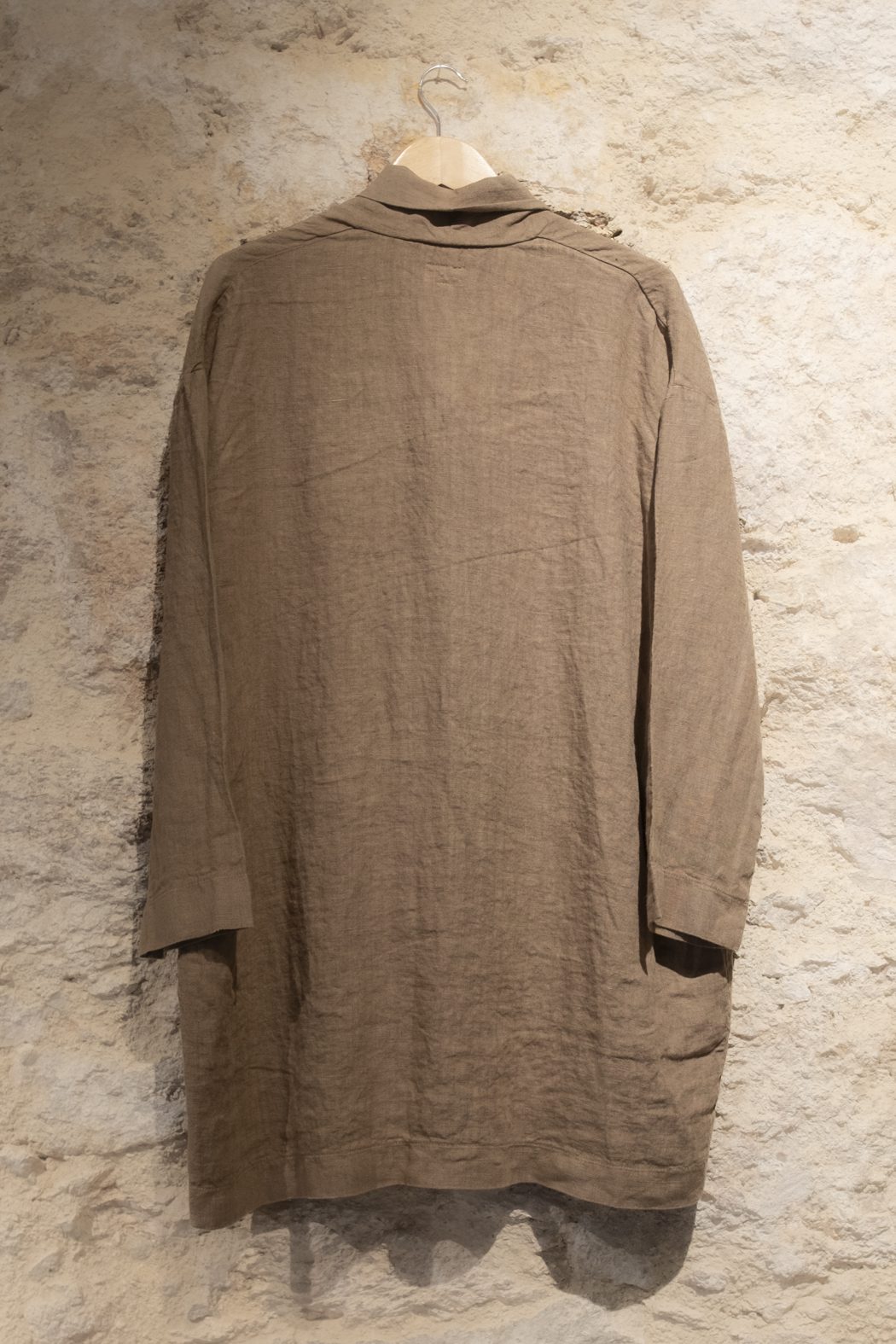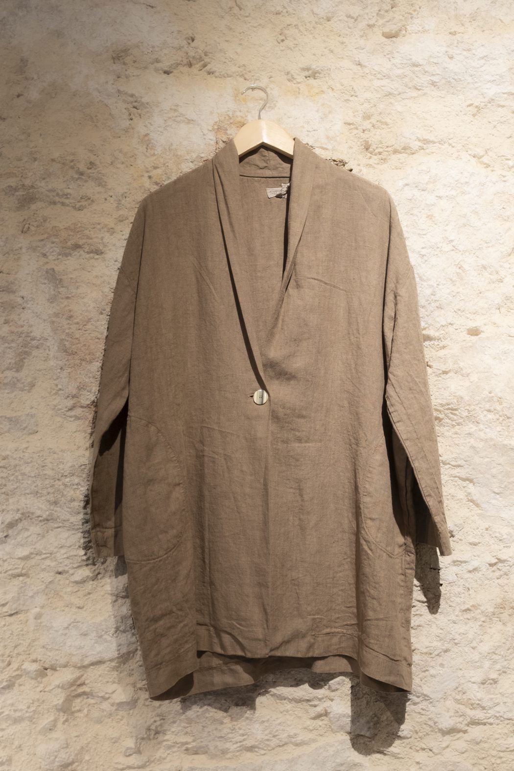 Chaqueta larga de Ateliers Français de Confection, confeccionada en lino, con corte recto y caída fluida. Su diseño de inspiración relajada se completa con solapa suave, cierre frontal de un botón y bolsillos laterales, aportando equilibrio entre estructura y ligereza. Una prenda versátil y atemporal, ideal para superponer con naturalidad.