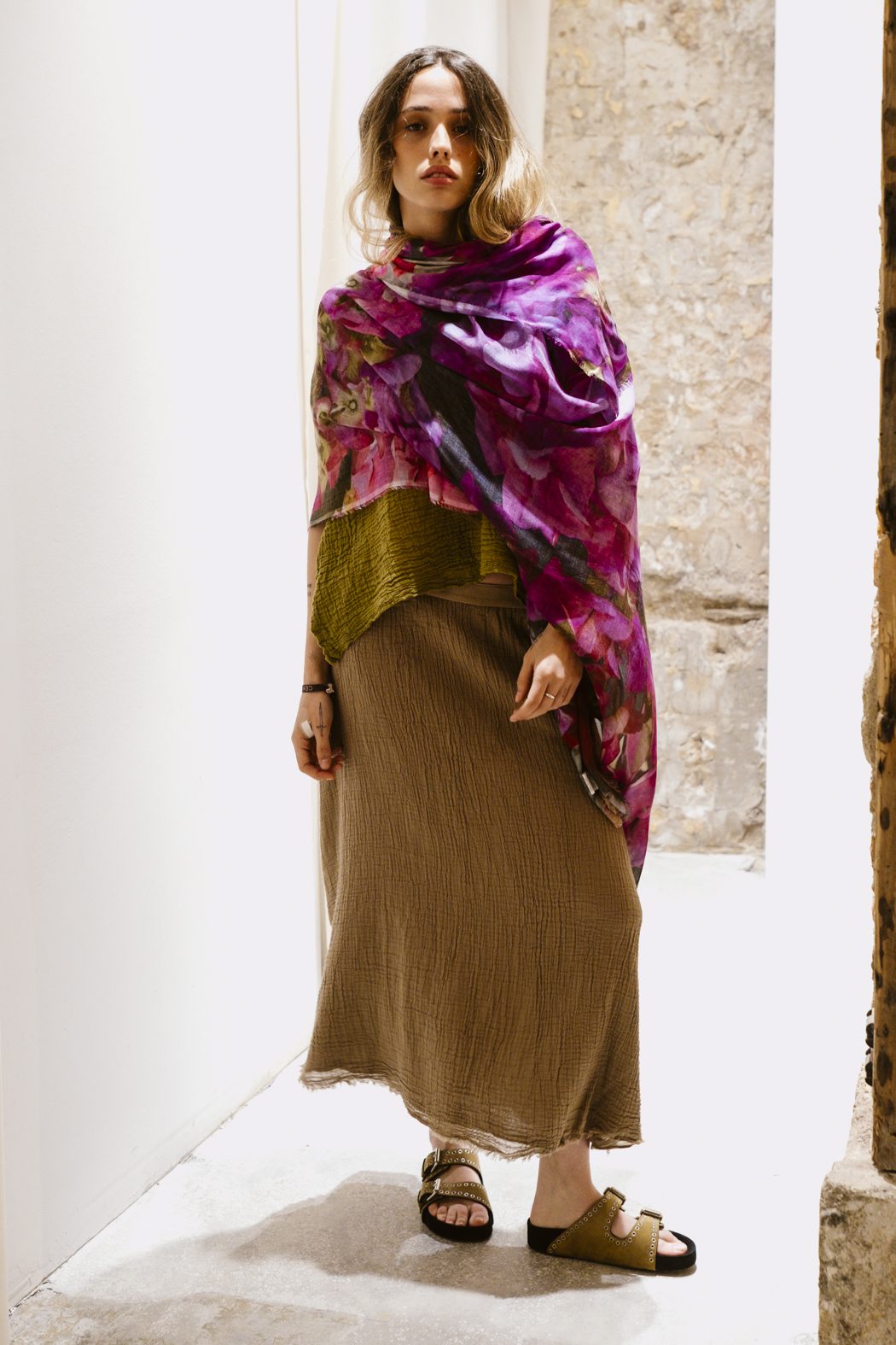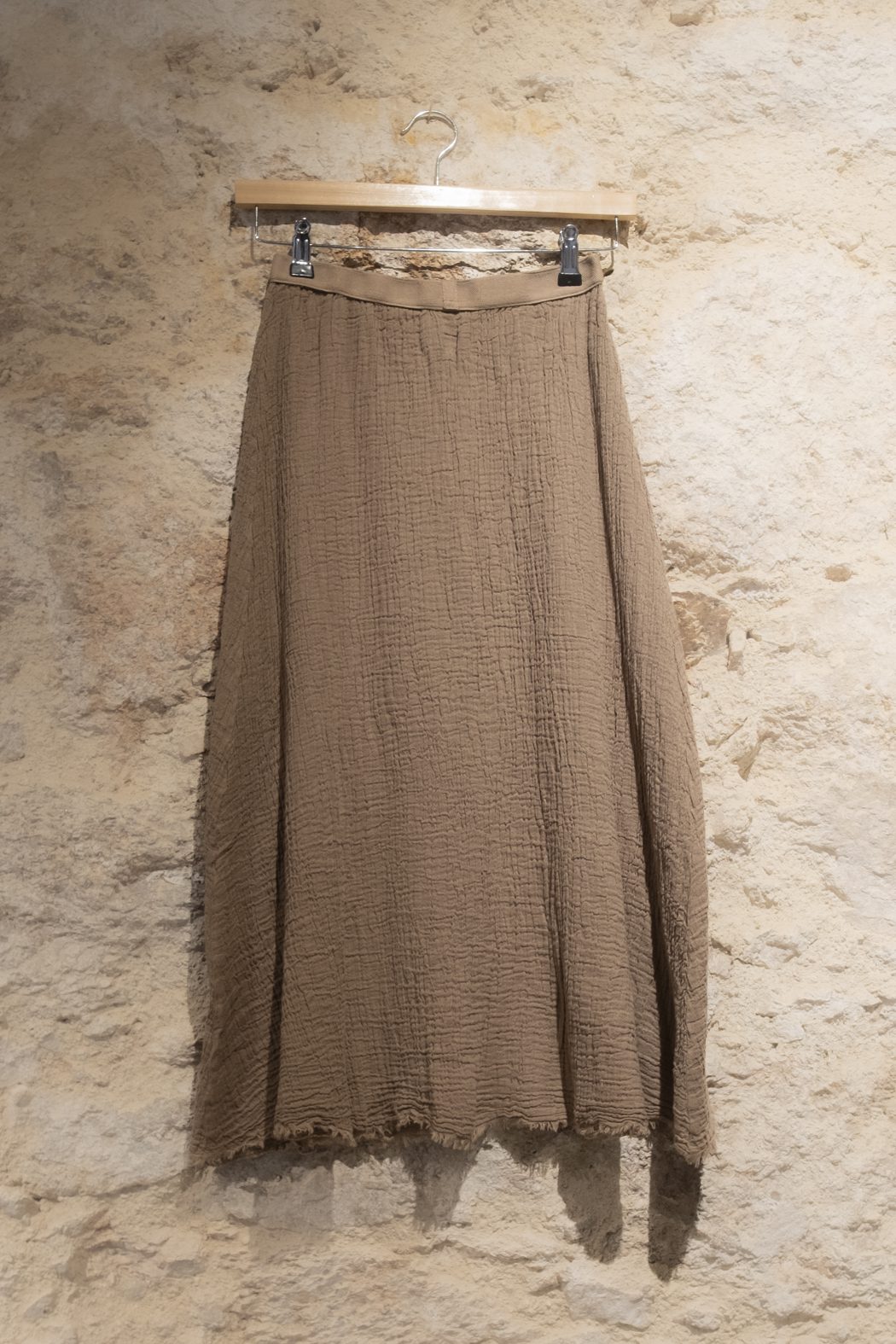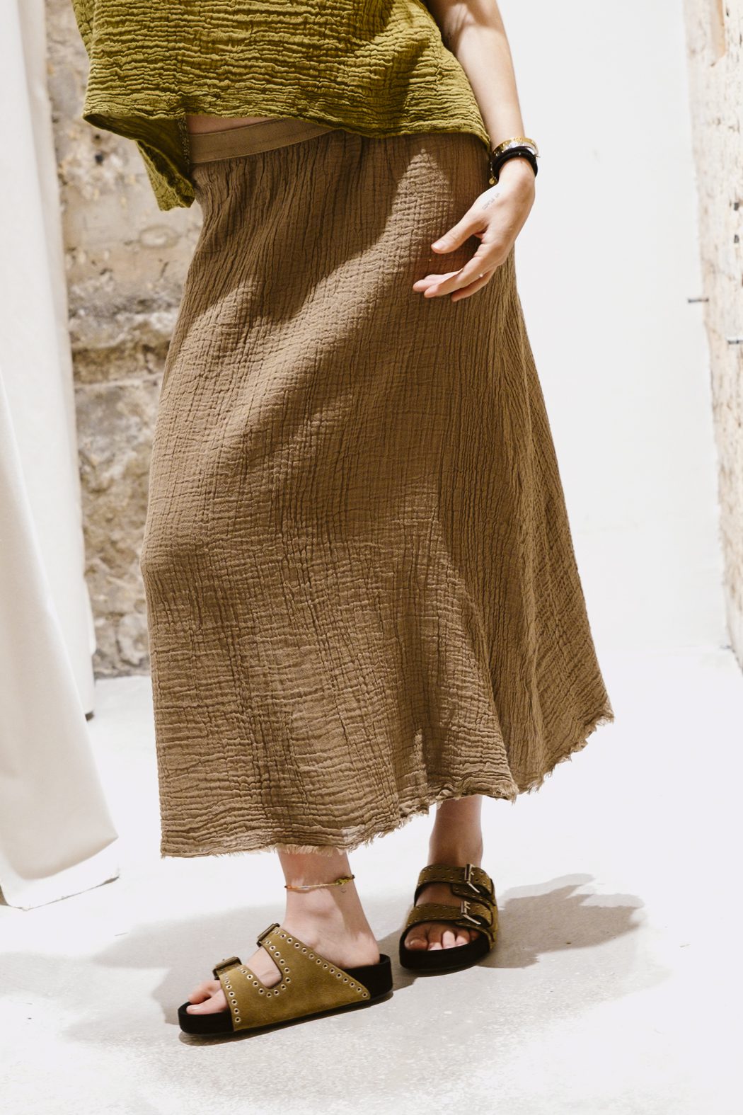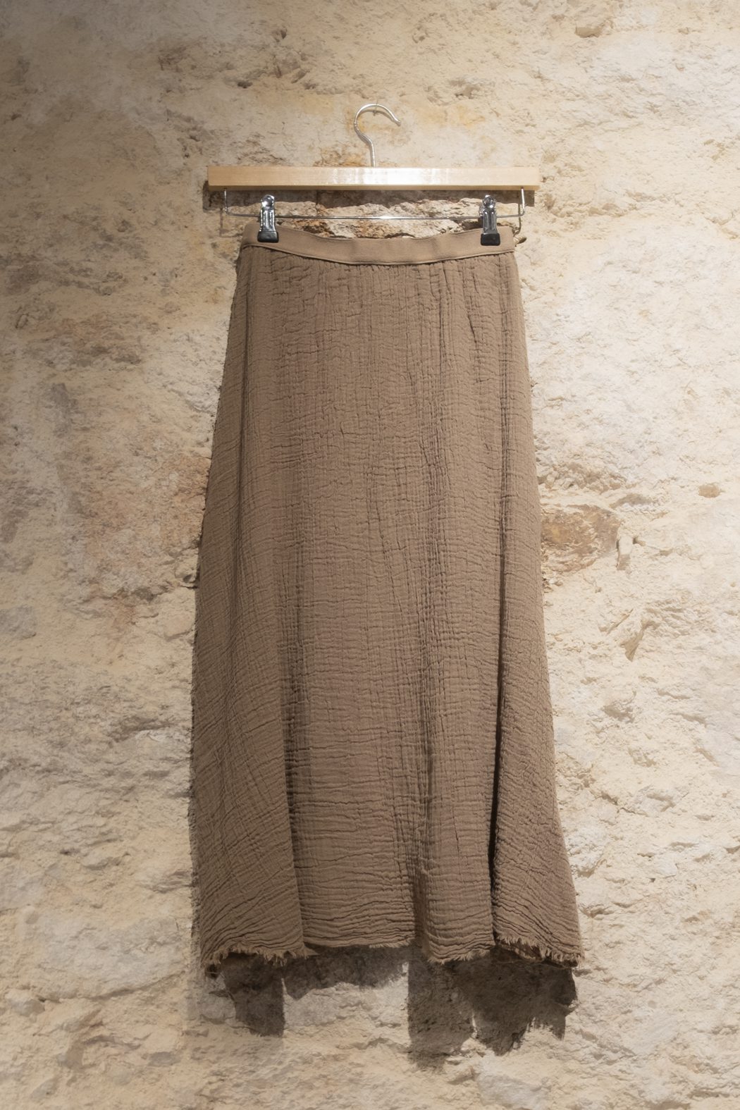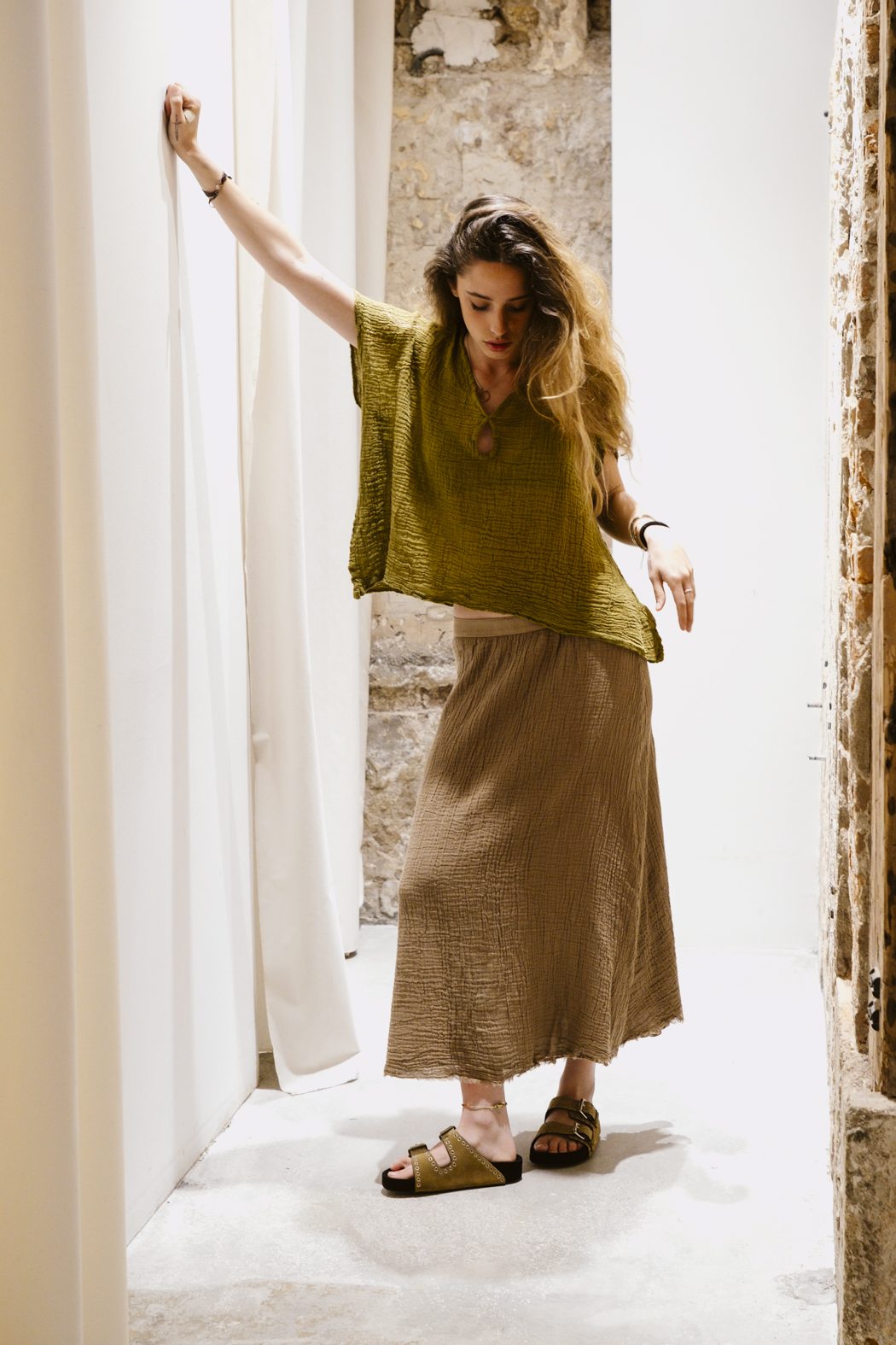 Falda confeccionada en gasa de algodón, con una silueta fluida y un largo ligeramente más corto en el delantero y más largo en la espalda. Incorpora un bolsillo de parche en la parte delantera izquierda, que aporta un detalle funcional y discreto.