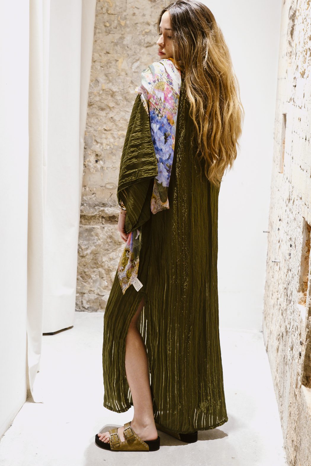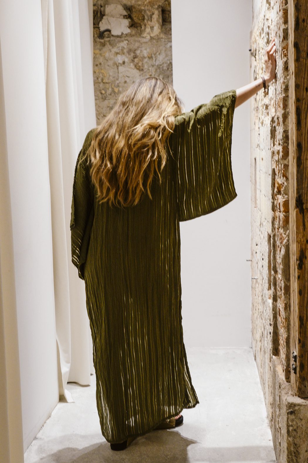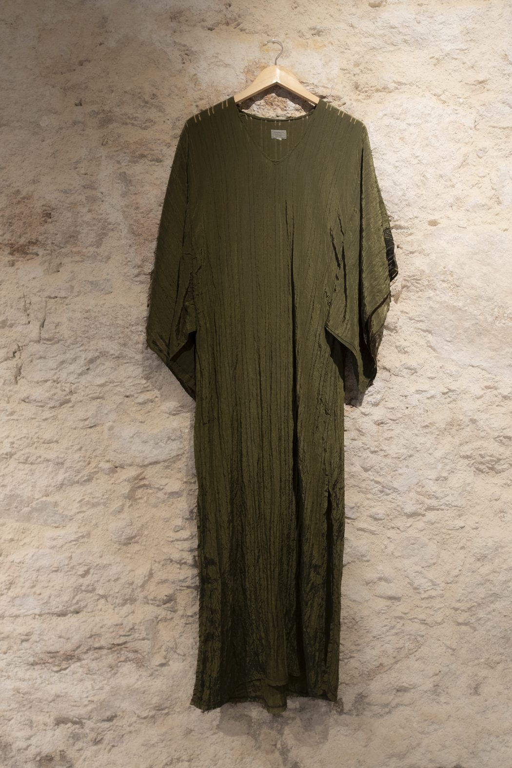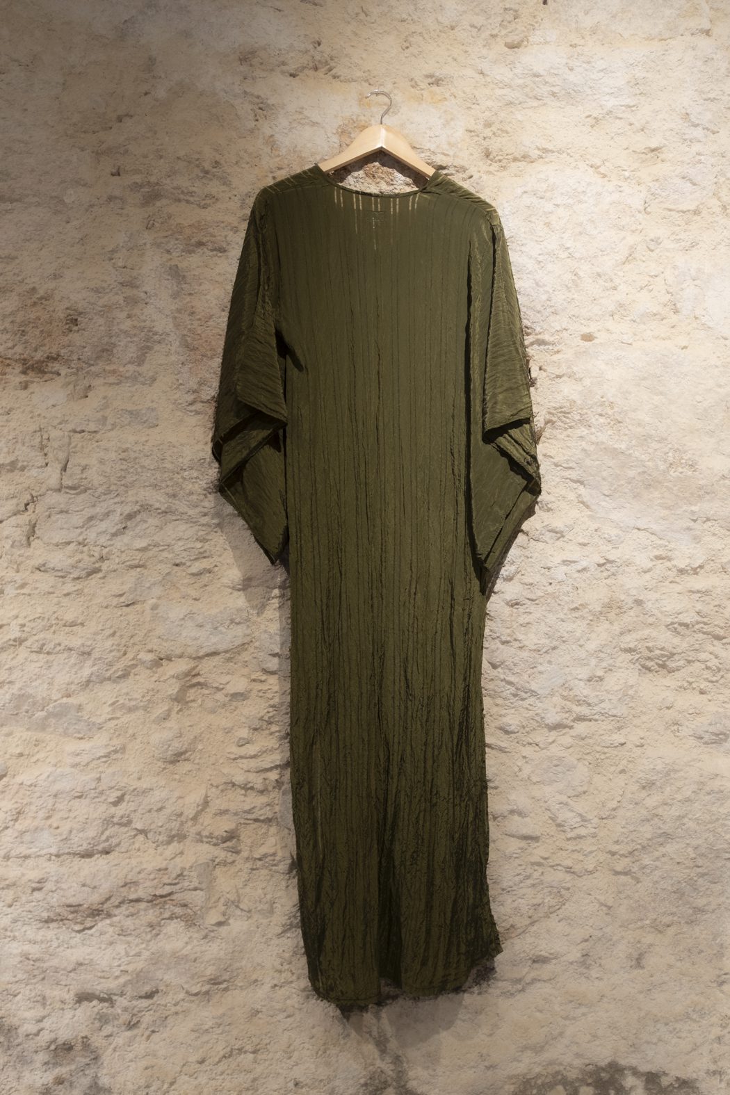 Vestido confeccionado en Tencel, con una caída fluida y una textura ligeramente arrugada que aporta movimiento y naturalidad. Su silueta amplia y envolvente, junto con las mangas de corte relajado, lo convierten en una prenda cómoda y sofisticada, pensada para acompañar el gesto con ligereza.