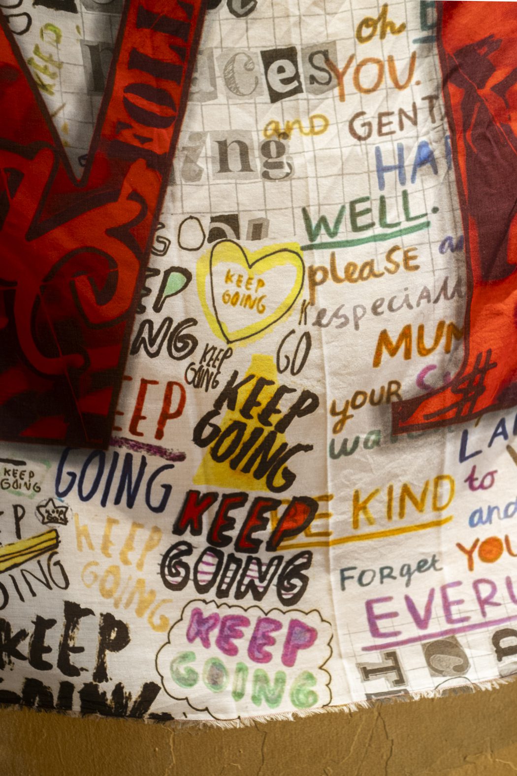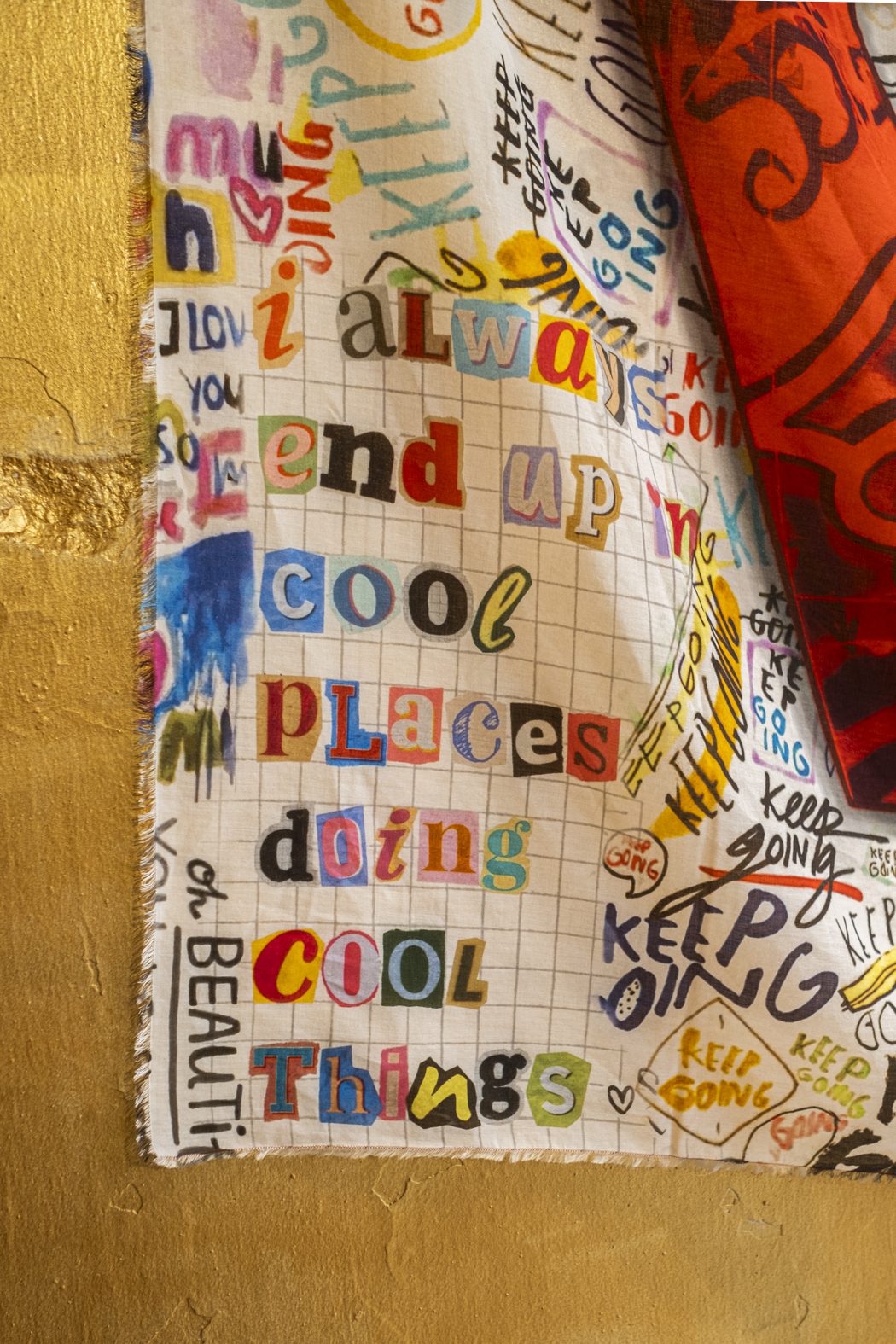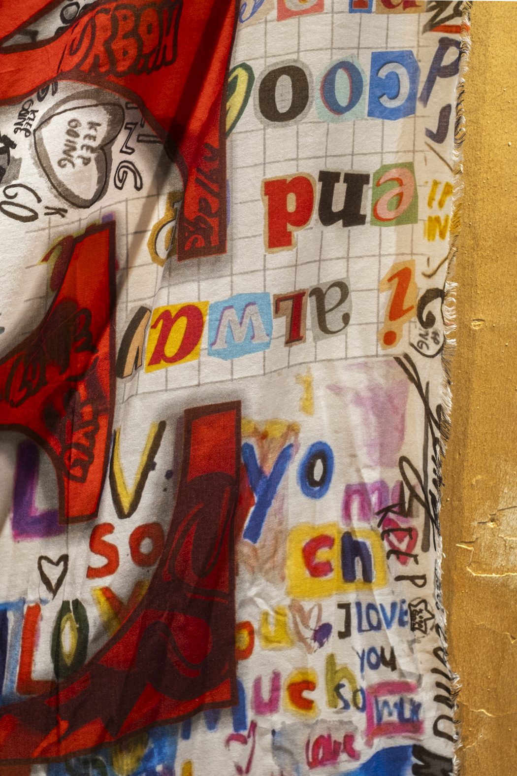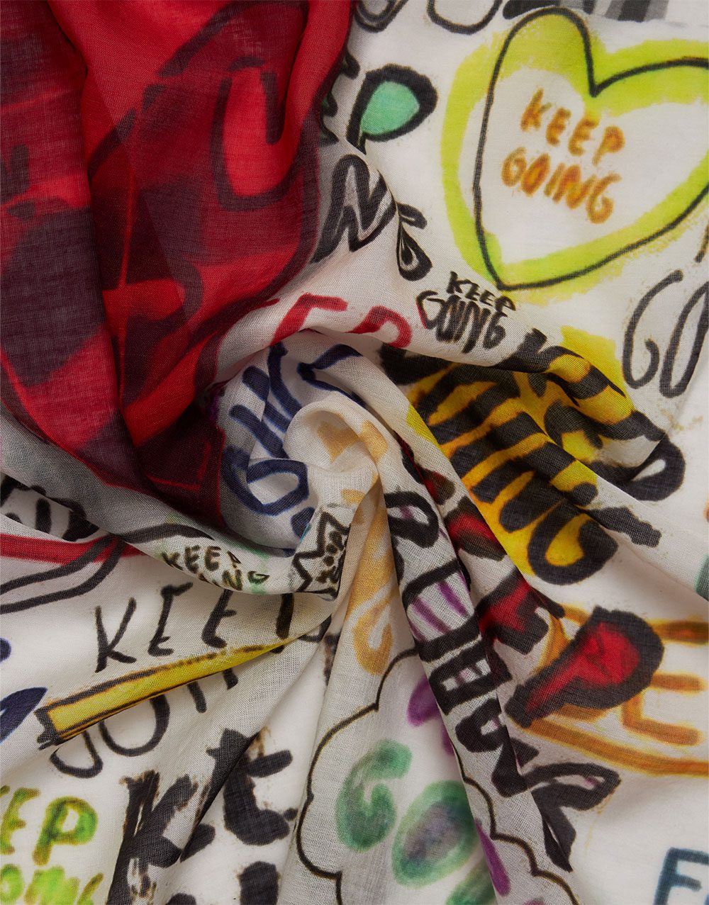 La cultura pop se fusiona con el arte textil: la estola Big Love está confeccionada en modal, algodón y cachemir con un estampado que evoca la década de 2000.