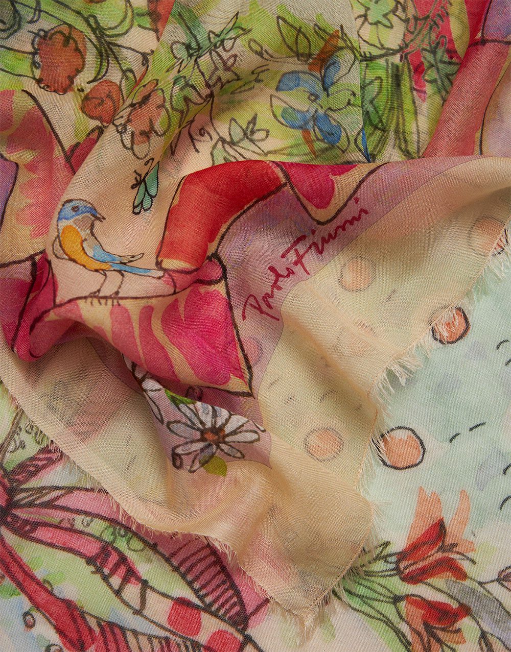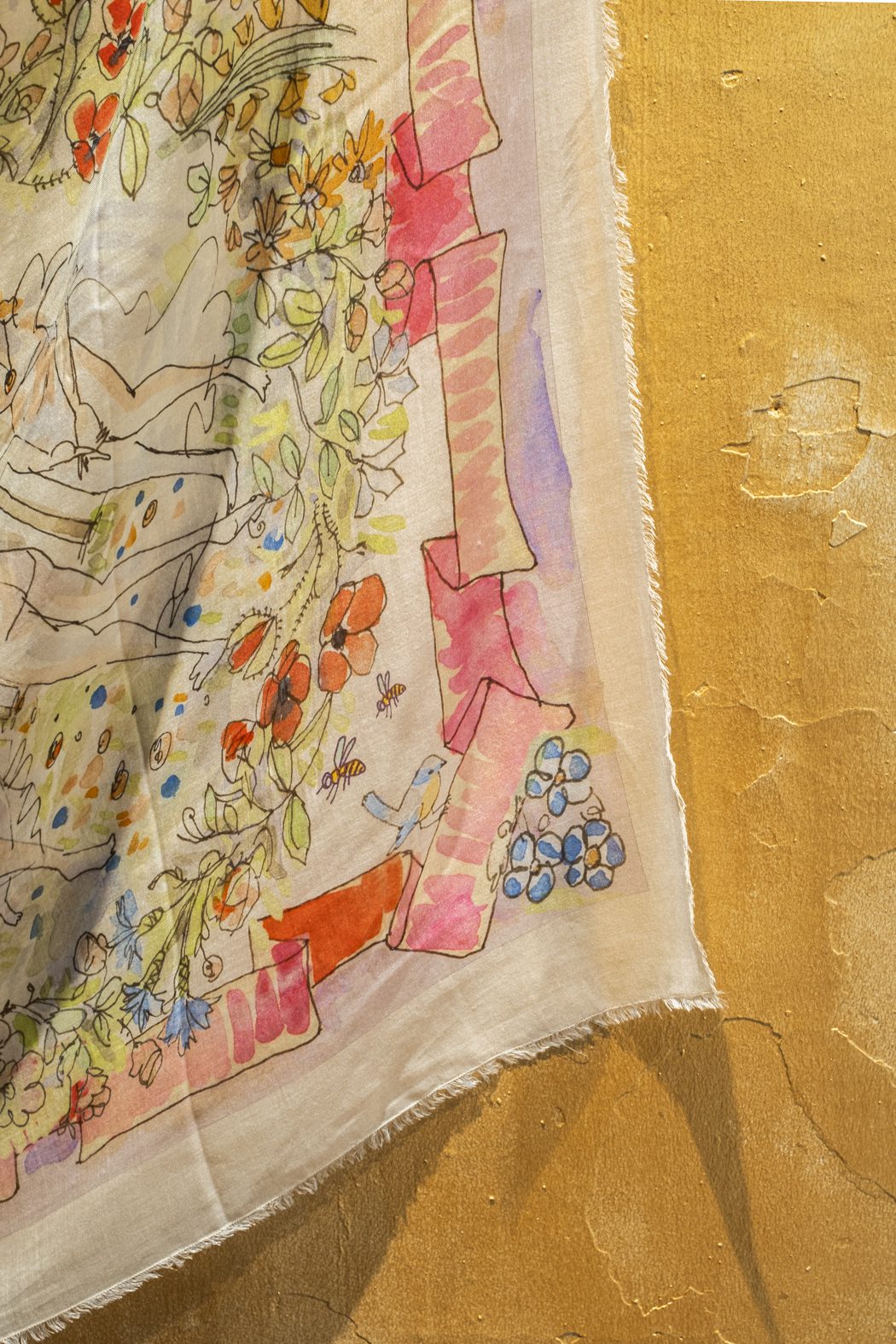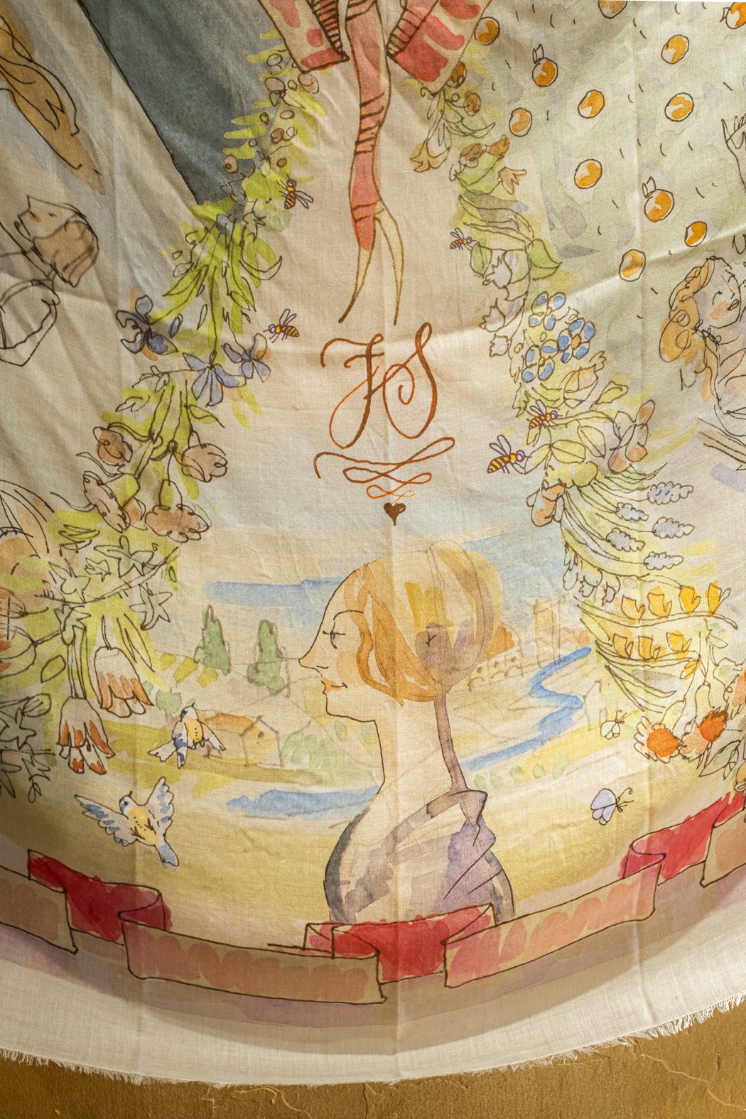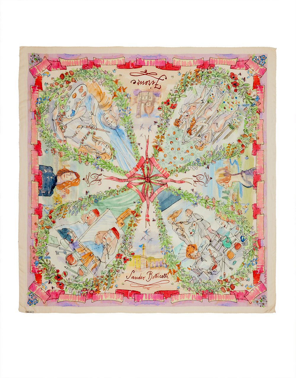 En colaboración con el artista y arquitecto florentino Paolo Fiumi, la estola cuadrada es un relato textil inspirado en el arte renacentista de Sandro Botticelli.