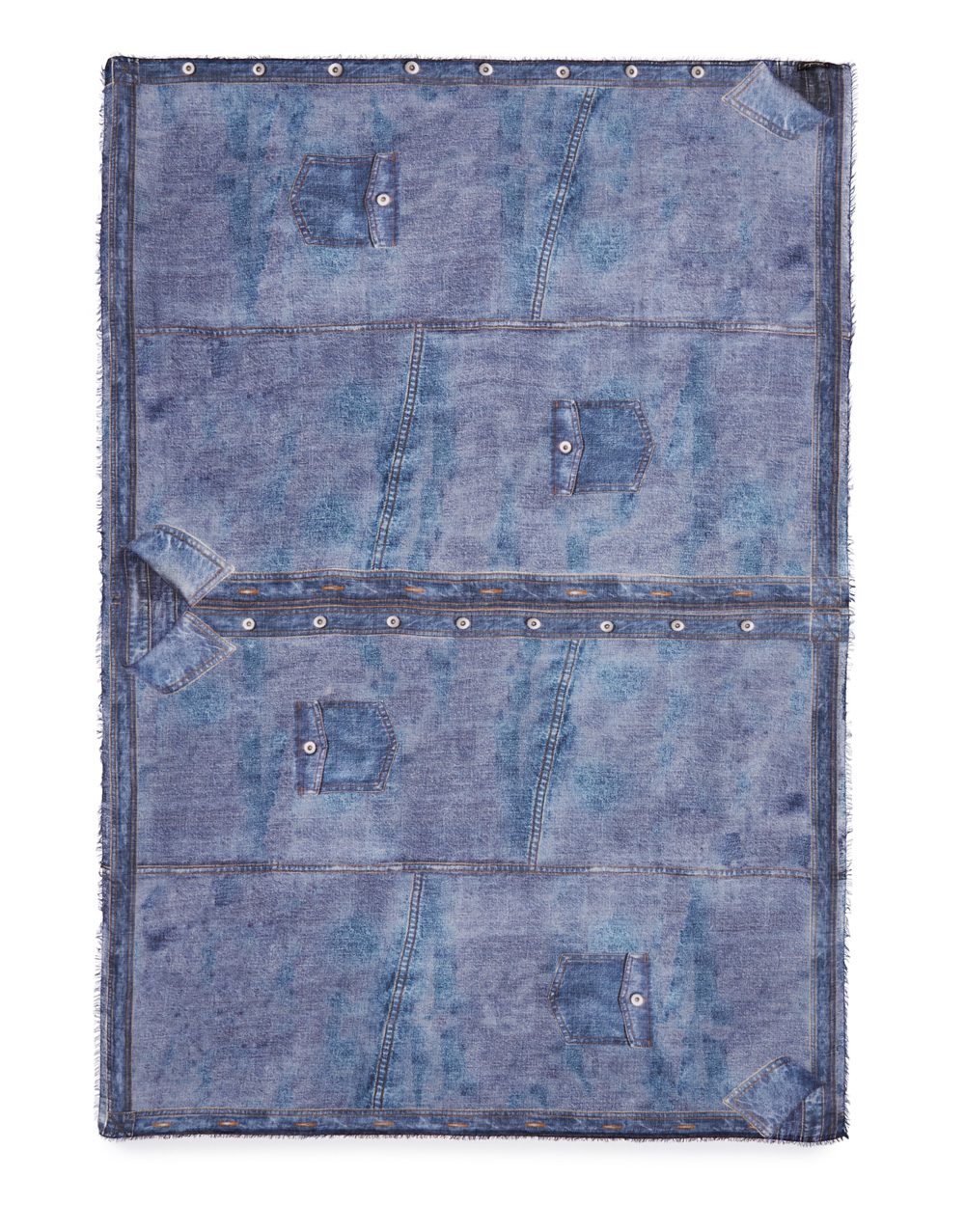 Confeccionada en modal y seda, esta prenda de 95 x 140 cm recrea el estampado de la icónica chaqueta vaquera.