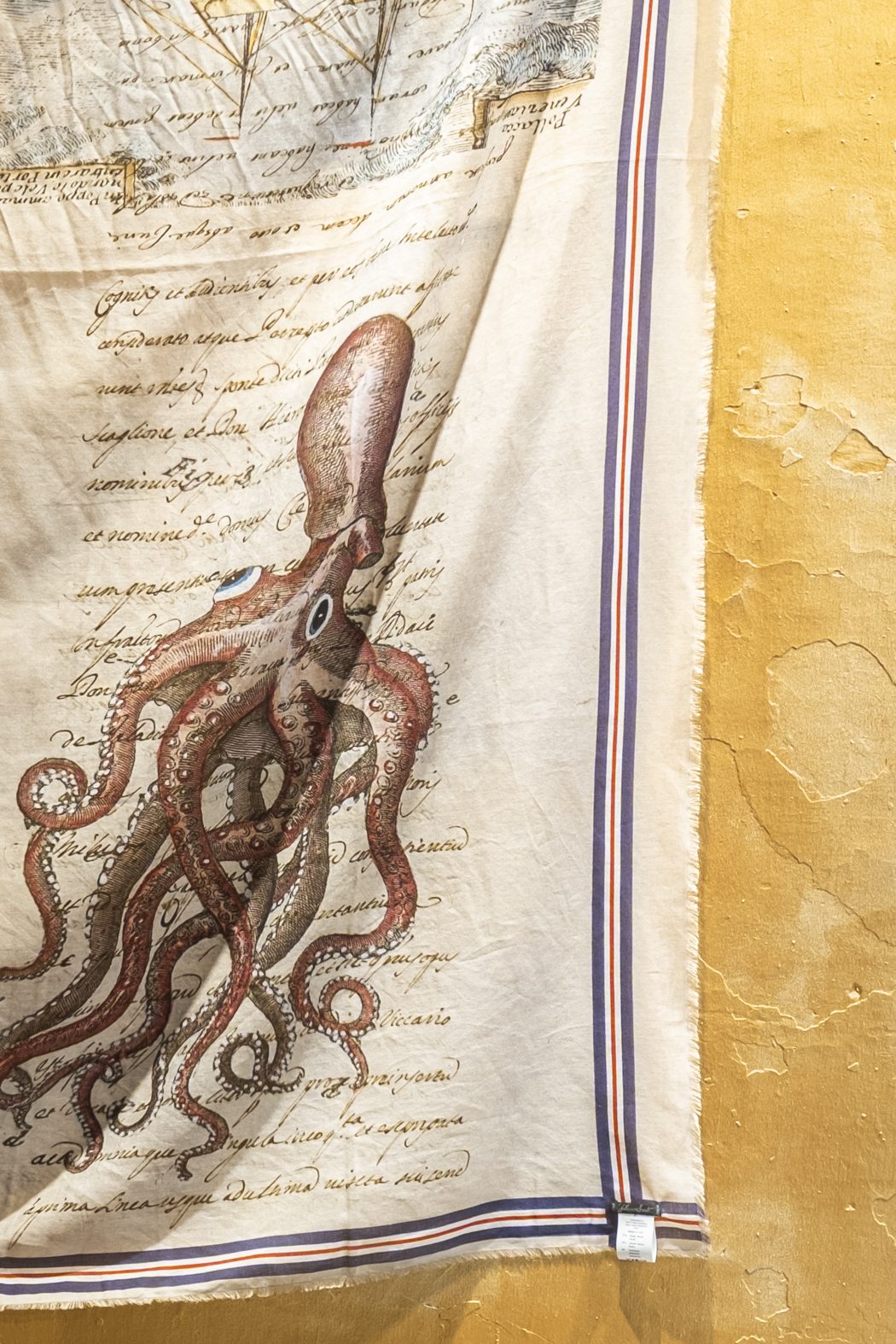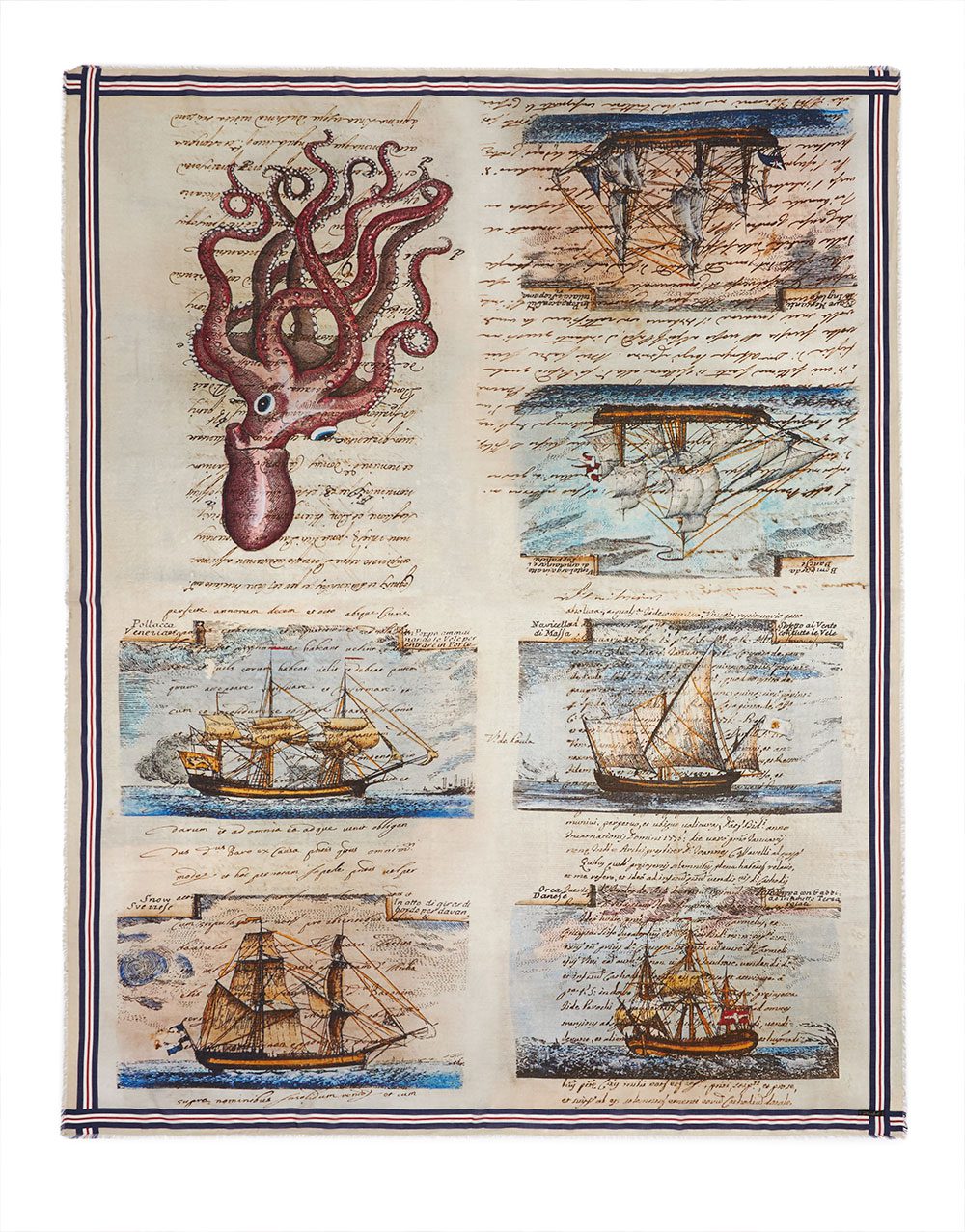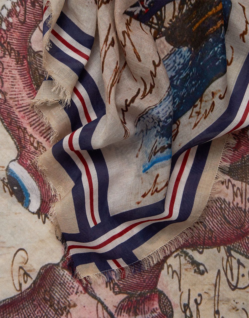 Una estola maxi confeccionada en una mezcla de algodón, modal y cachemir con motivos marinos y navales.
