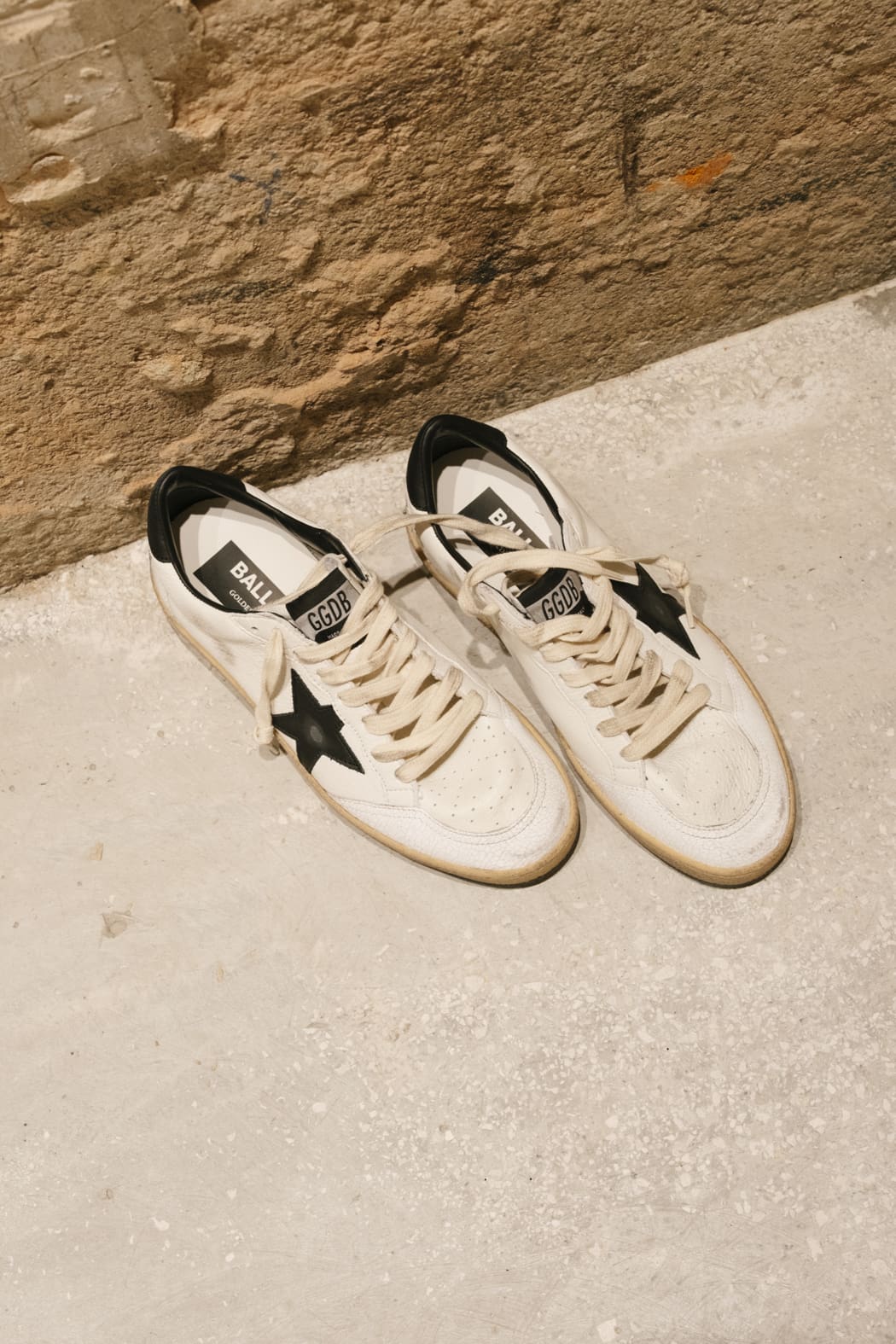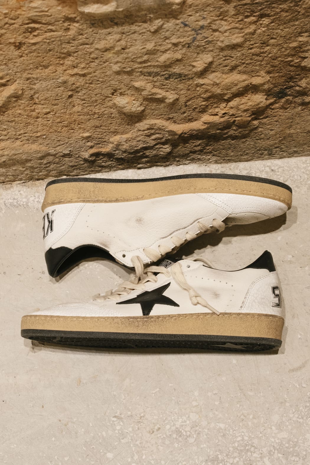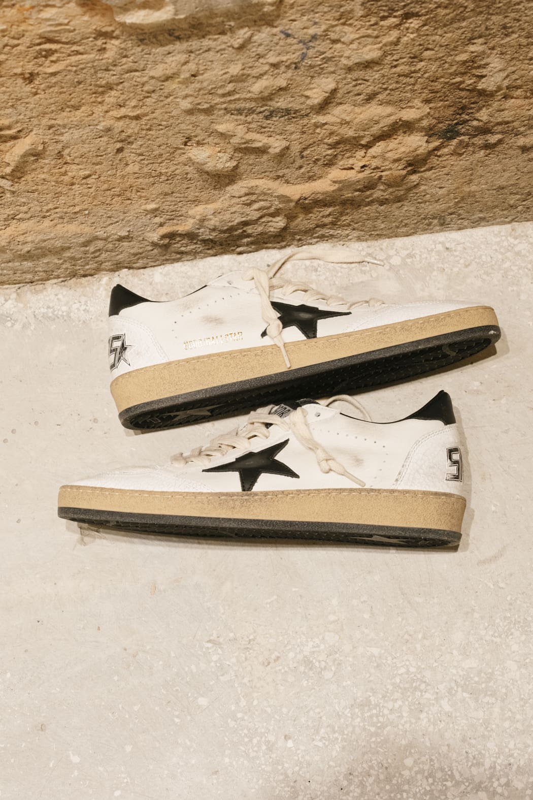 Soñando los años ochenta. Nuestras zapatillas deportivas Ball Star se inspiran en la atmósfera universitaria estadounidense, entre un tiro a canasta y una vuelta en monopatín. Este modelo de mujer con pala de napa blanca resaltada con aplicaciones de piel craquelada blanca se distingue por su estrella y su refuerzo del talón de piel negra. Y como toque final, los cordones color nata: las cosas bonitas nunca pasan de moda.