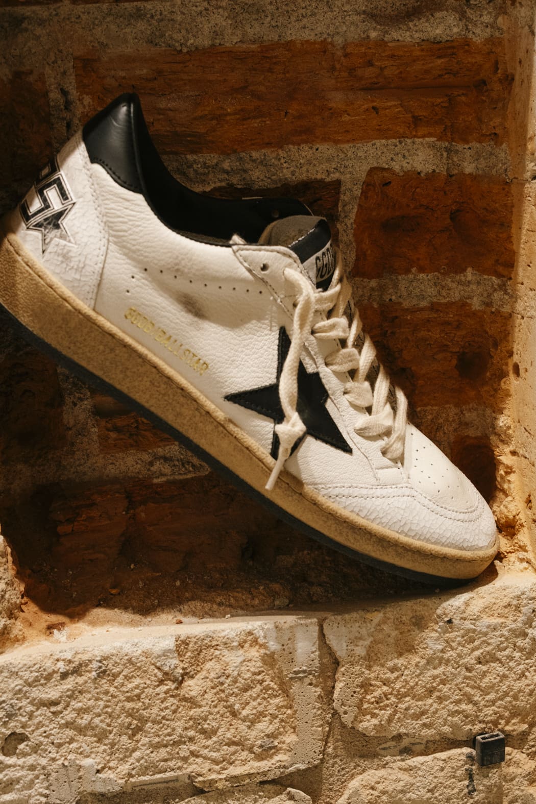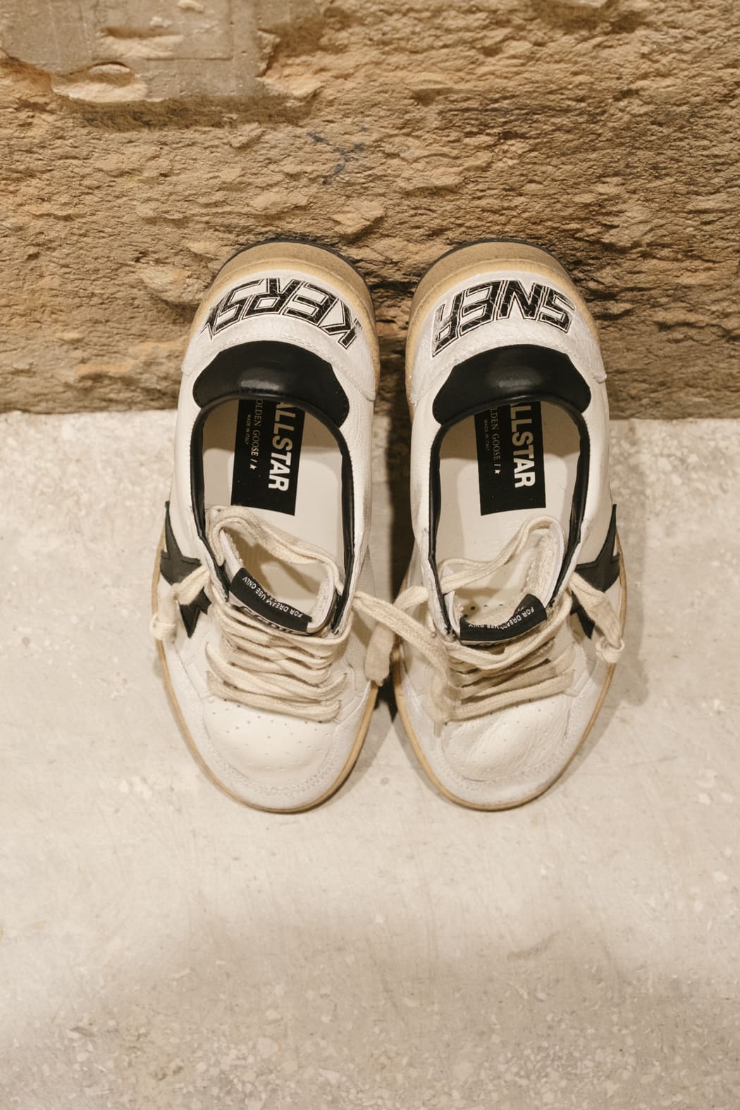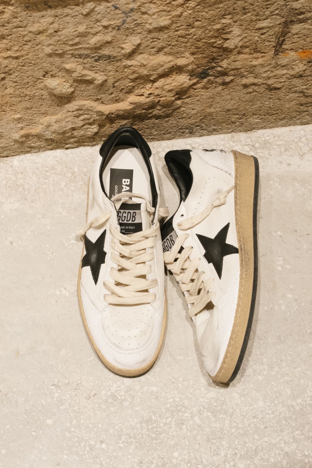 Soñando los años ochenta. Nuestras zapatillas deportivas Ball Star se inspiran en la atmósfera universitaria estadounidense, entre un tiro a canasta y una vuelta en monopatín. Este modelo de mujer con pala de napa blanca resaltada con aplicaciones de piel craquelada blanca se distingue por su estrella y su refuerzo del talón de piel negra. Y como toque final, los cordones color nata: las cosas bonitas nunca pasan de moda.