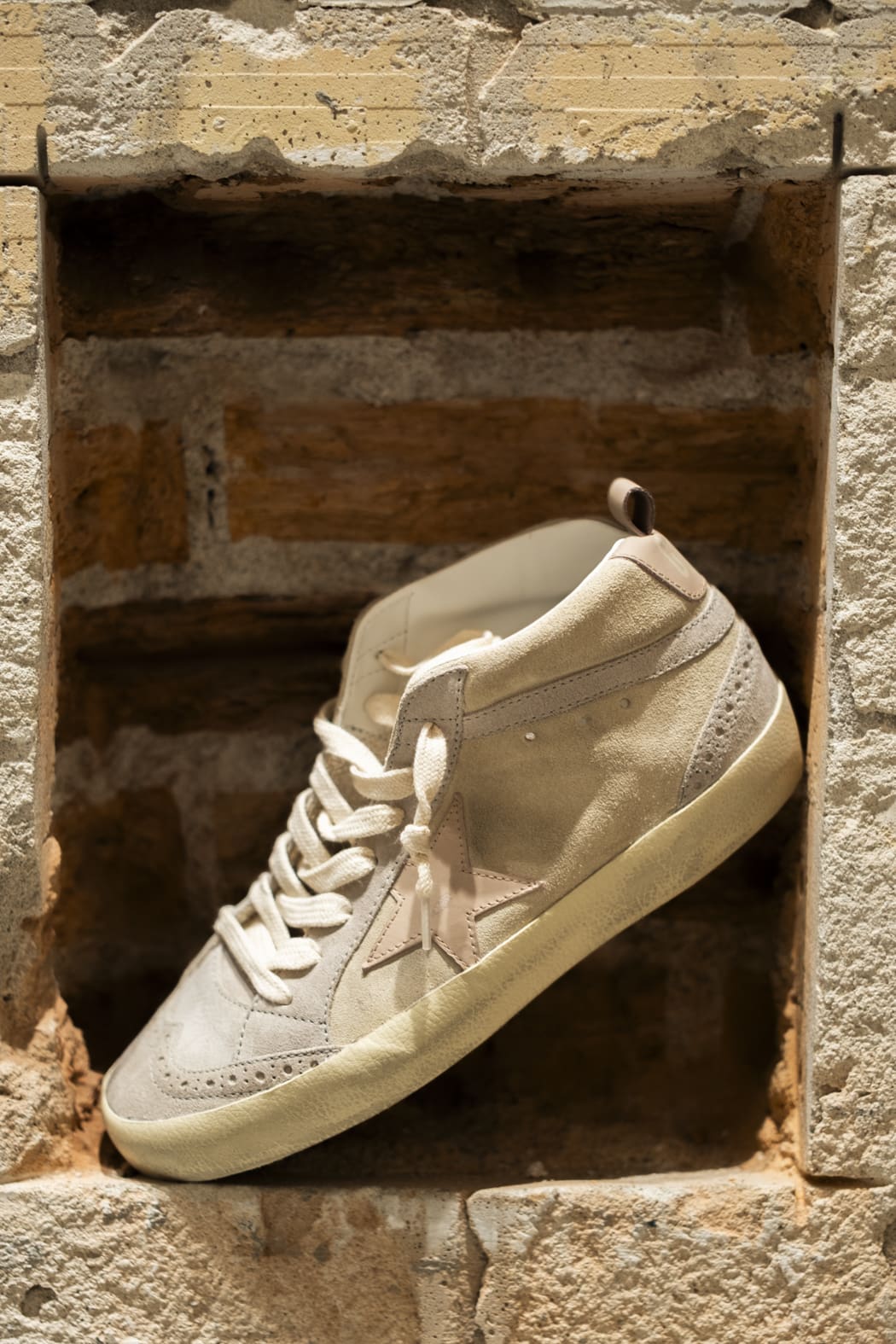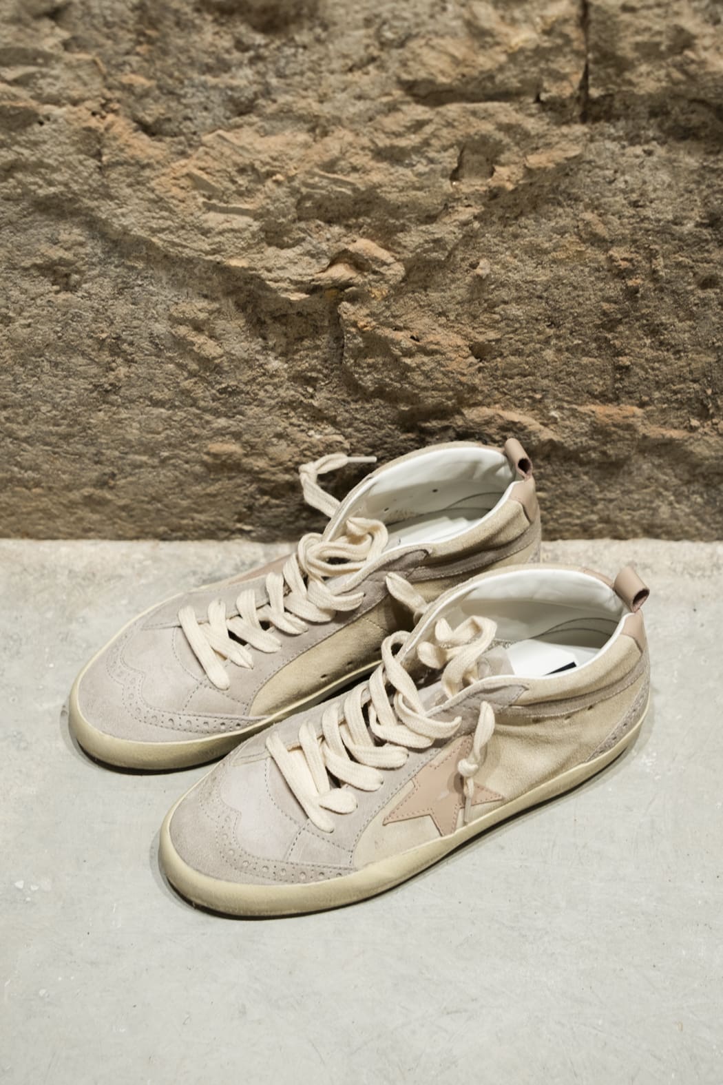 Versatilidad y una elegancia única: las zapatillas deportivas Mid Star se inspiran en la escena skate de los años noventa, pero con un enfoque sofisticado. Como este modelo, con pala de ante beige rosado y caracterizado por su estrella y su refuerzo del talón de piel color rosa polvo. Y como toque final, los cordones crema.