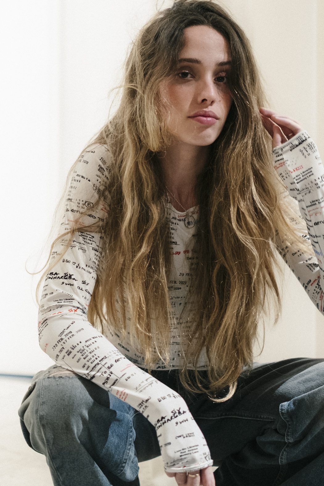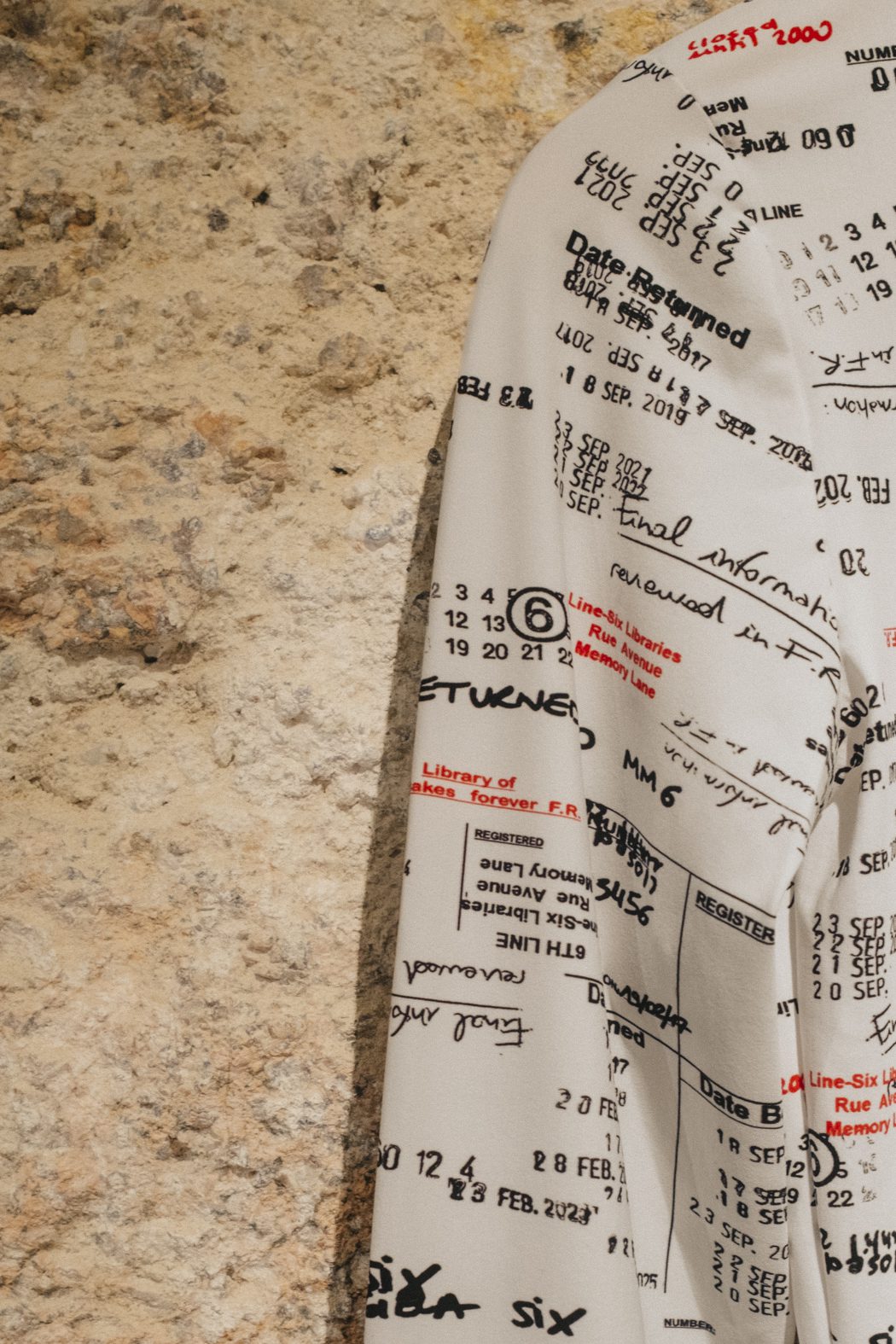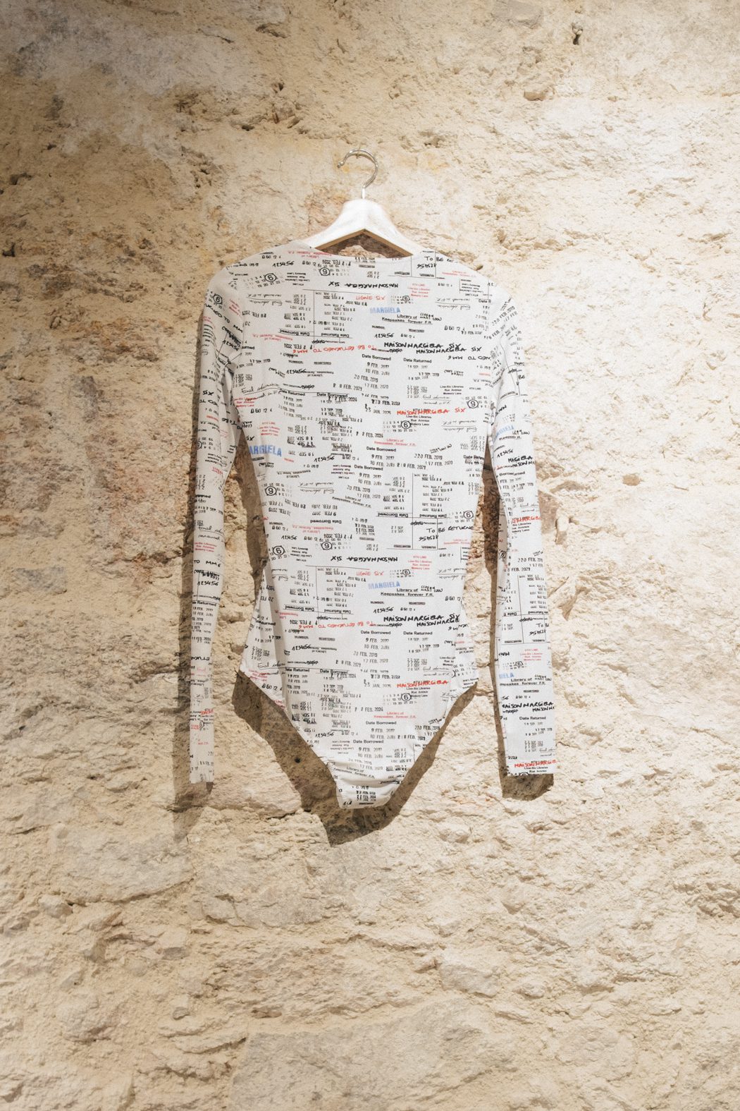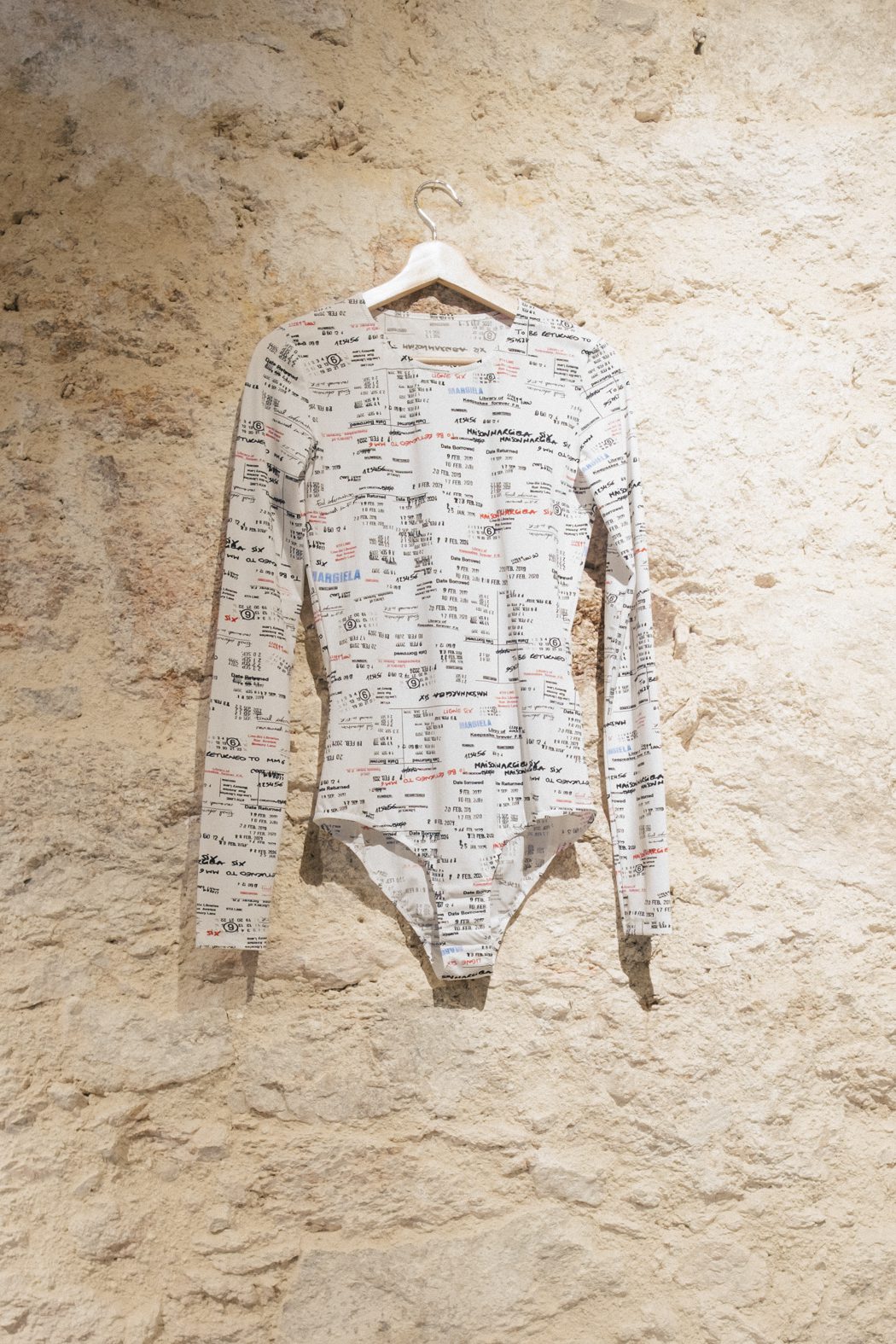 Body de MM6 Maison Margiela en jersey elástico, con escote redondo amplio y estampado gráfico integral en blanco y negro.