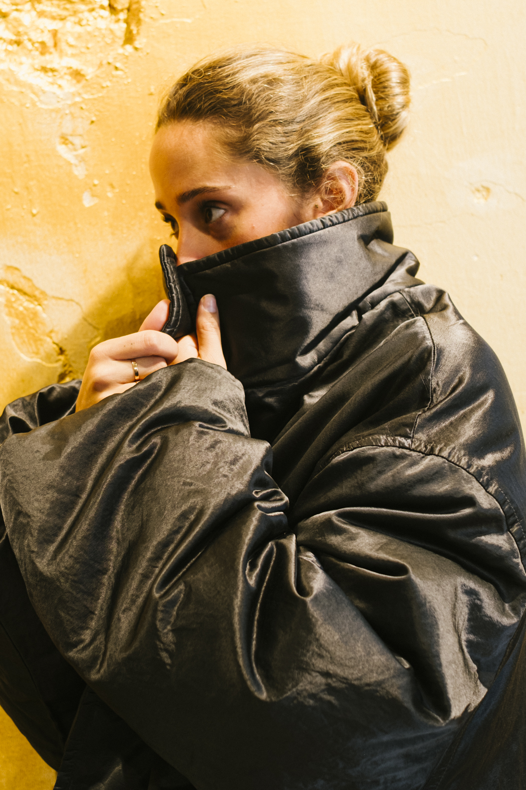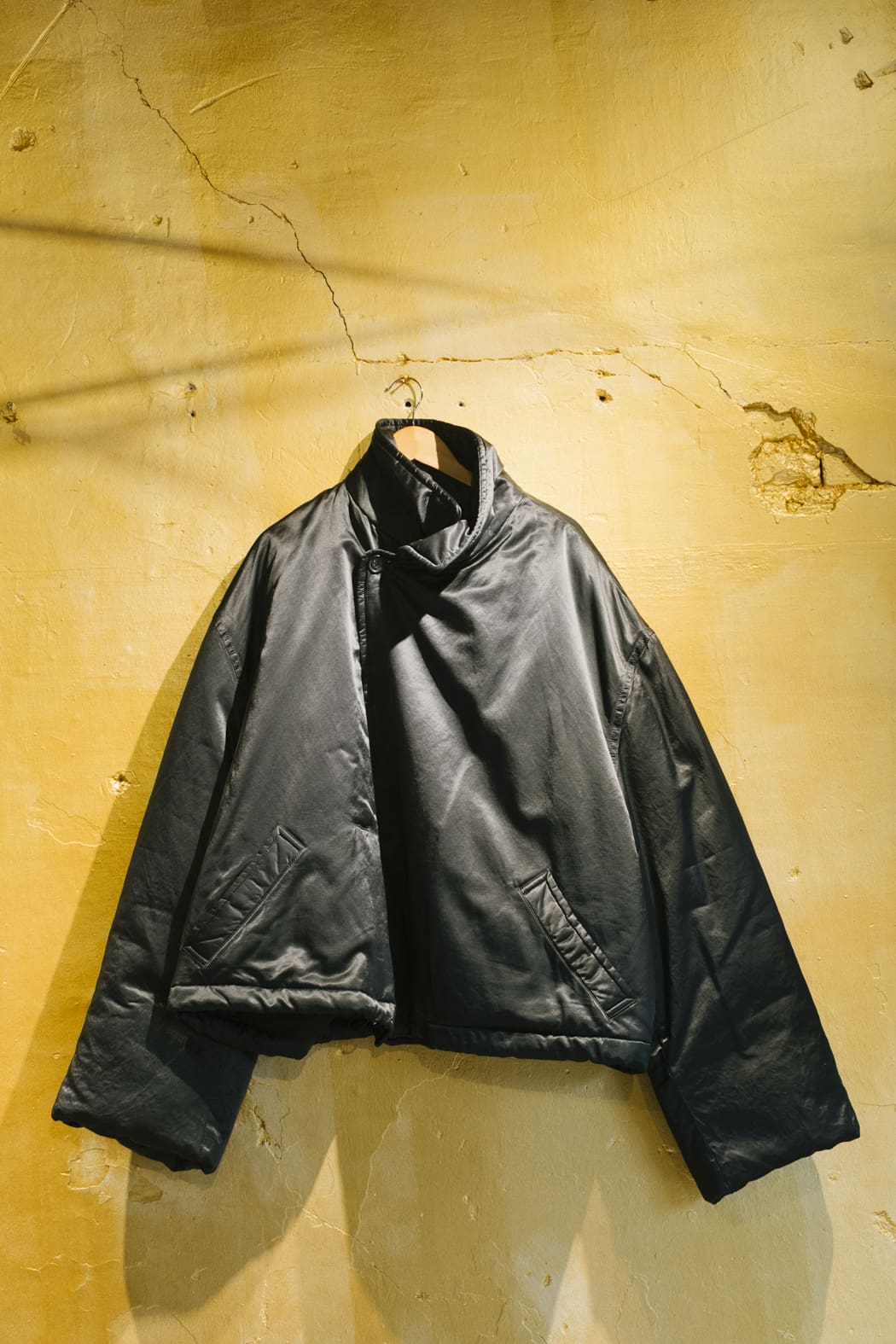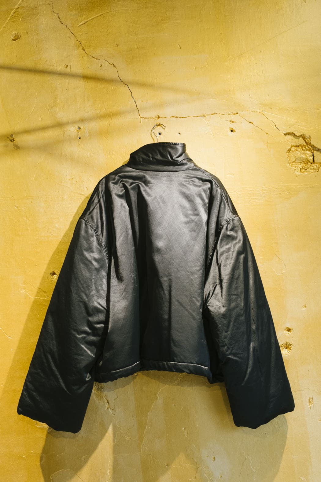 El cuello alto se pliega alrededor del cuello, mientras que los puños anchos y los hombros caídos enfatizan su volumen escultural.