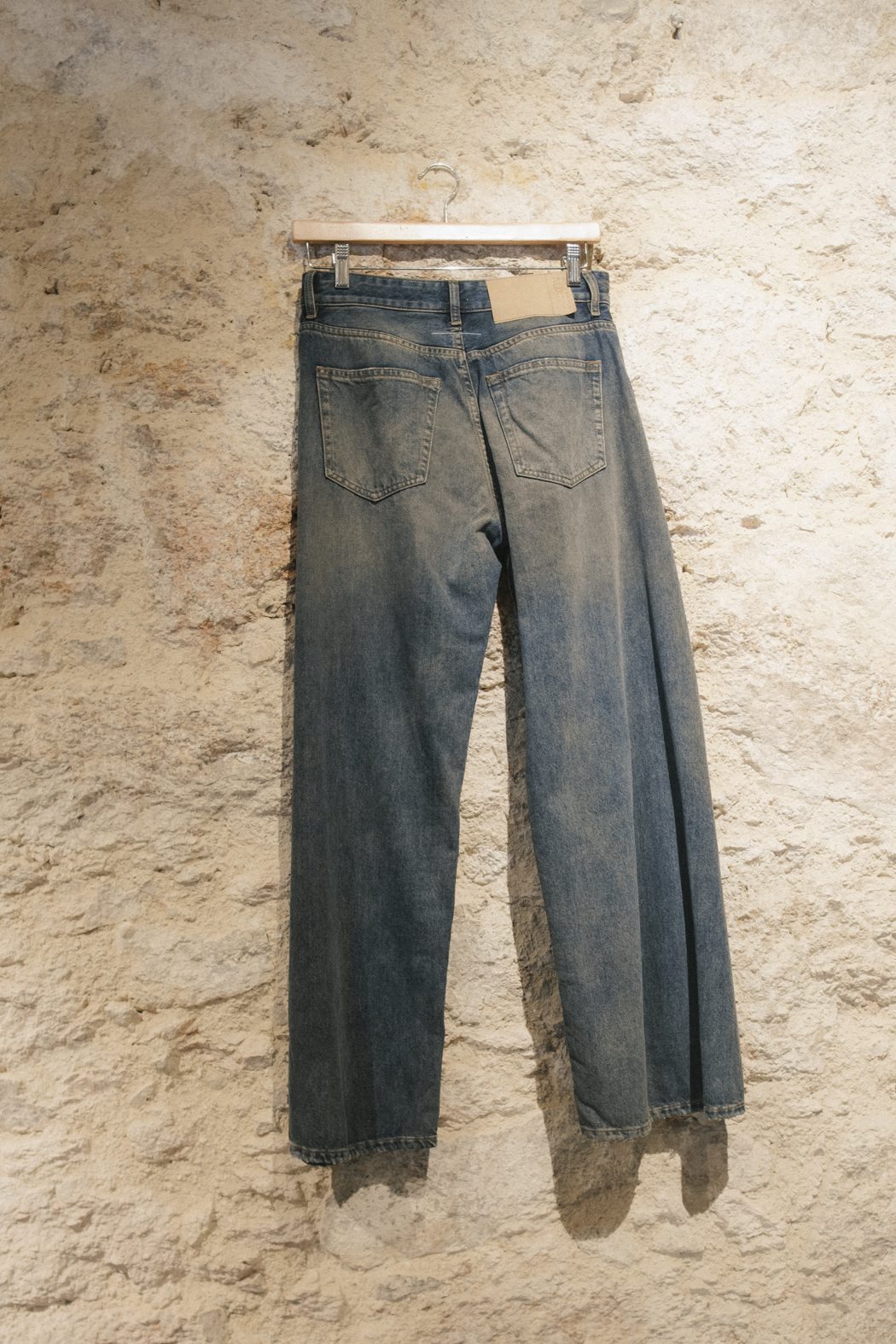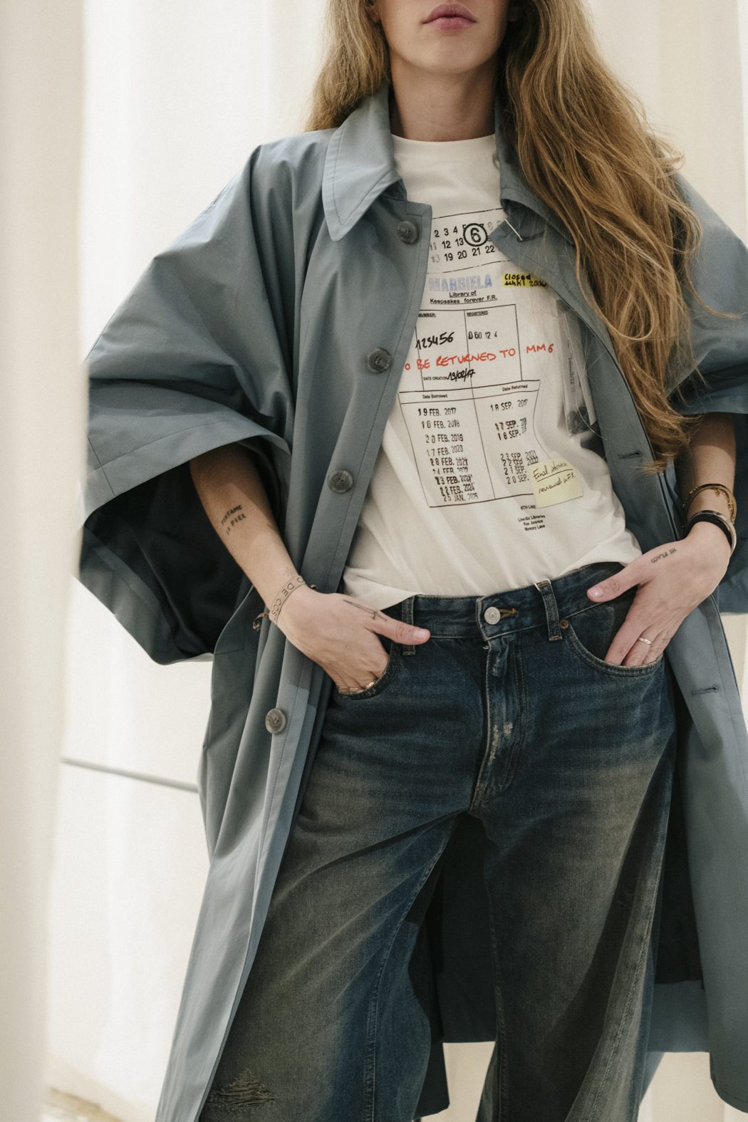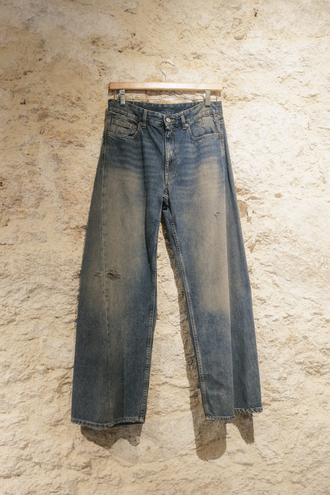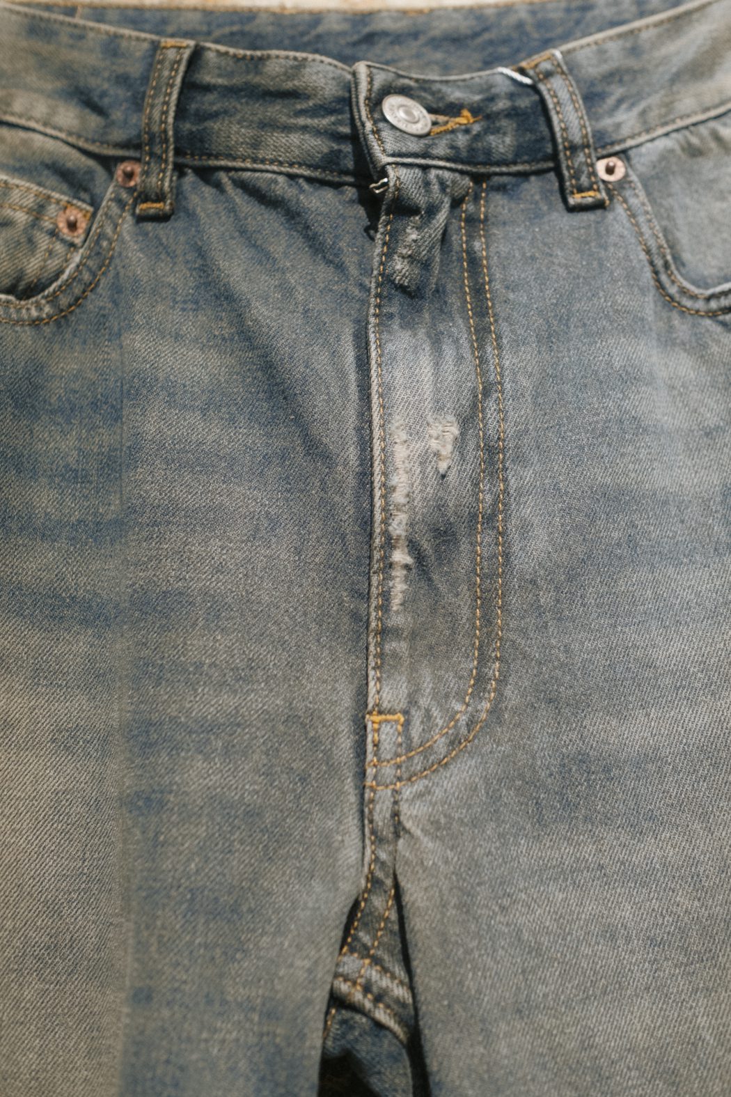 Estos vaqueros reflejan el estilo subversivo de MM6 con su diseño de pernera ancha, trastocado por sus detalles desgastados.
