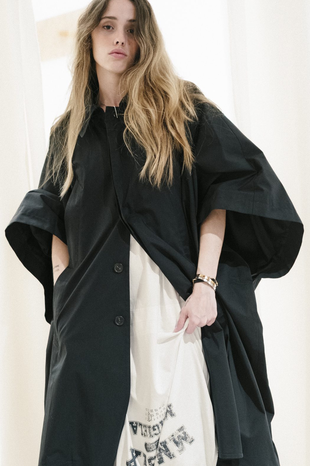 Abrigo oversize confeccionado en tela de gabardina de algodón repelente al agua, con mangas anchas y silueta fluida.