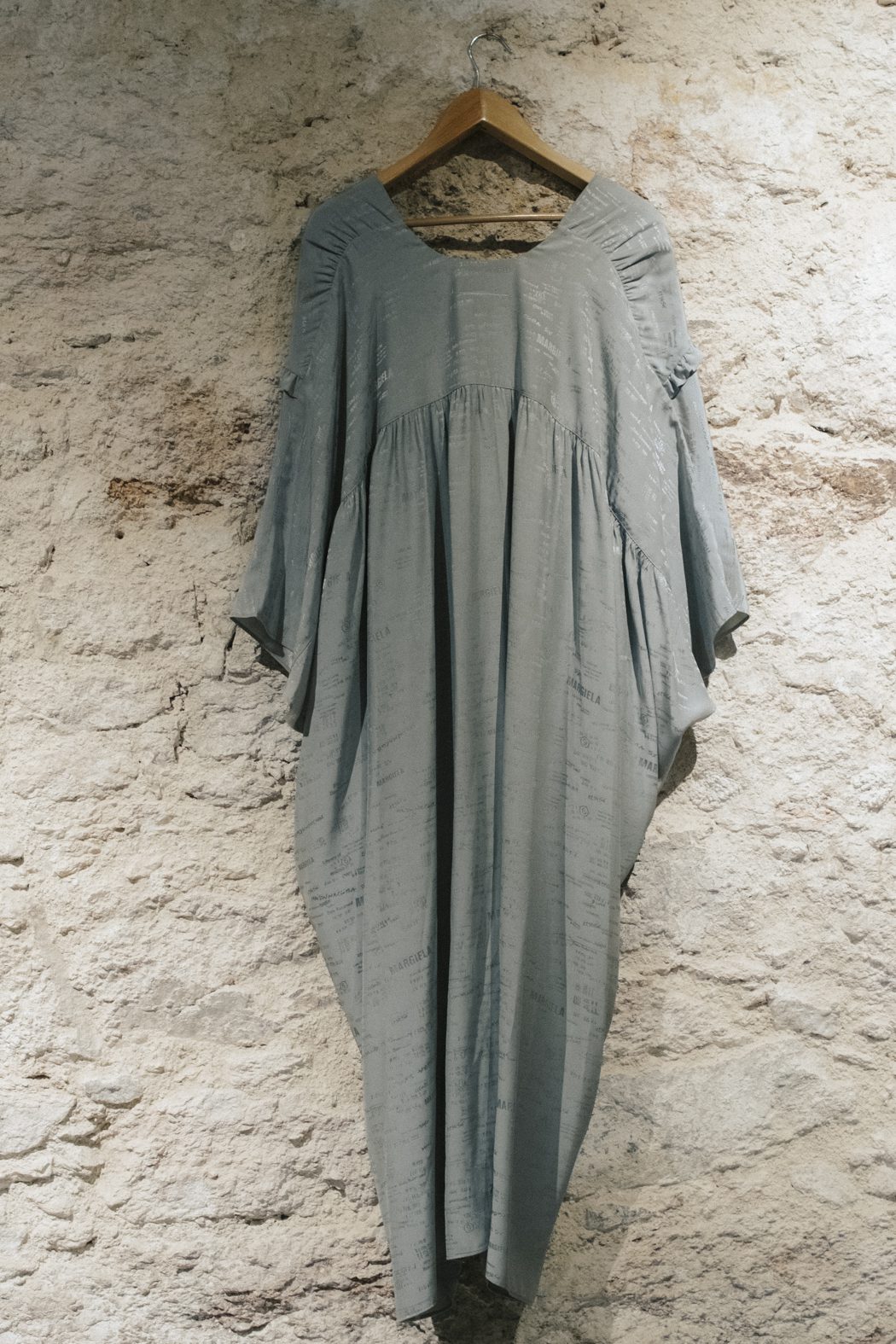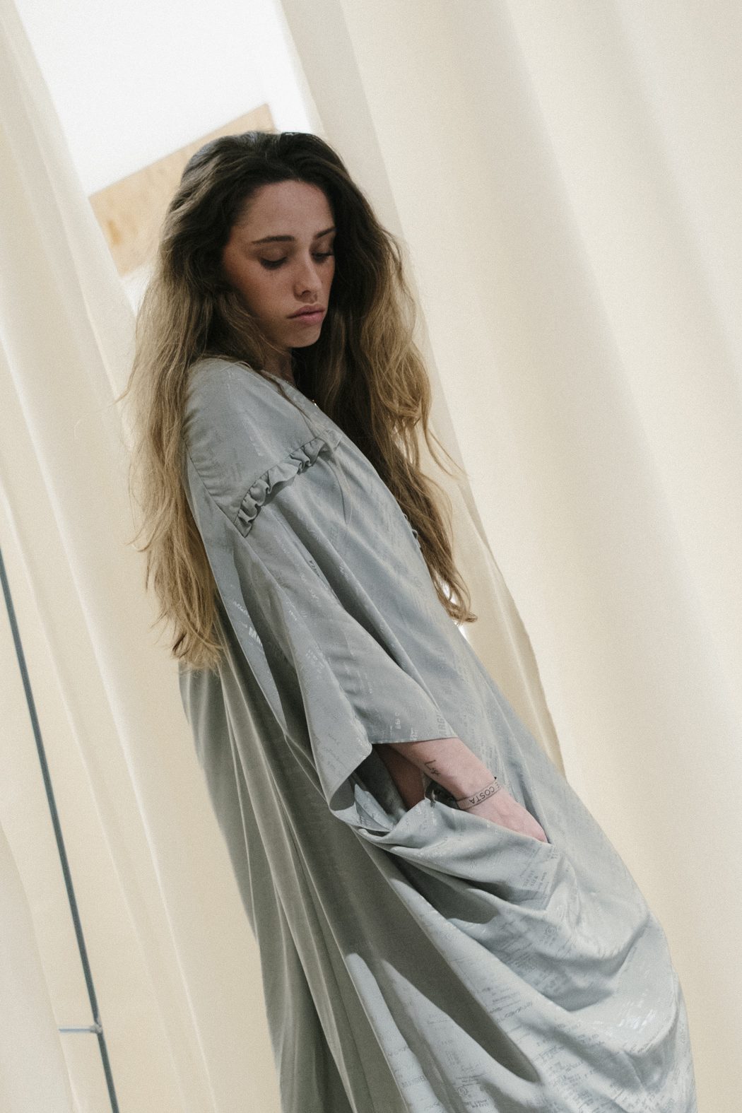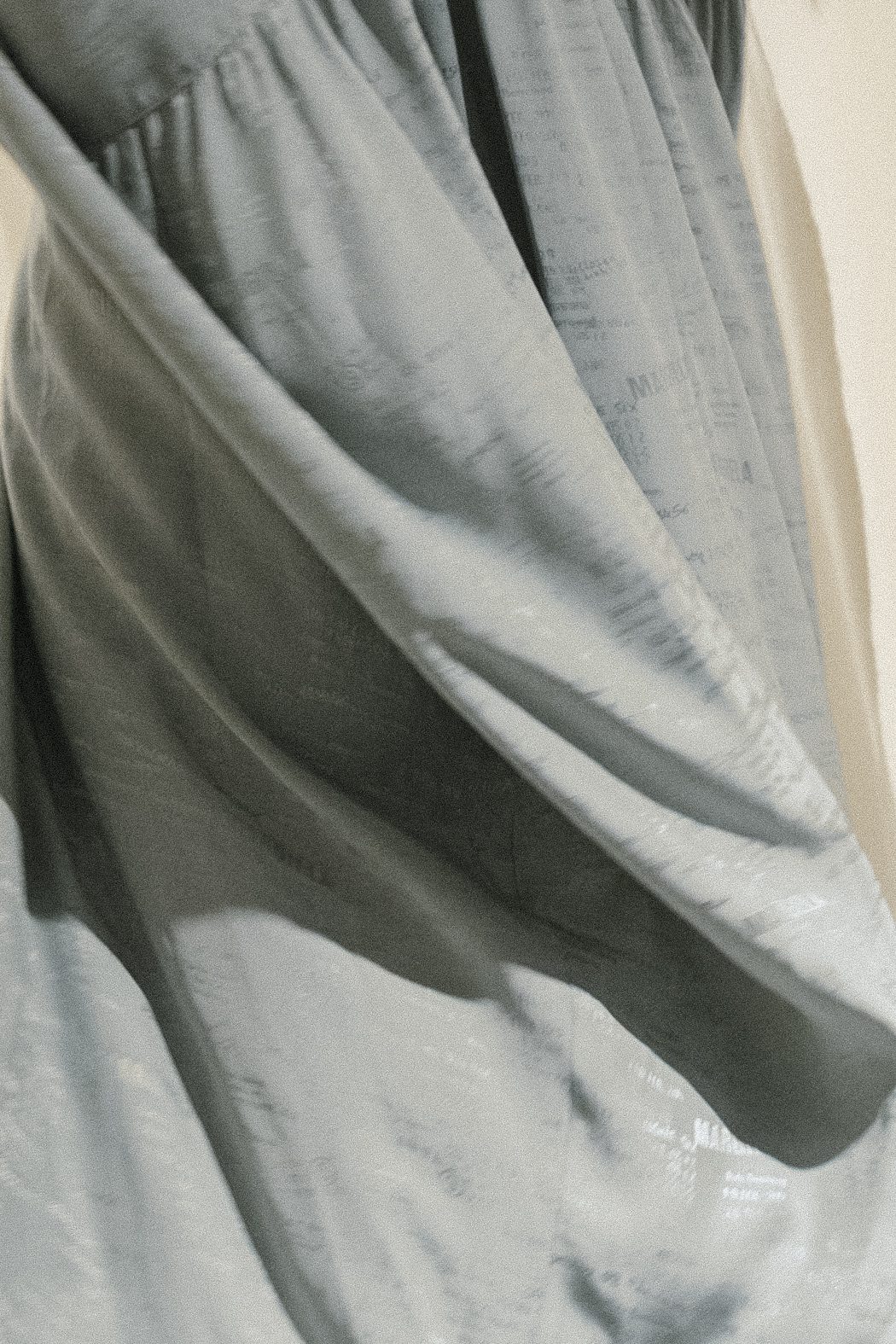 Tejido texturizado gris con relieve sutil (58% acetato, 42% viscosa).