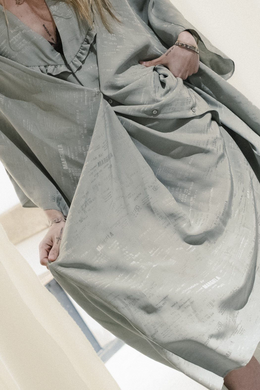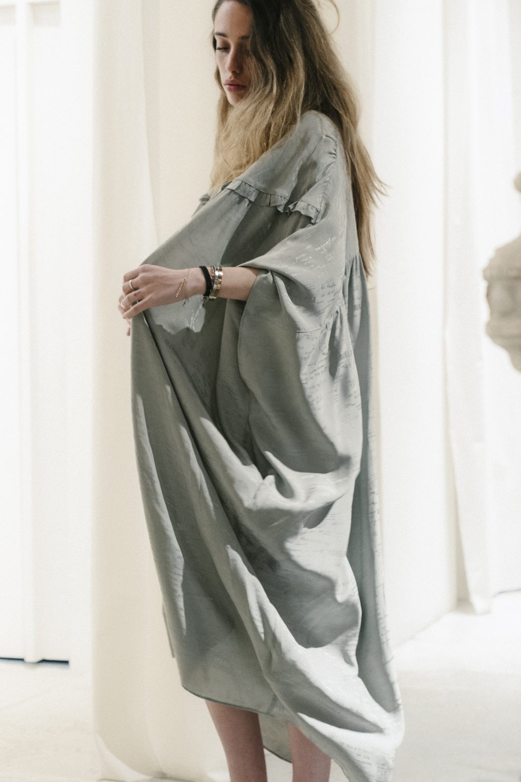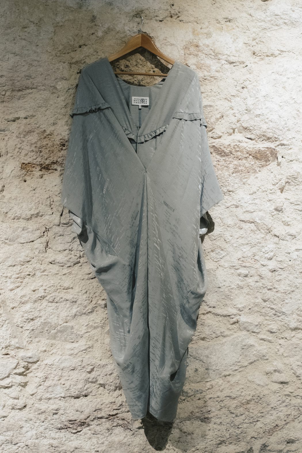 Tejido texturizado gris con relieve sutil (58% acetato, 42% viscosa).