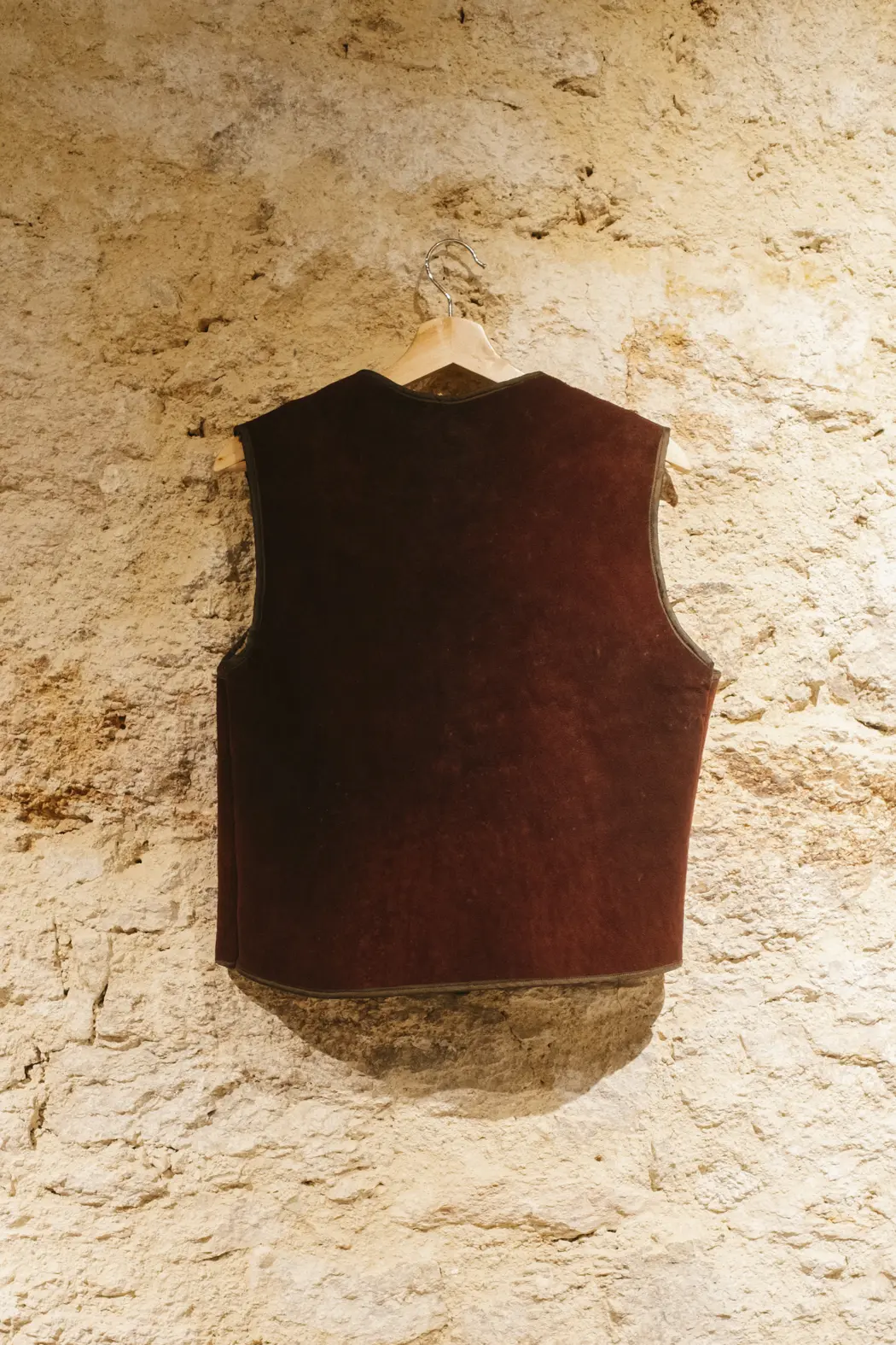 Este chaleco Vintage forma parte de nuestra colección de piezas únicas: prendas recuperadas que destacan por su carácter, su fabricación sólida y una estética que trasciende el tiempo. Confeccionado en piel vuelta en un profundo tono burdeos, presenta una textura rica y mate que se realza con el paso de los años, manteniendo una presencia contundente y elegante.