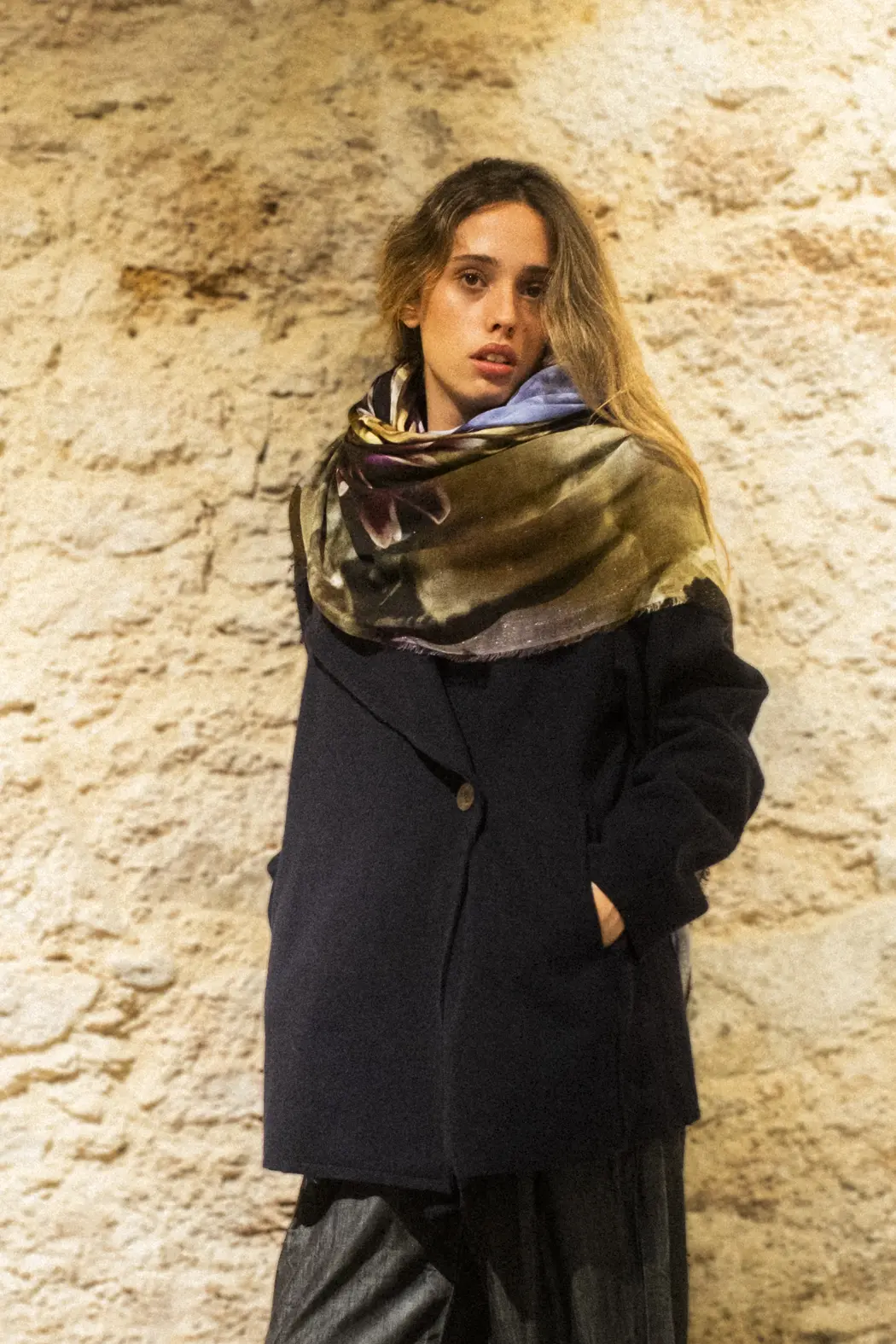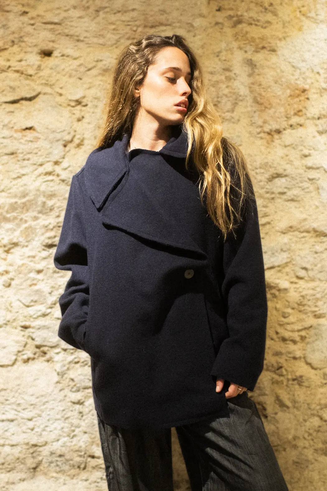 Presenta un amplio cuello sastre y cierre cruzado con un botón, realzado por acabados de bordes al corte que le dan un aire artesanal y moderno.