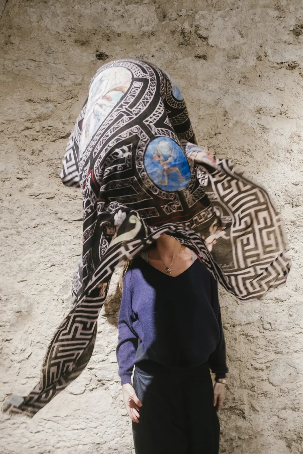 La estola Labirinto, realizada en colaboración con el artista y arquitecto florentino Paolo Fiumi, es una pieza única que combina arte, mitología y simbolismo.