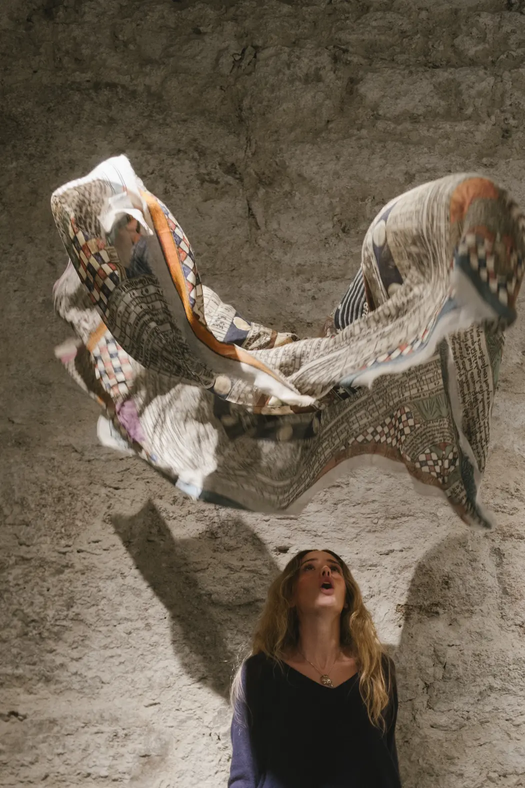 Su diseño, inspirado en la simbología del mandala, despliega una estampa geométrica circular de gran riqueza visual, en tonos neutros que evocan equilibrio y armonía.