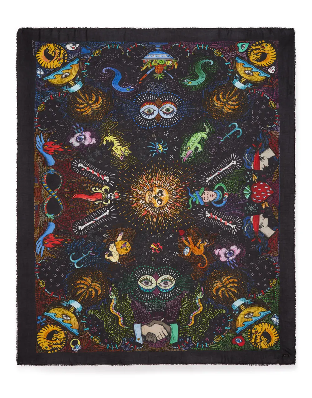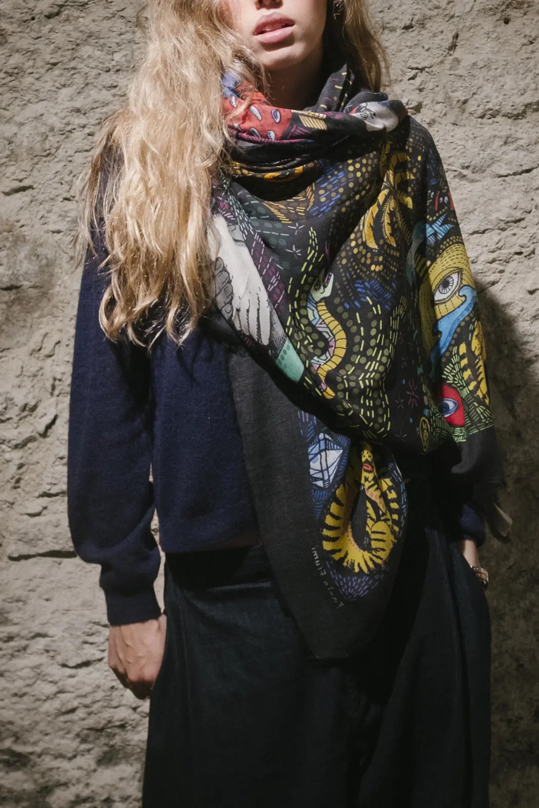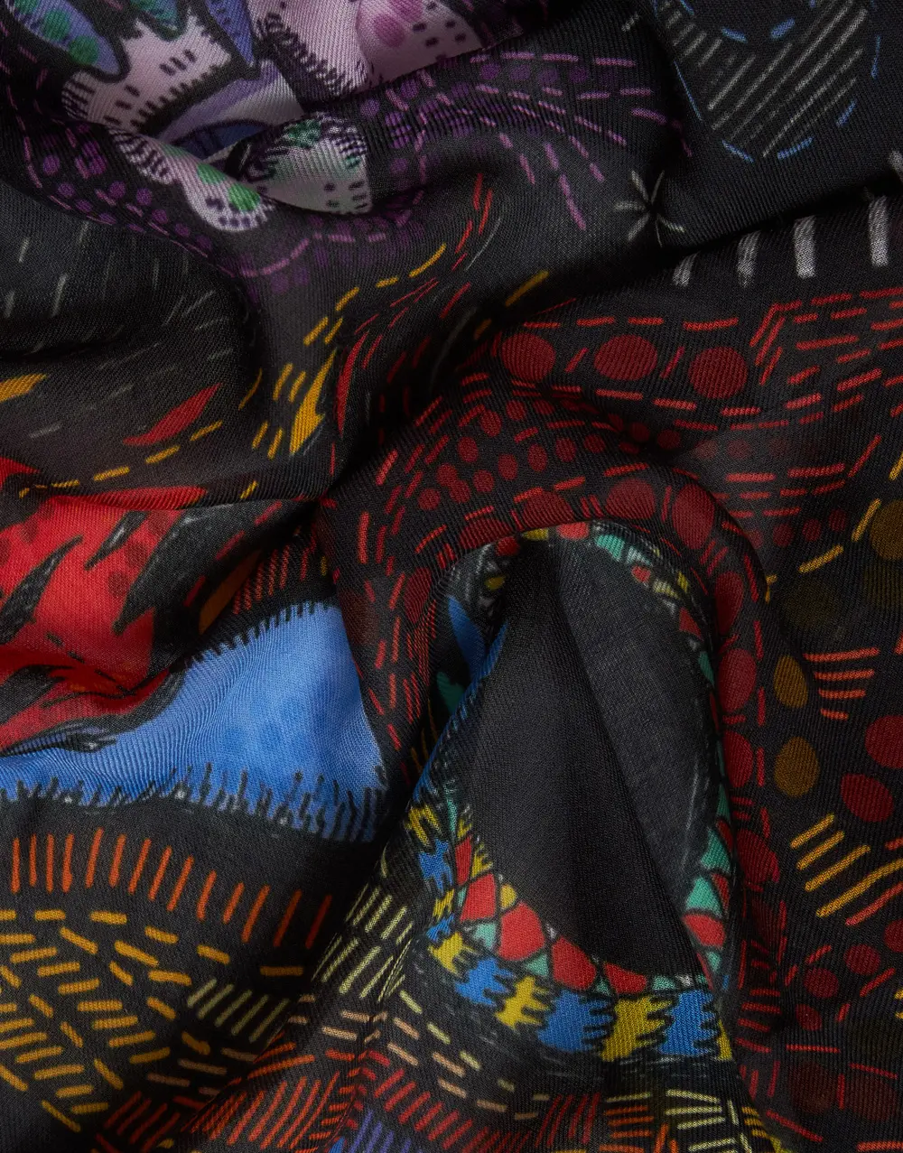Confeccionada en modal (90%) y cachemira (10%), destaca por su base negra intensa, sobre la que se despliegan ilustraciones multicolor de gran fuerza expresiva.