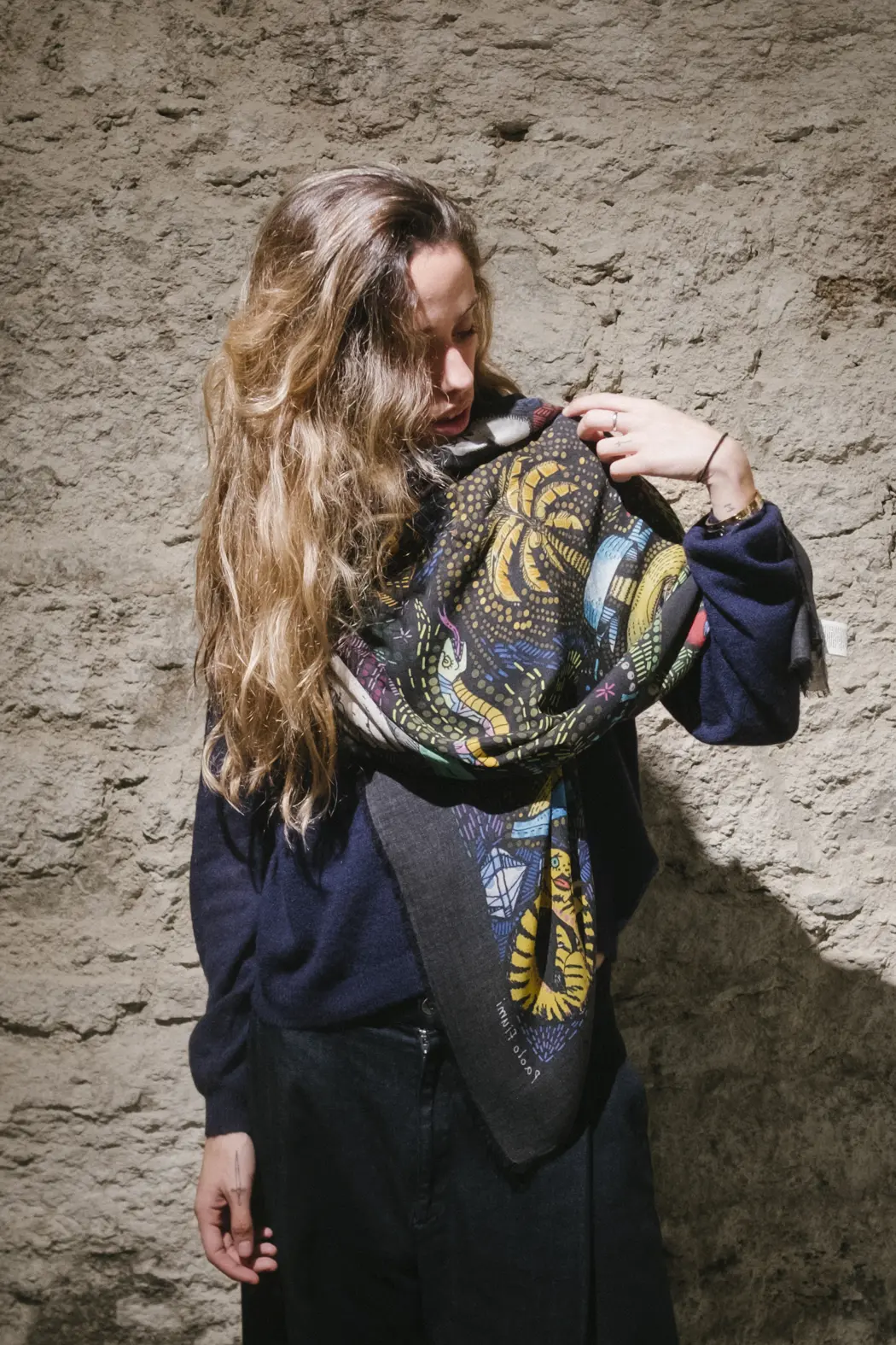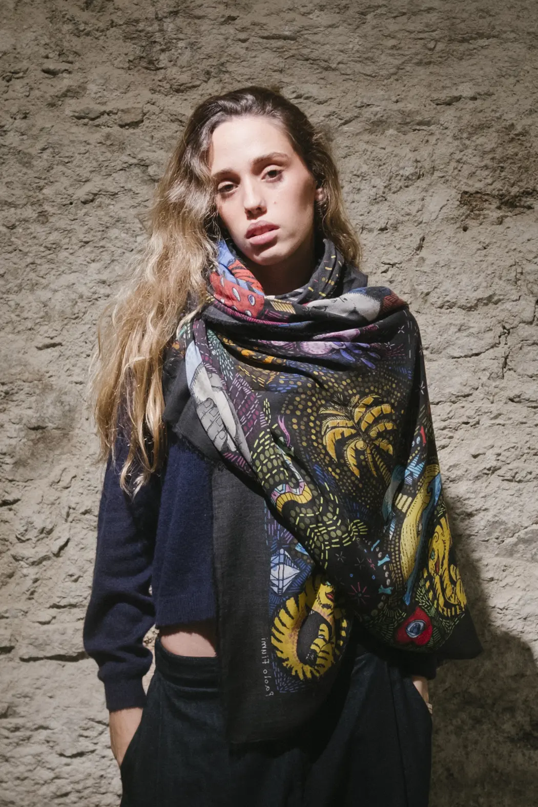 Realizada en colaboración con el artista y arquitecto florentino Paolo Fiumi, la estola Profeta se presenta como una pieza única donde el arte se funde con el textil.