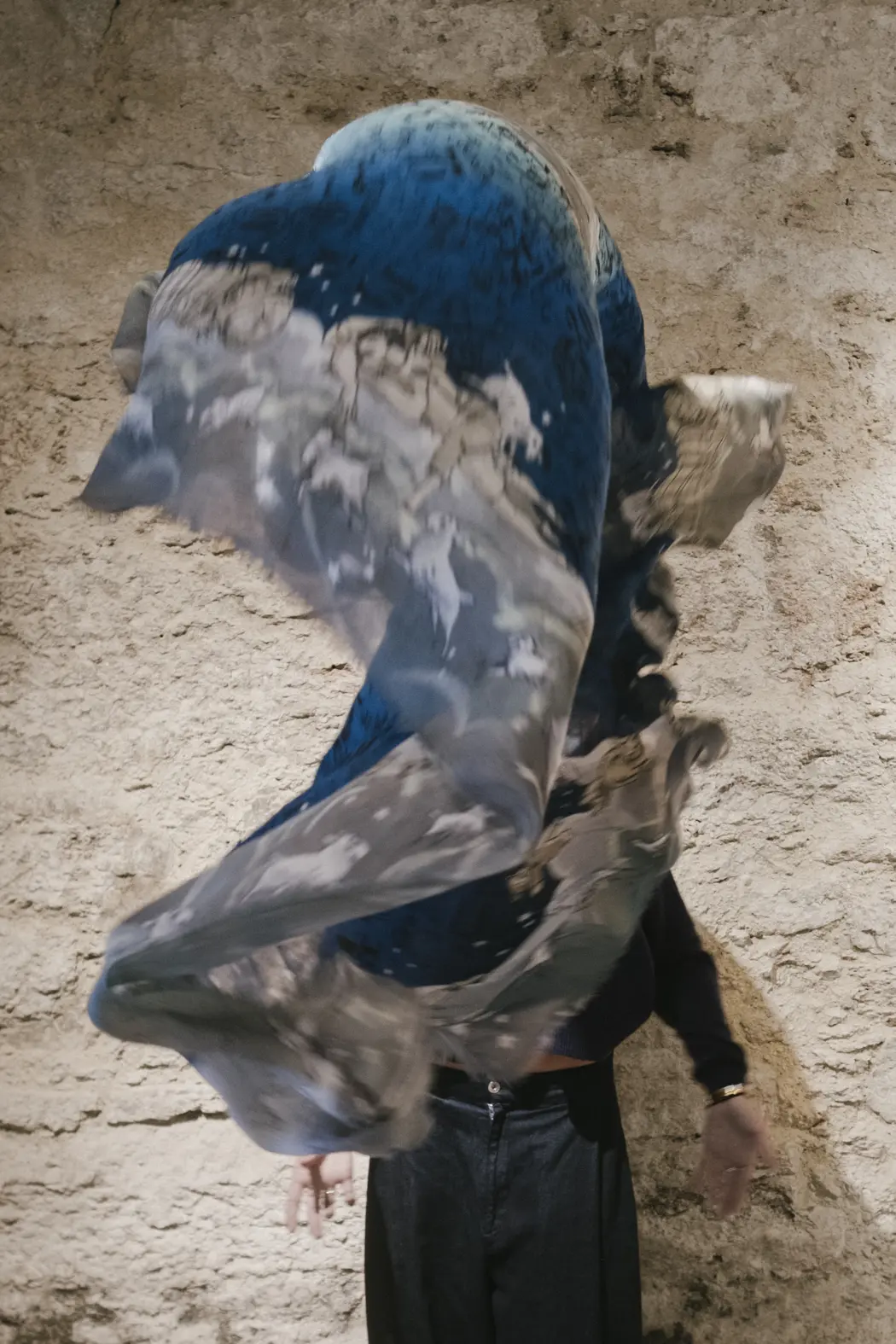 La estola Sweet Dreams, creada en colaboración con el artista y arquitecto florentino Paolo Fiumi, nos sumerge en un universo onírico lleno de símbolos y evocaciones poéticas.
