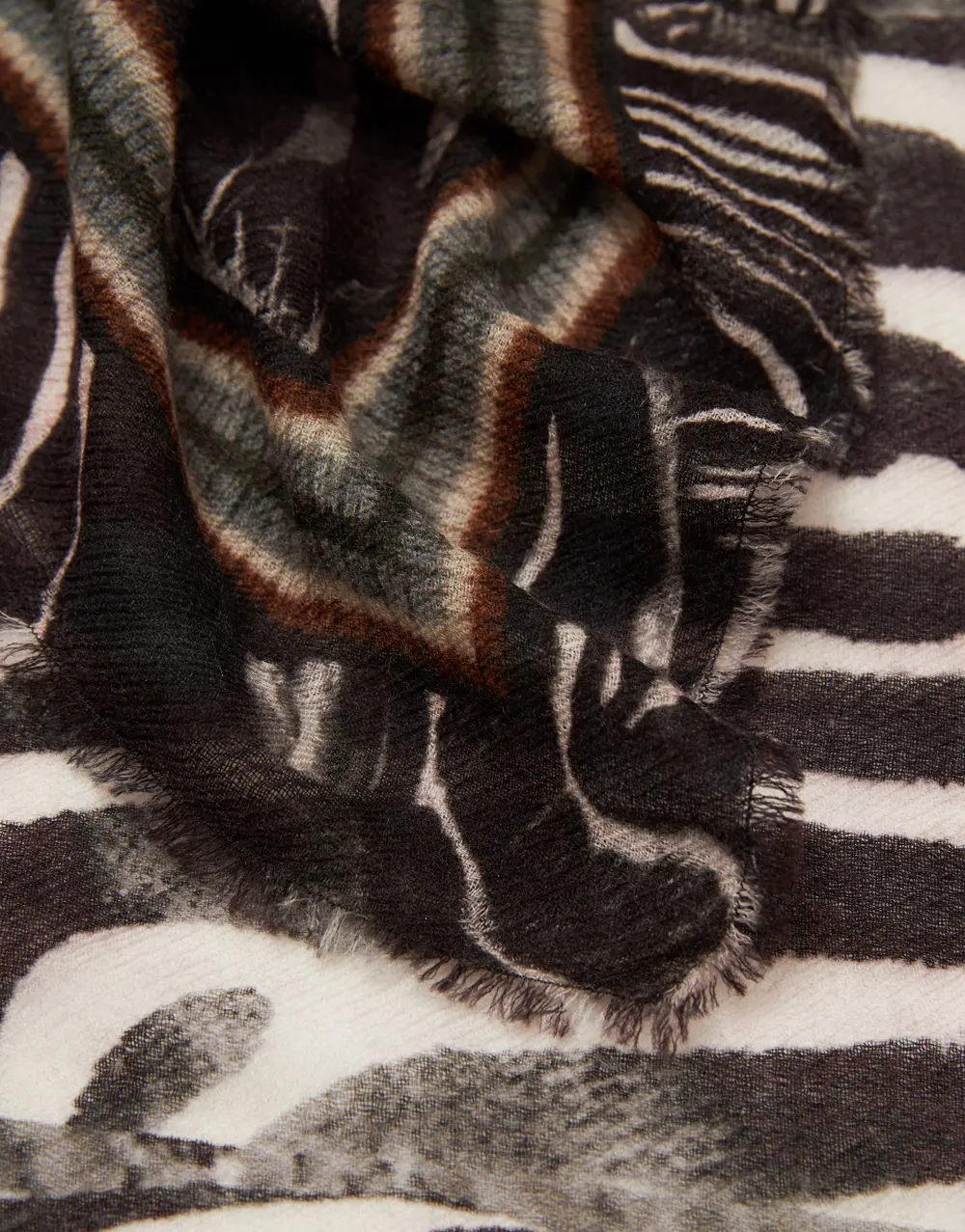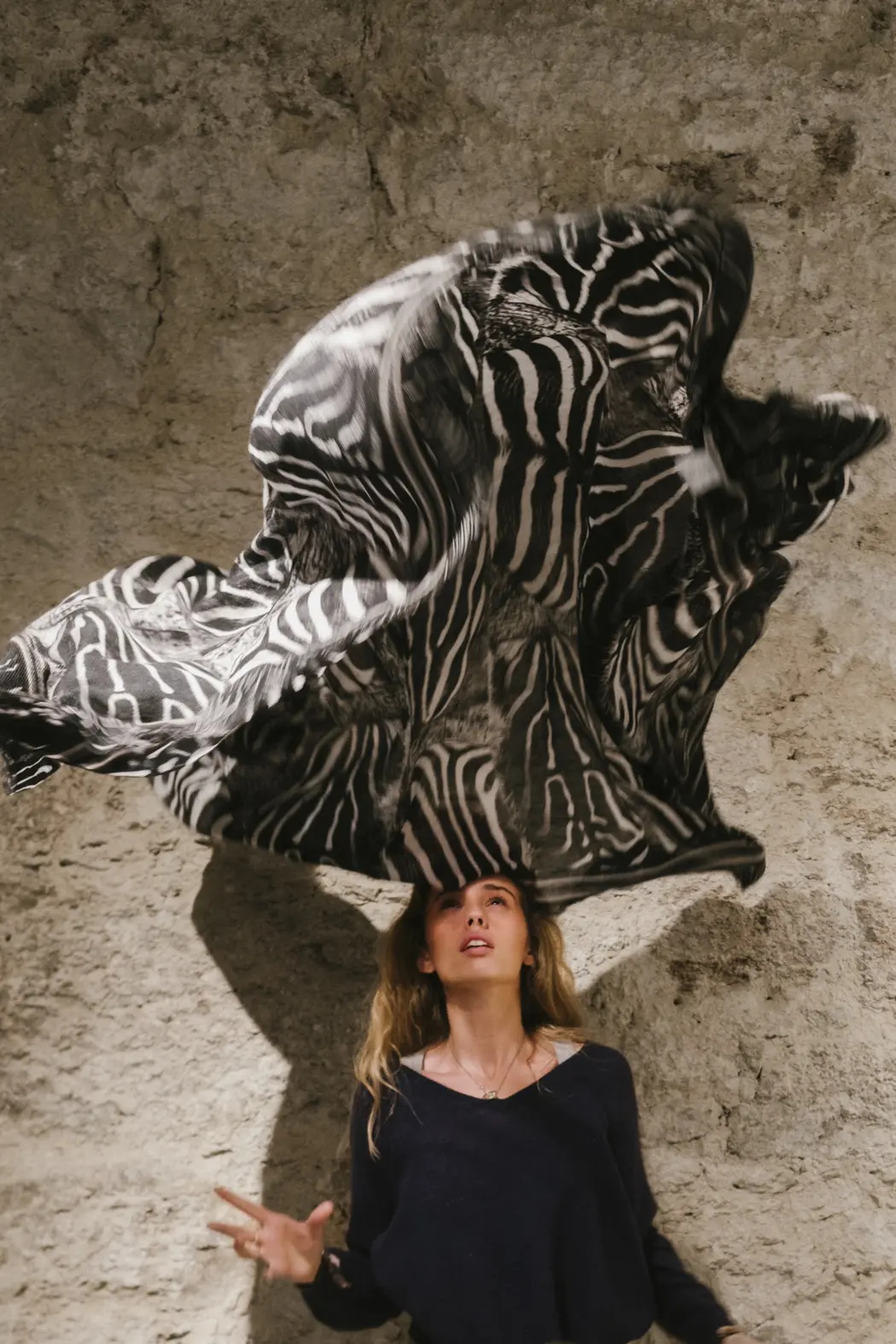 La estola Zebra surge de la colaboración con el Peter Beard Studio, tomando como referencia la obra Zebra Carpet del artista americano (1960).