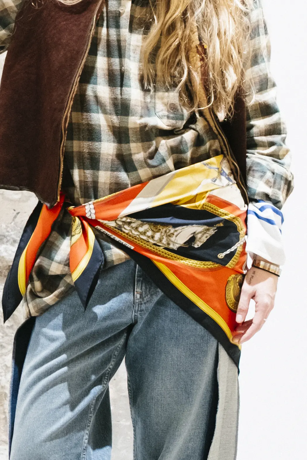 Perfecto sobre camisas masculinas, prendas denim o abrigos estructurados. Anudado a la cintura —como en nuestra editorial— aporta un gesto fresco y contemporáneo; al cuello, se convierte en un acento clásico y atemporal.