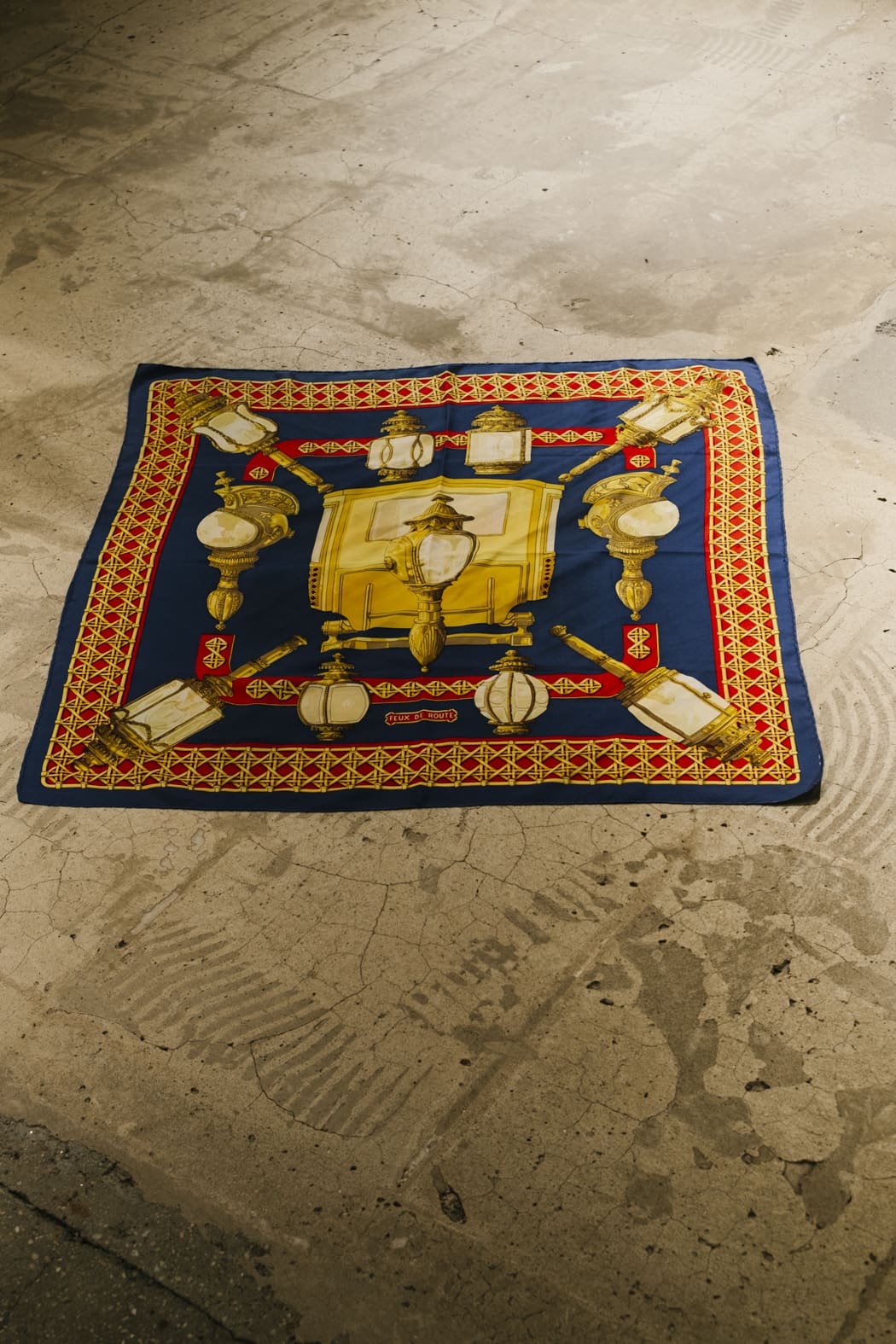 Un clásico eterno de la casa Hermès. Este Carré vintage destaca por su diseño majestuoso centrado en faroles y detalles ornamentales, un homenaje al universo ecuestre y a la artesanía tradicional francesa. La composición combina un fondo azul profundo con ilustraciones en tonos dorados y una cenefa geométrica en rojo y amarillo que enmarca la pieza con fuerza y armonía.