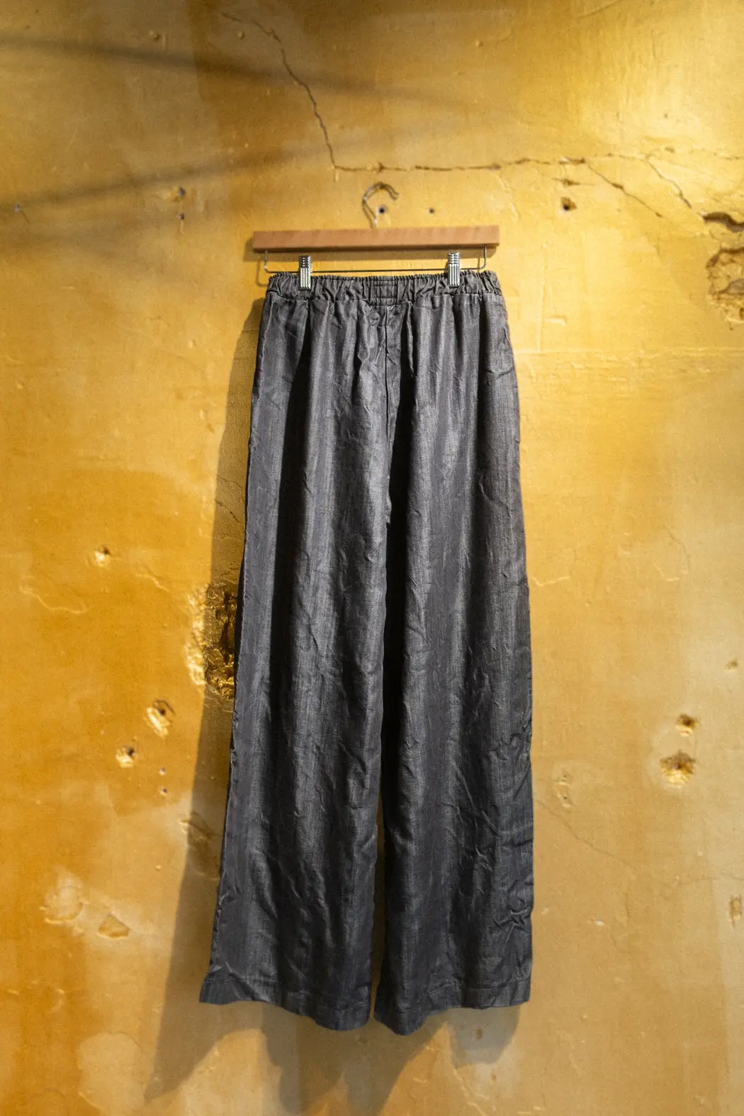 Pantalón de corte amplio confeccionado en 100% Tencel, un tejido fluido y ligero con un brillo natural. Diseñado con cintura elástica de 5 cm para mayor comodidad, incorpora dos pinzas en la parte delantera que aportan estructura y dos bolsillos laterales funcionales.