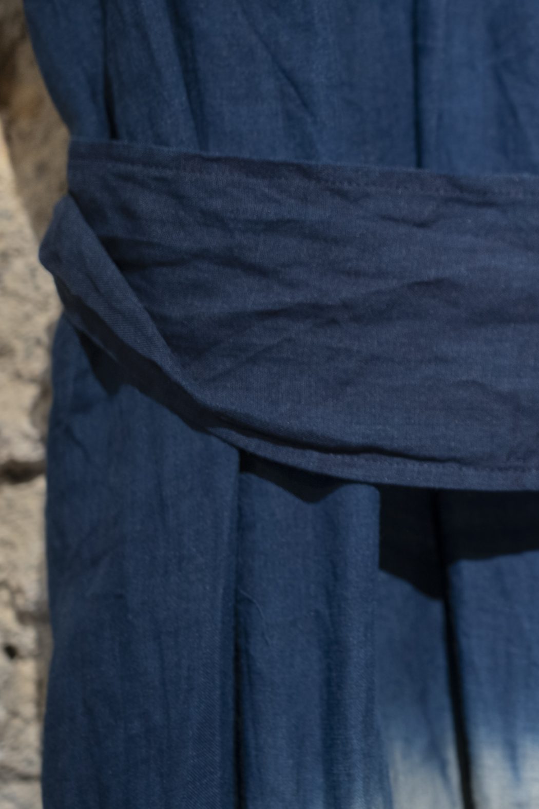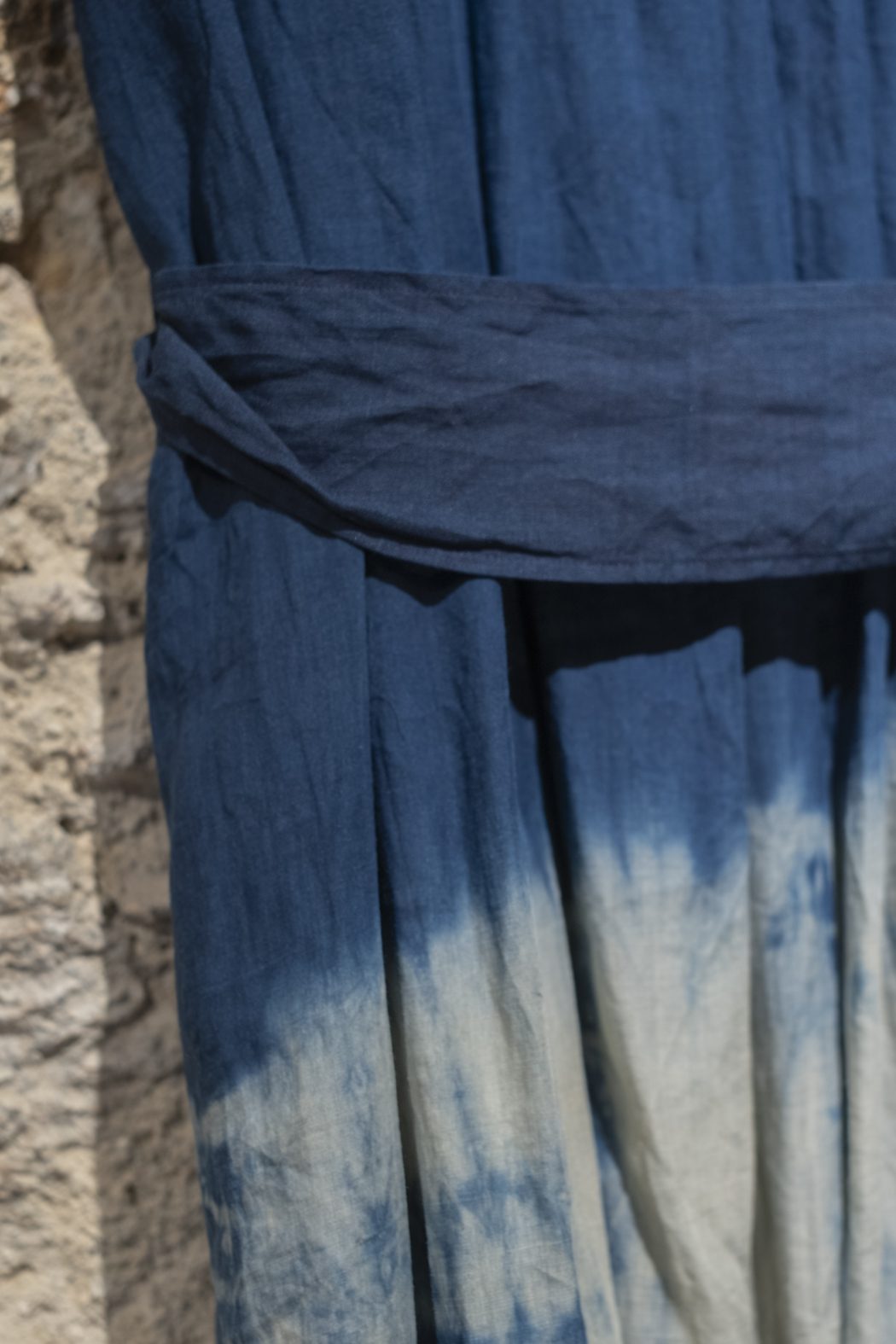 Teñido a mano con técnica tradicional yanagi shibori (tinte de sauce japonés) usando té bancha, myrobalan y tinta sumi.