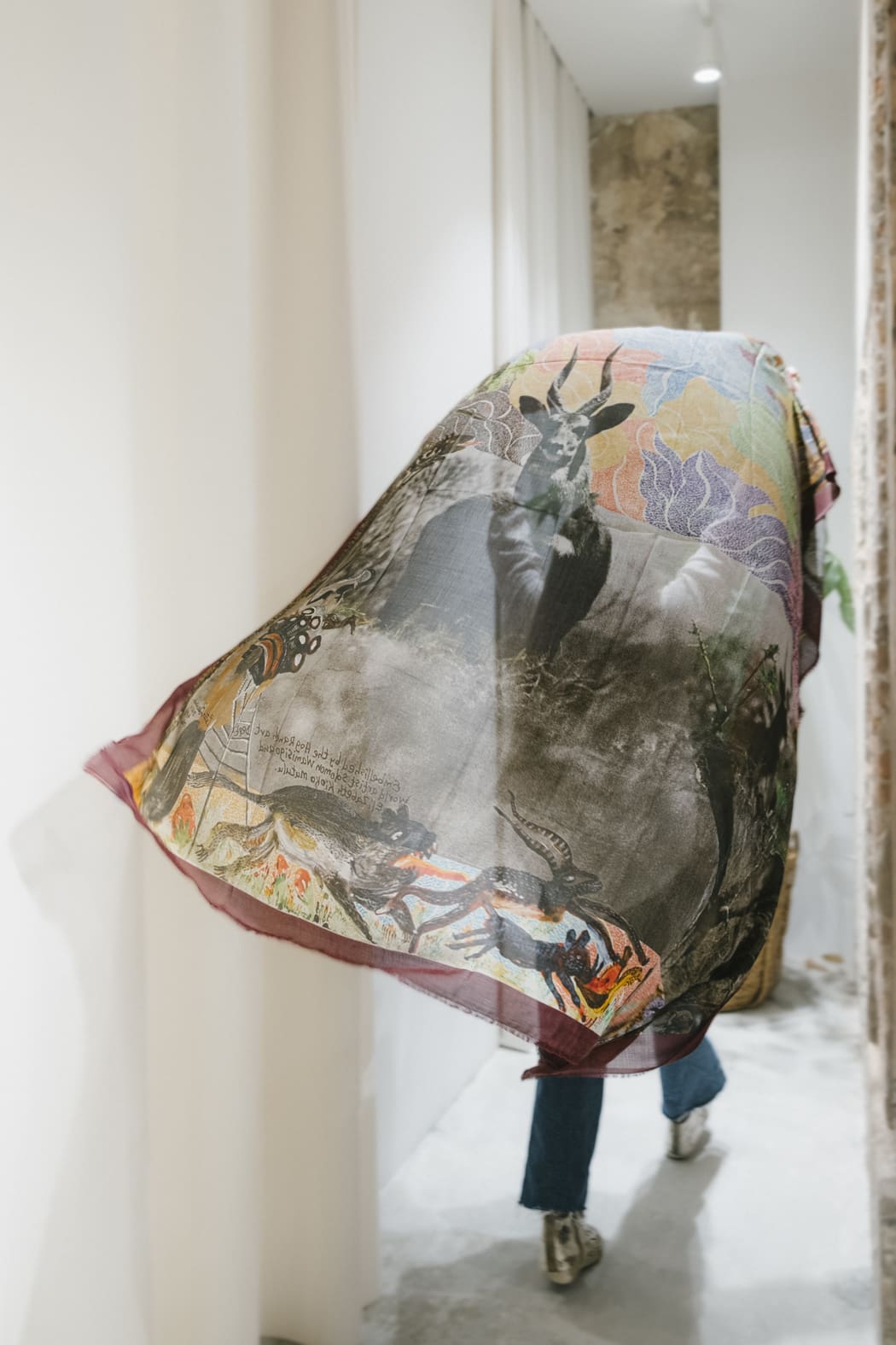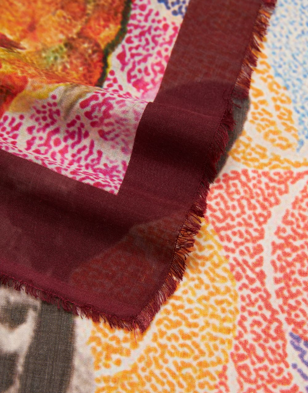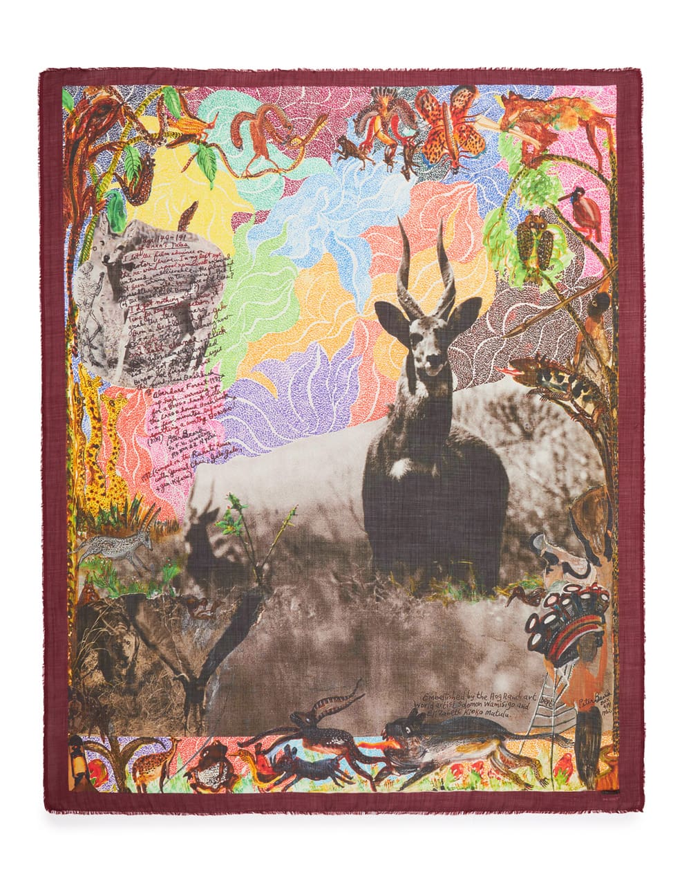 Expresión de la pasión de Peter Beard por África, los animales y la naturaleza. La estola Bushbuck está basada en la obra Large Horned Bushbuck de 1975, enmarcada por un borde burdeos y enriquecida con elementos artísticos que dibujan una imagen aventurera. Las fibras de seda hacen del accesorio una noble obra de arte textil.