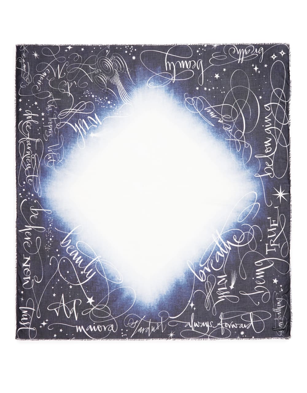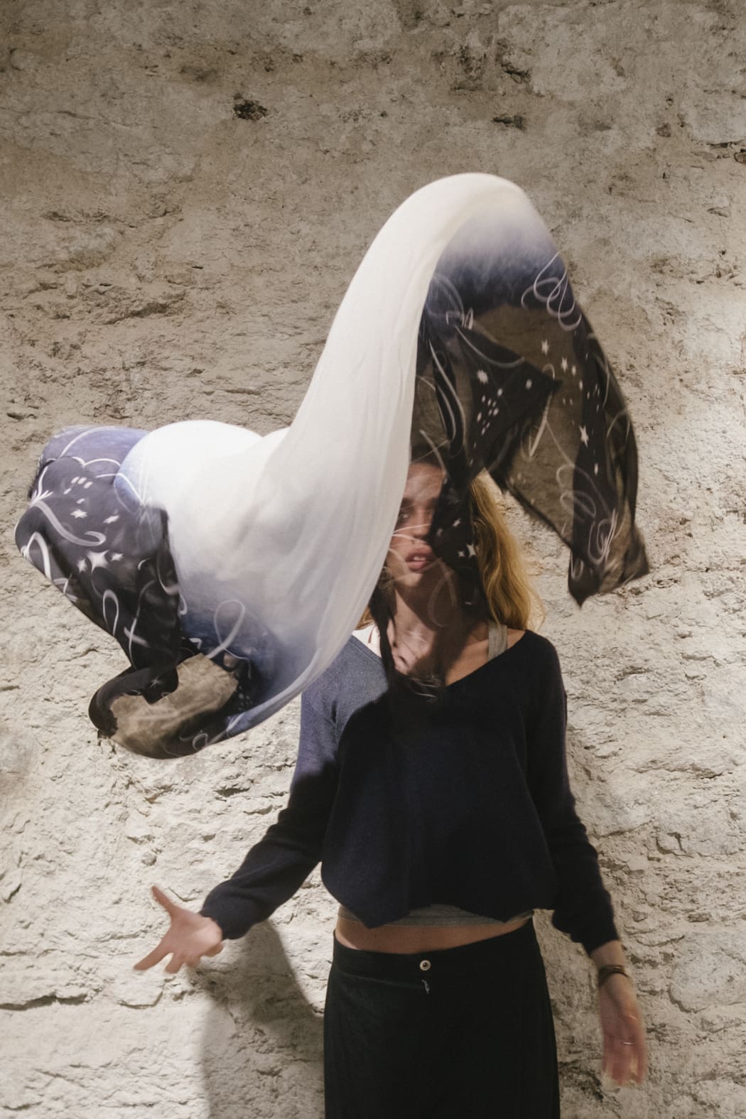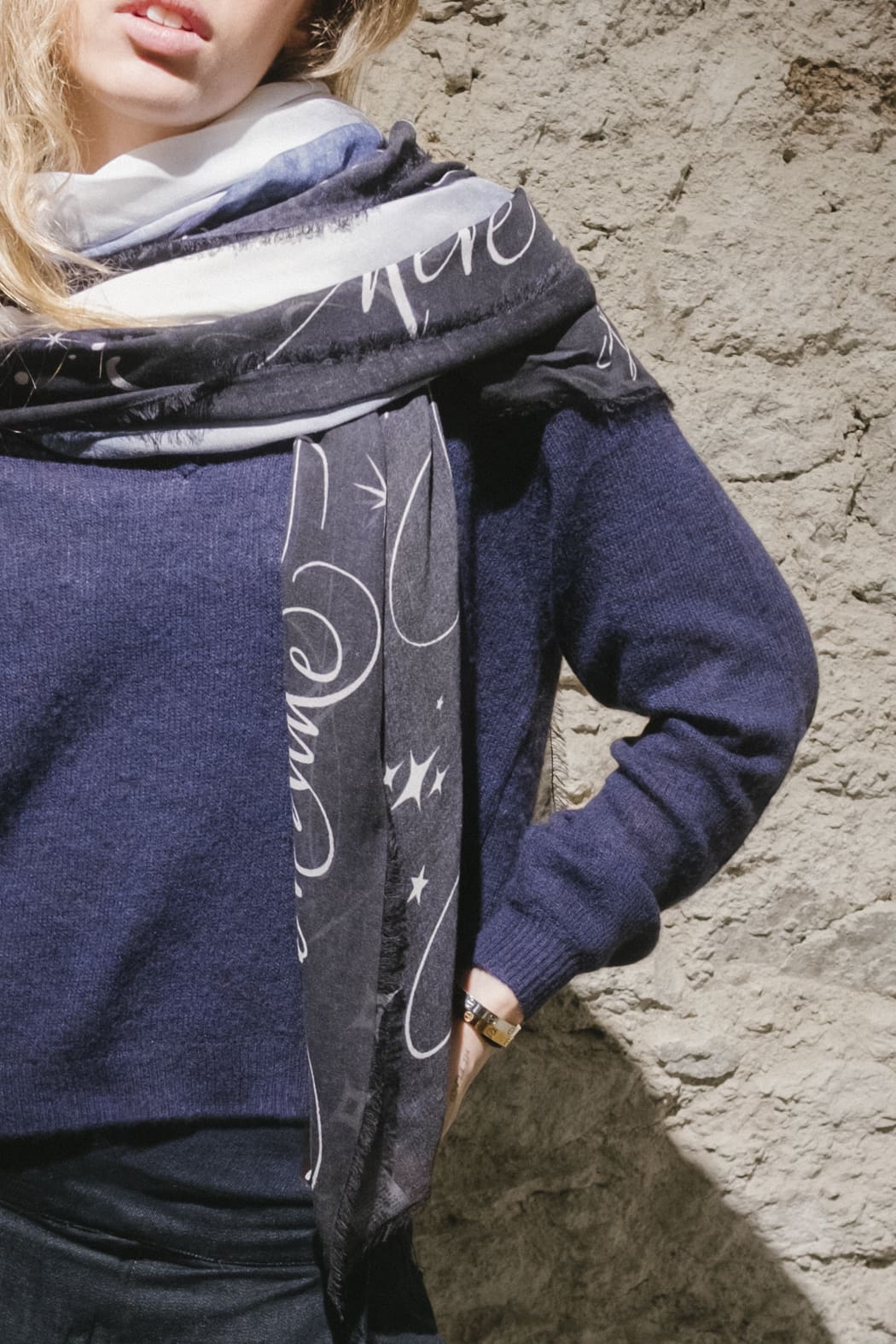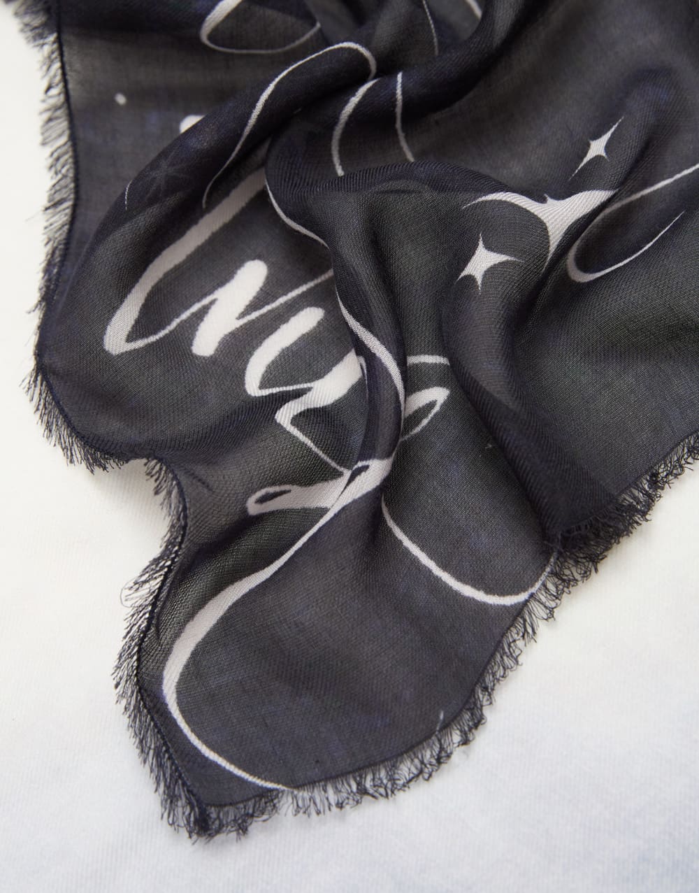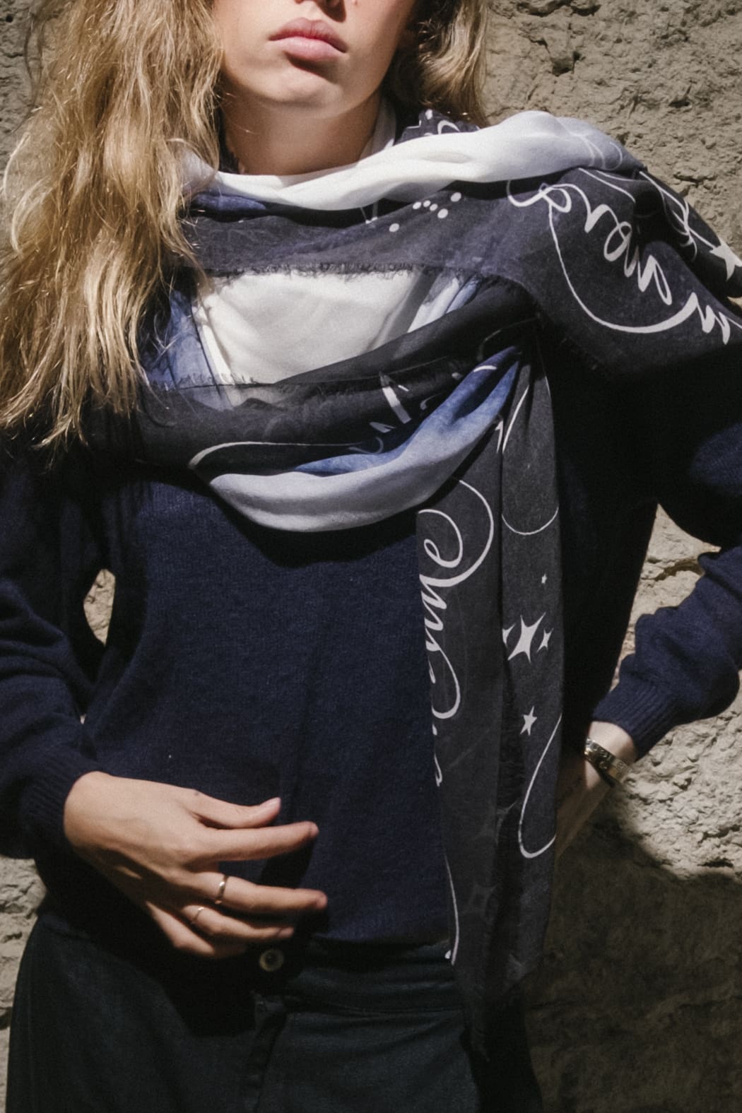 La estola Illumina nace de la colaboración con Betty Soldi, estudio de diseño visual y visionario que trabaja con palabras, flores e imágenes. Inspirada en el pensamiento creativo renacentista, la pieza presenta dibujos caligráficos artísticos que evocan poesía y profundidad de significado.