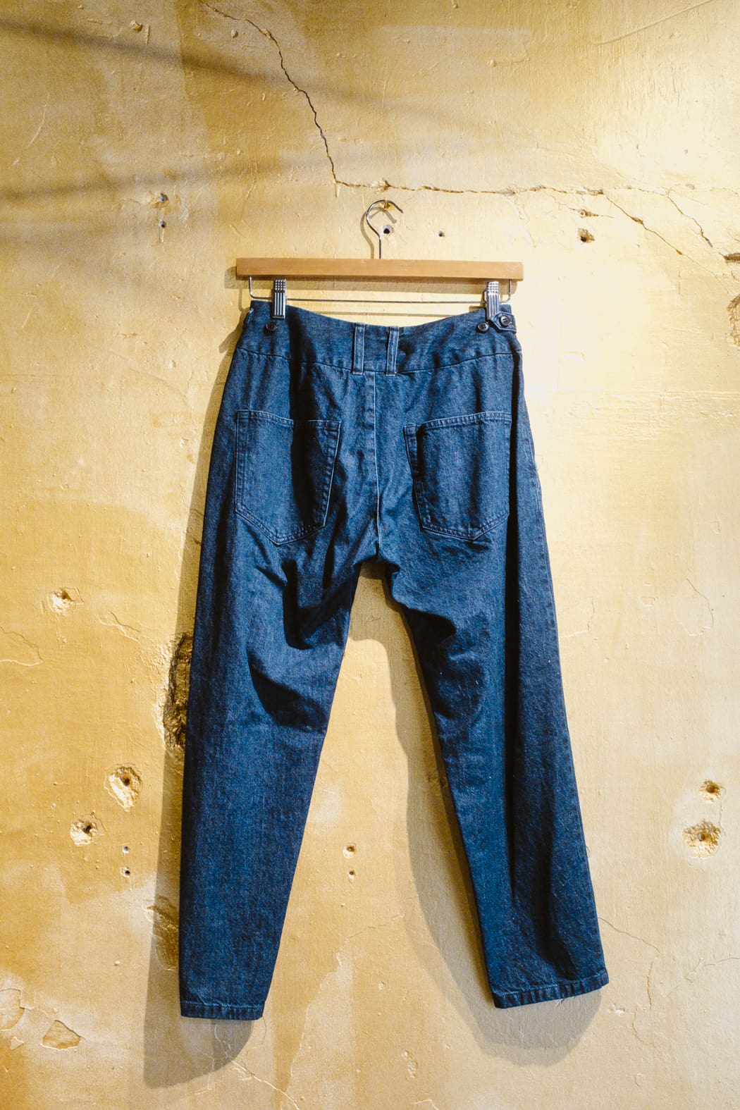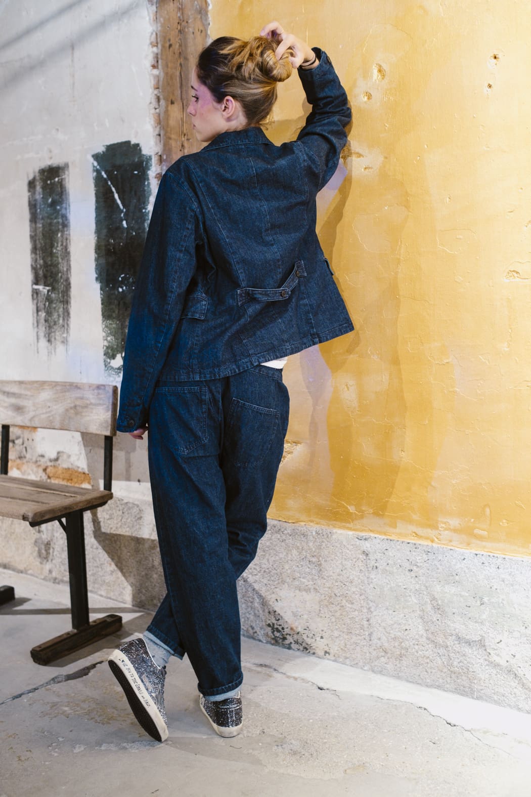 Confeccionados en denim natural, estos pantalones combinan comodidad y estilo con la elegancia relajada propia de la firma. Presentan un corte recto ligeramente afilado, pliegues sutiles en la parte frontal y cierre con botones, logrando una silueta moderna y favorecedora. Su diseño versátil los convierte en la base perfecta para looks tanto casuales como más refinados, en perfecta sintonía con la chaqueta sastre de la misma colección.