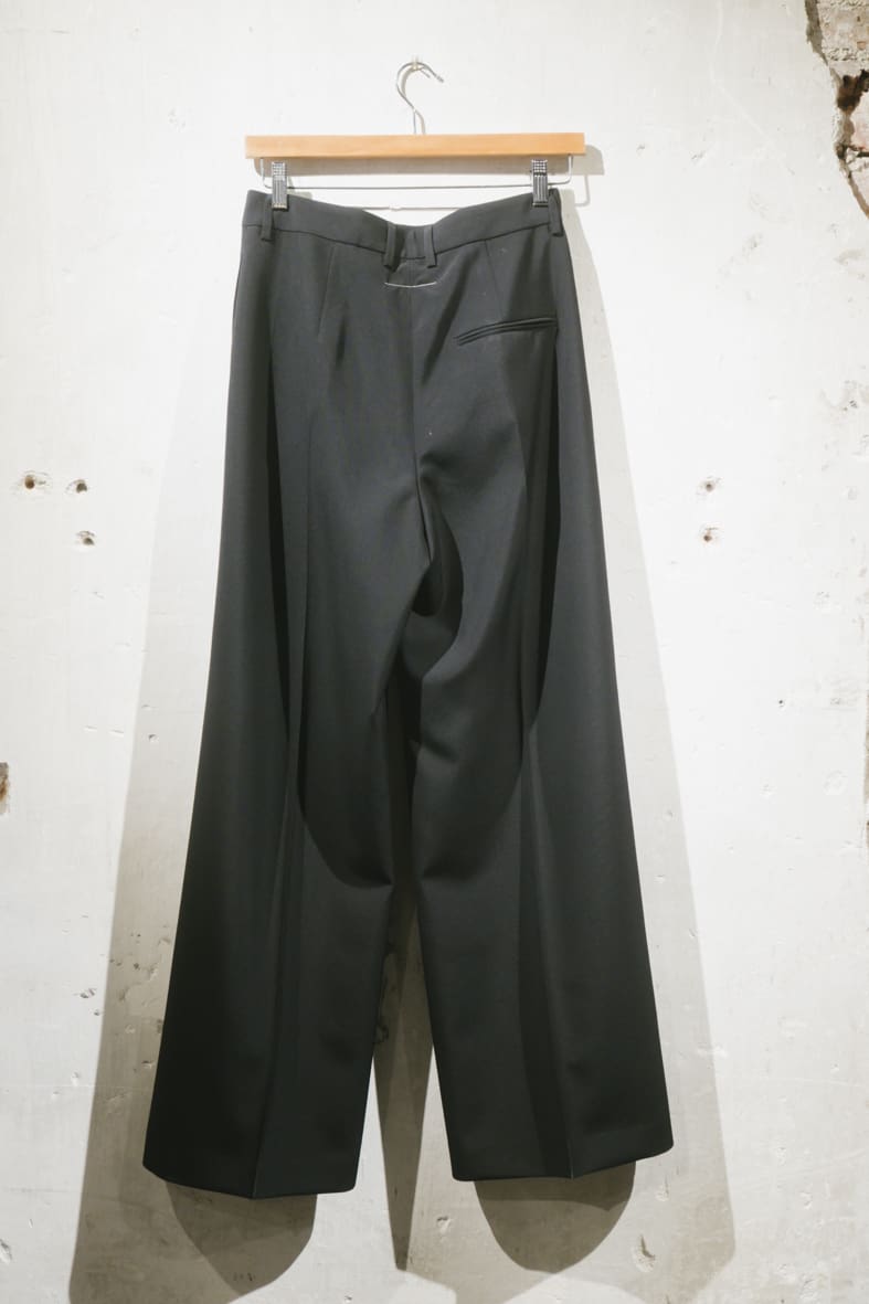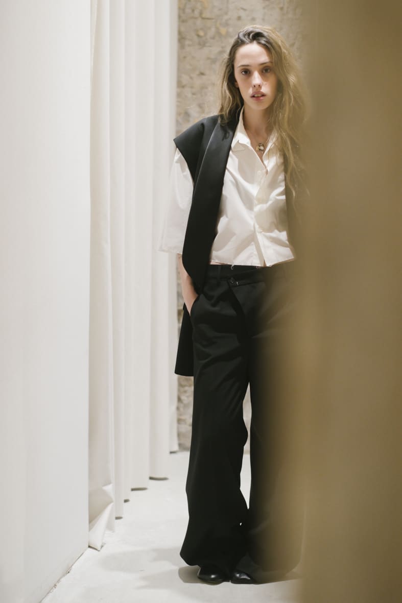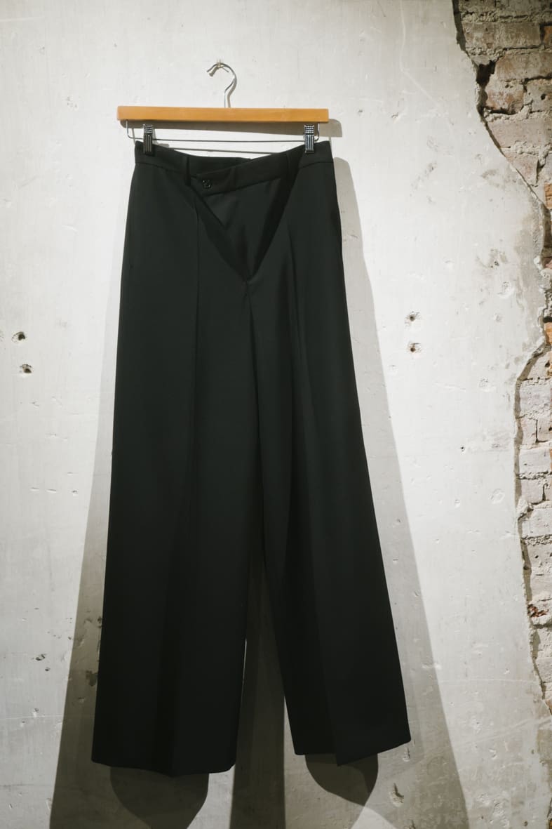 Estos pantalones de sastrería, confeccionados en una fina mezcla de lana, introducen pequeñas alteraciones en una forma de por sí familiar. El cierre cruzado de botones se sale de lo convencional, mientras que las trabillas del cinturón afirman su carácter útil, dejando una silueta refinada que abraza el sutil desorden dentro de una sastrería atemporal.
