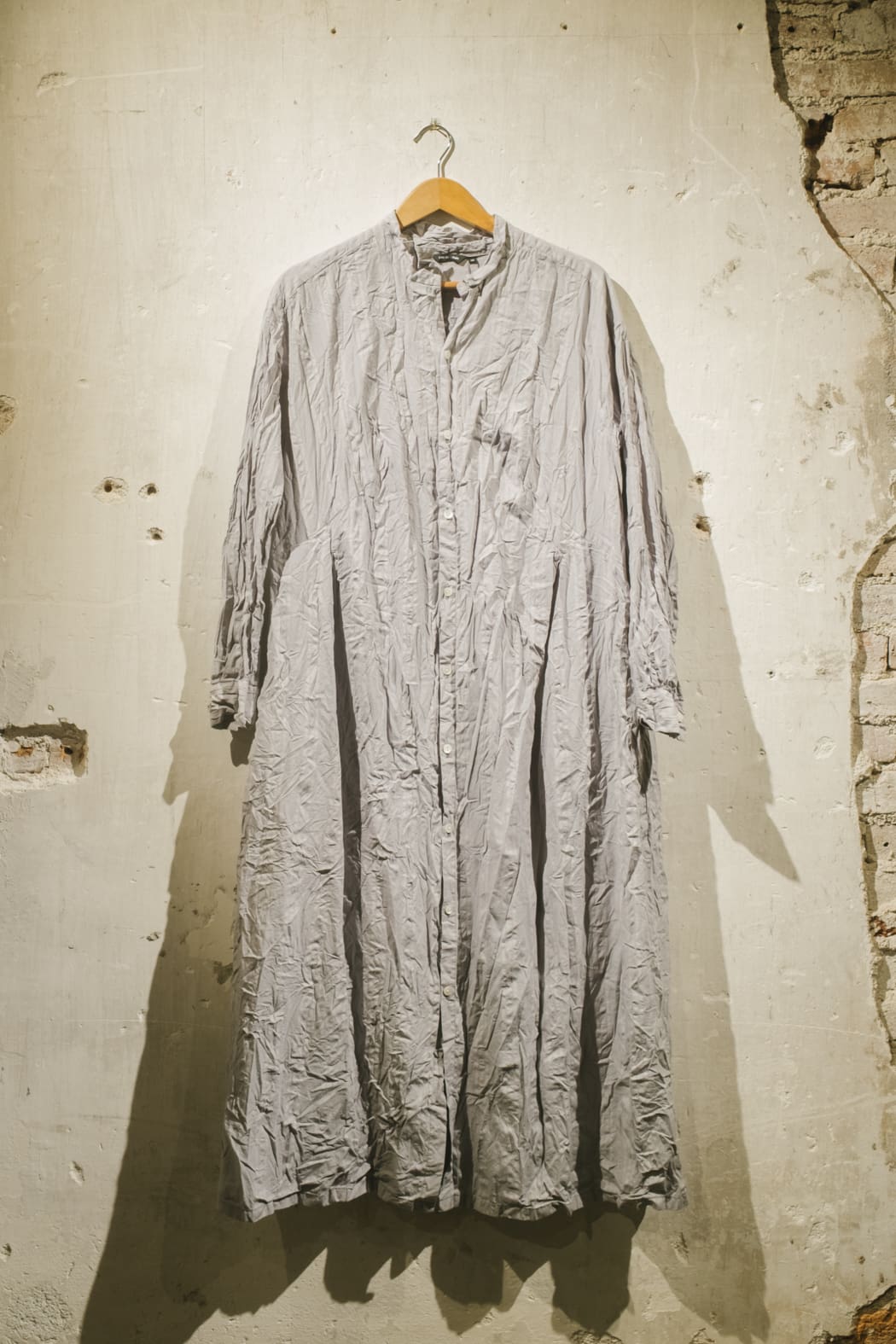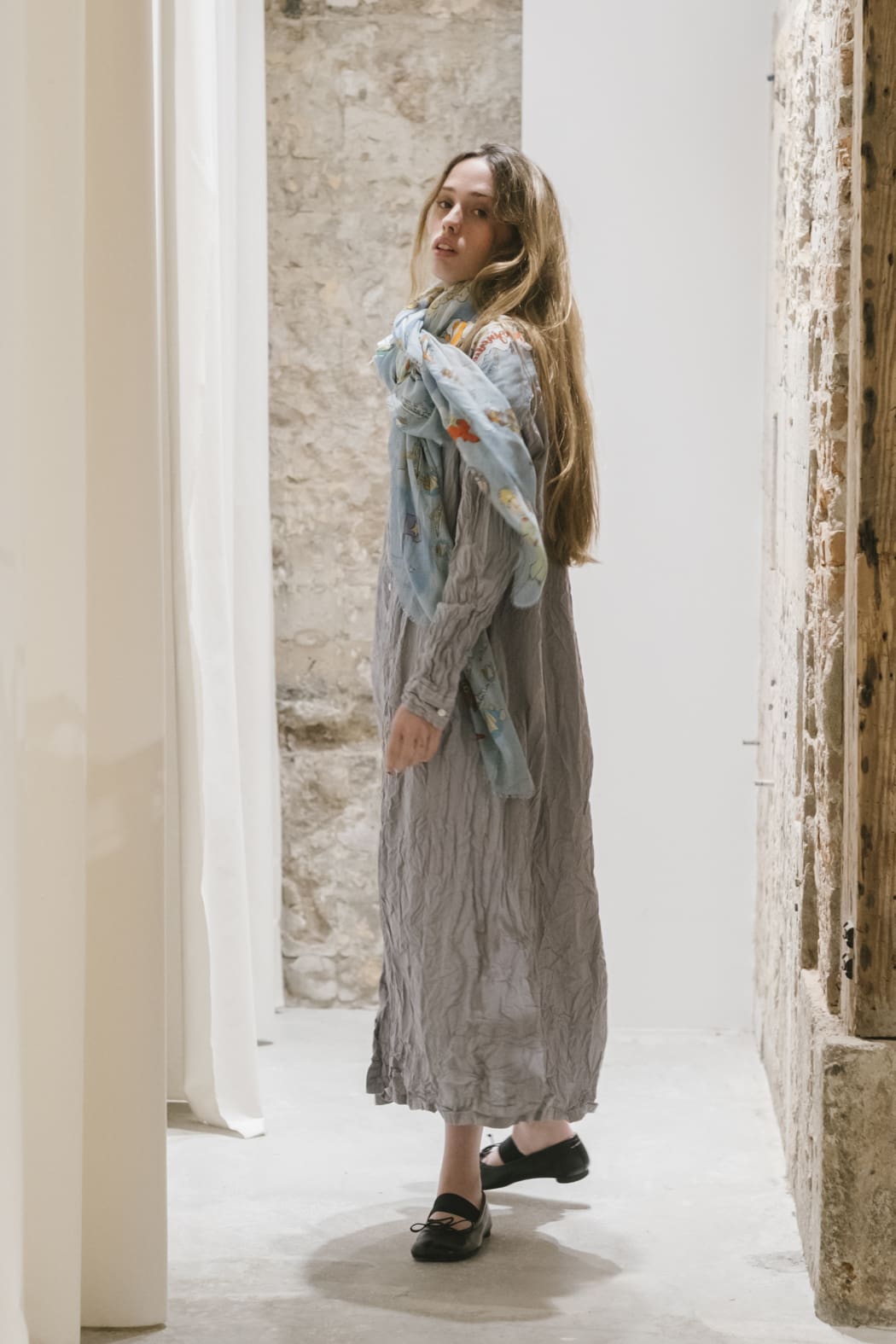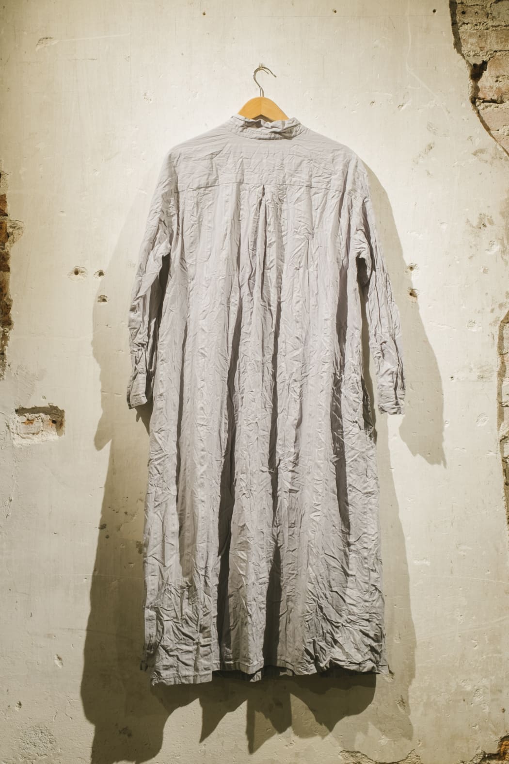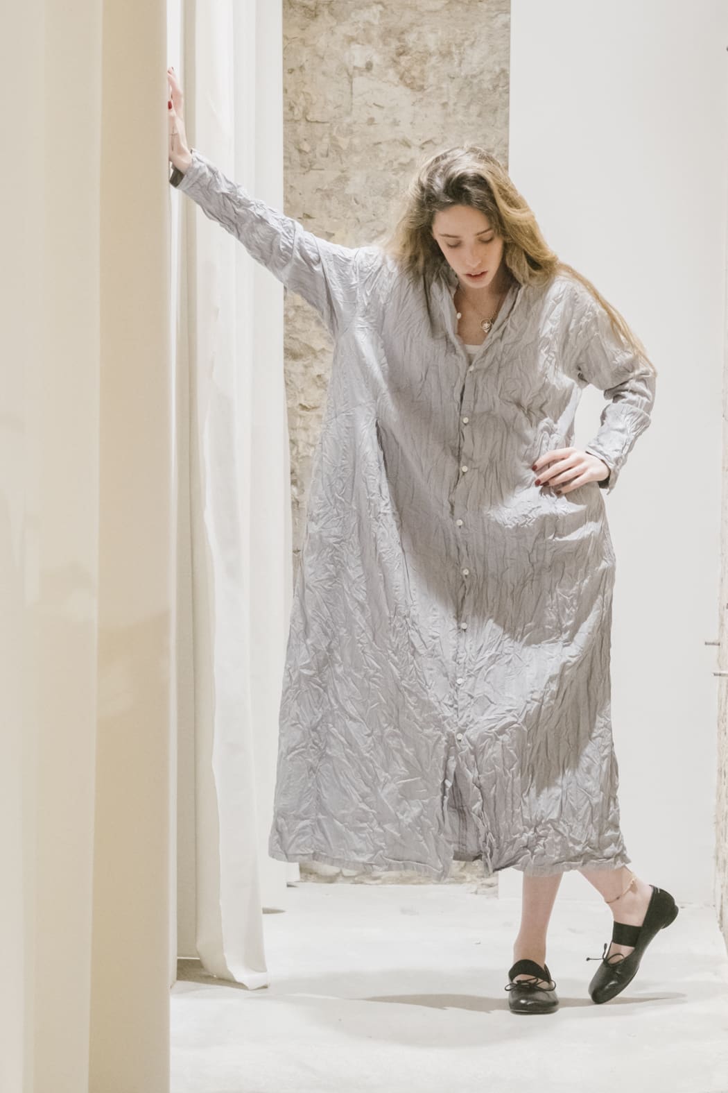 Vestido camisero de manga larga en azul Pas de Calais con dos pliegues en la cintura, confeccionado en jacquard de algodón ligero y efecto arrugado. Presenta cuello de muesca, hombros ligeramente caídos, bolsillos laterales, pliegue invertido en el canesú trasero, puños abotonados y cierre frontal con botones en tono nácar.